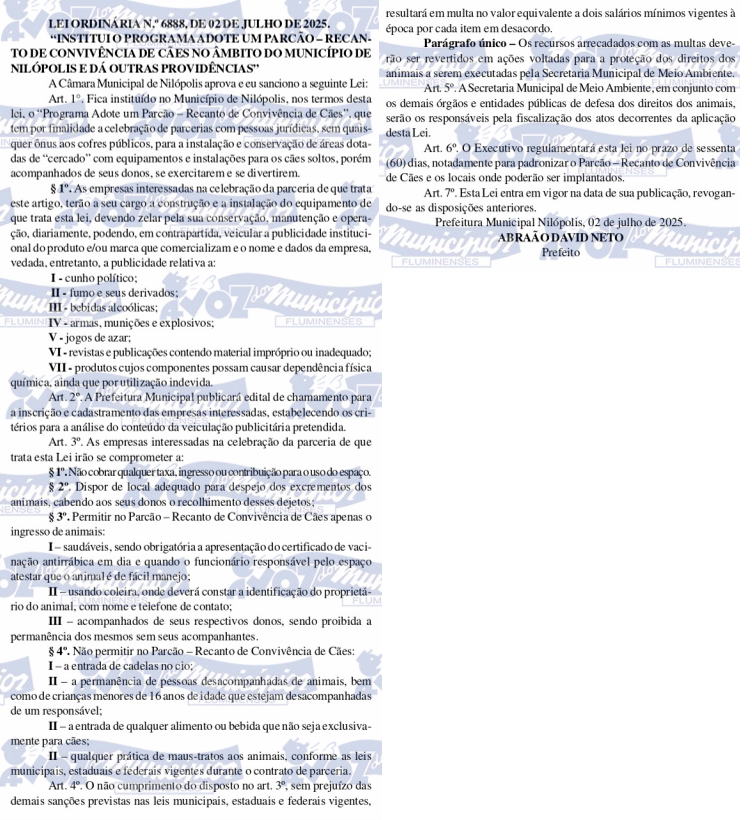 O vereador Leandro Hungria comemora mais uma importante conquista para a proteção animal em Nilópolis: a sanção da Lei nº 6888/2025, que institui o Programa Adote um Parcão – Recanto de Convivência de Cães. A iniciativa, originada do Projeto de Lei Ordinária nº 36/2025, aprovado por unanimidade na Câmara Municipal, cria espaços públicos dedicados ao lazer e socialização de cães e seus tutores, com gestão compartilhada com a iniciativa privada e sem custos para o município.