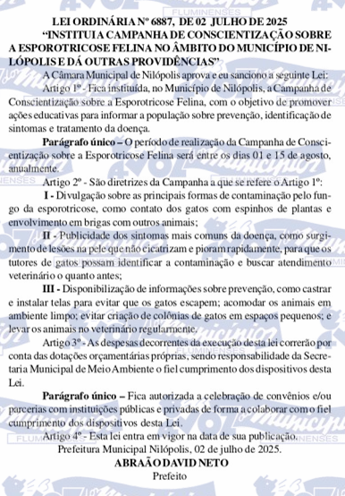 Mais uma conquista para a causa animal! O vereador Leandro Hungria teve sancionada pelo prefeito Abraão David Neto a Lei Ordinária nº 6887/2025, originada do Projeto de Lei nº 13, de 19 de fevereiro de 2025. A nova legislação institui oficialmente, no calendário municipal de Nilópolis, a Campanha de Conscientização sobre a Esporotricose Felina, reforçando o compromisso com a saúde pública, o bem-estar animal e a informação da população.