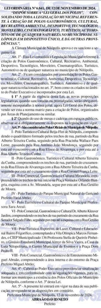 O prefeito Abraão David Neto (PL), sancionou a Lei 6841/2024, de minha autoria, que consolida a Legislação Municipal referente à criação de Polos Gastronômico, Cultural, Recreativo, Ambiental, Desportivo, Tecnológico, Moveleiro, Cinematográfico, Turístico, Automotivo ou de qualquer natureza no município de Nilópolis. A Lei já está em vigor desde o dia 15/11/2024, quando foi publicada no Diário Oficial do Município.