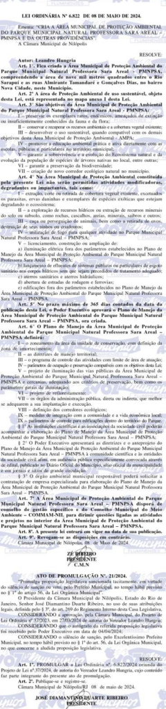 O presidente da Câmara Municipal de Nilópolis, vereador José Diamantino Ribeiro (PL), promulgou no último dia 08 de maio, a Lei Ordinária 6822/2024, que cria a Área Municipal de Proteção Ambiental do Parque Municipal Natural Professora Sara Areal, em Nova Cidade.