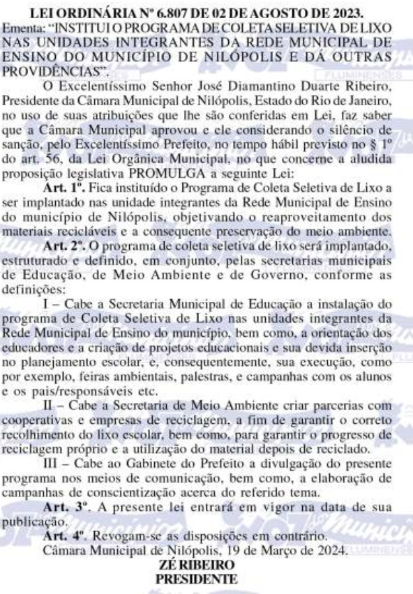 O presidente da Câmara Municipal de Nilópolis, vereador José Diamantino Ribeiro (PL), sancionou mais uma Lei de minha autoria. A lei 6807/2023, estabelece a coleta seletiva de lixo em todas as escolas da rede municipal de ensino. A proposta prevê que todo material descartável produzido dentro das escolas seja separado e encaminhado para cooperativas e empresas de reciclagem.