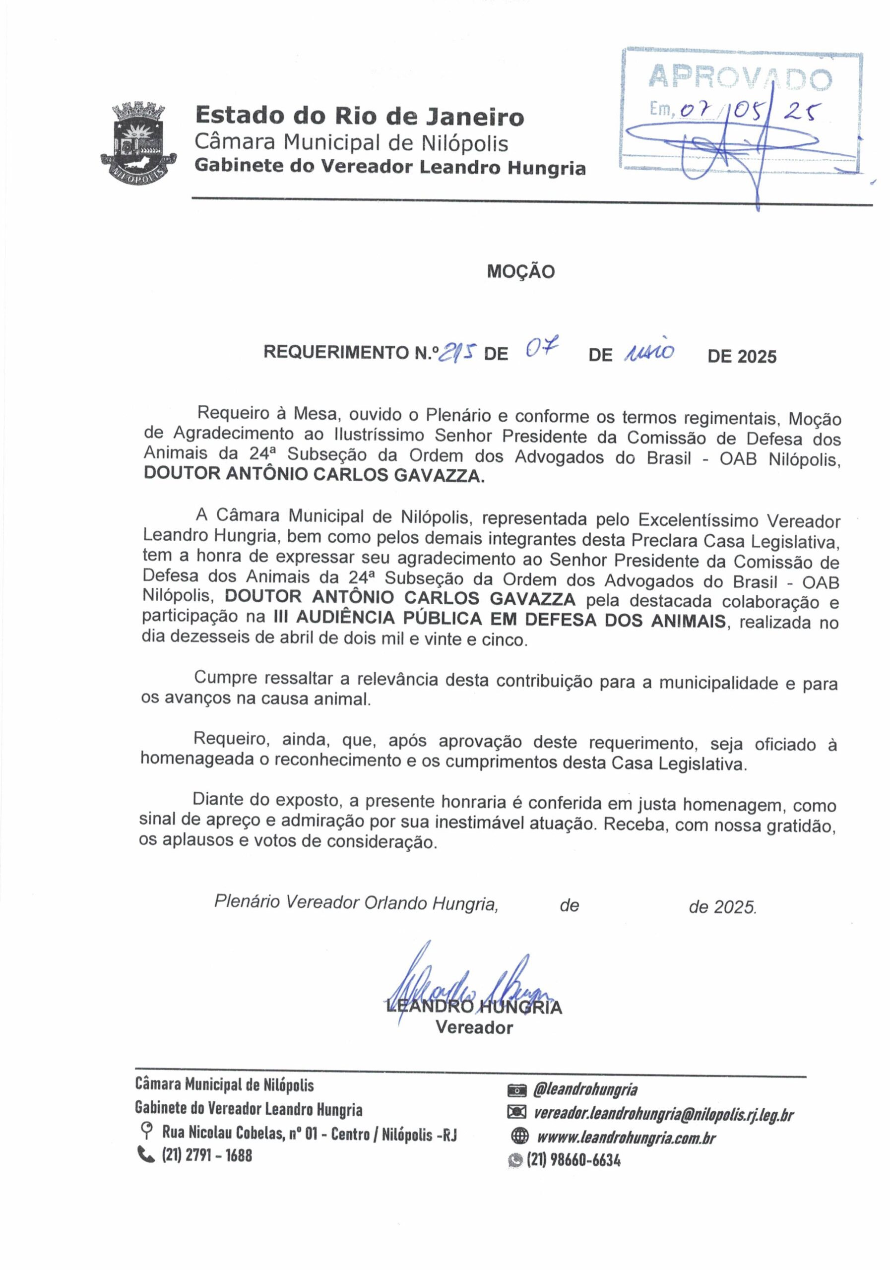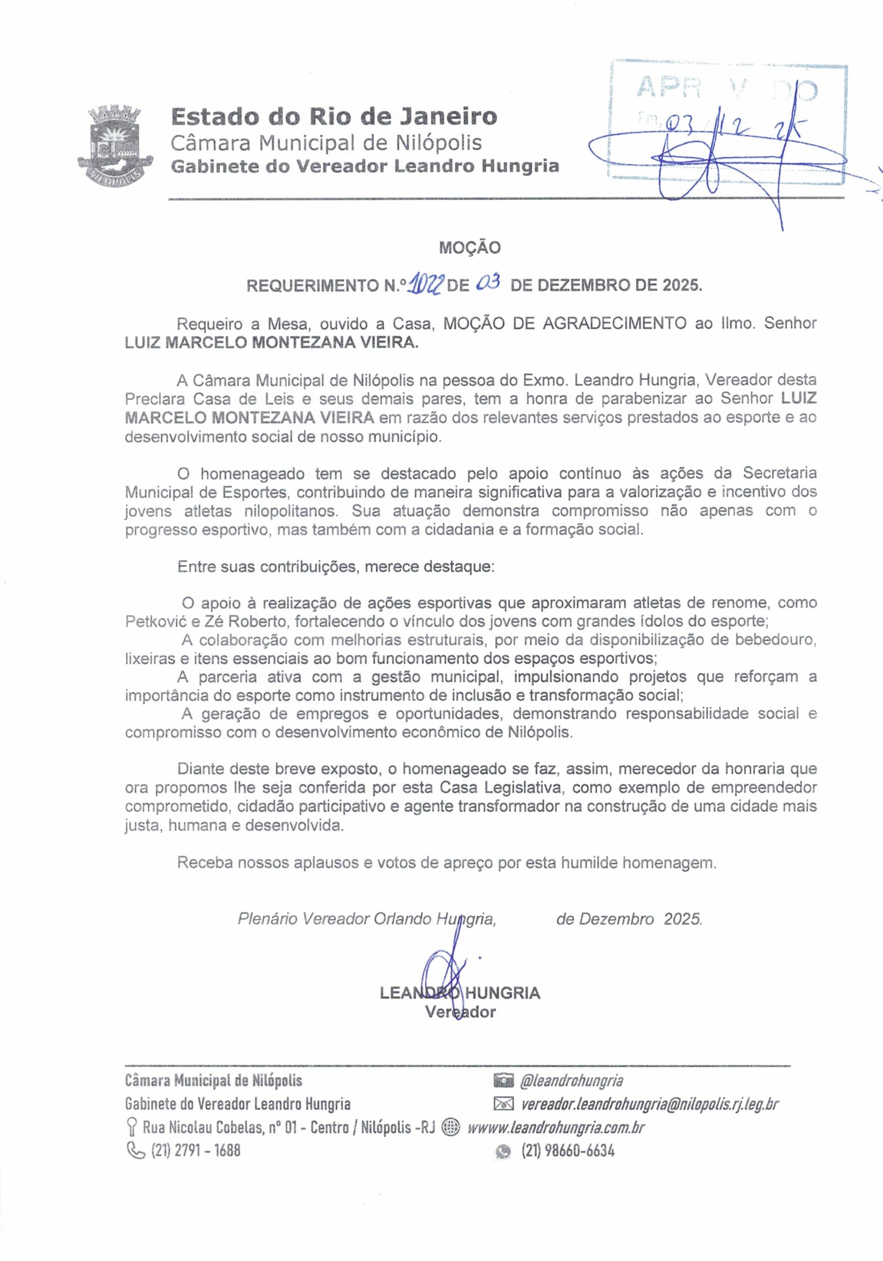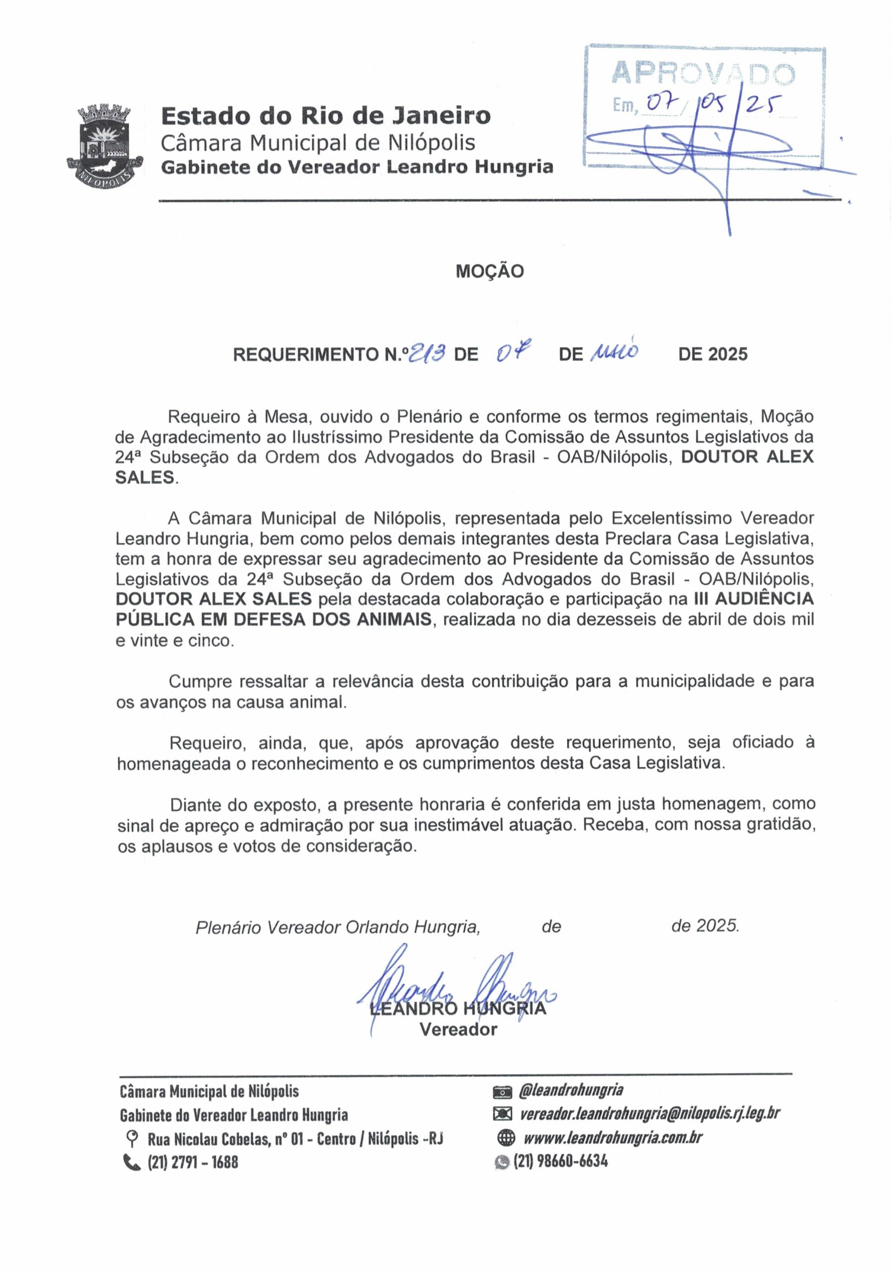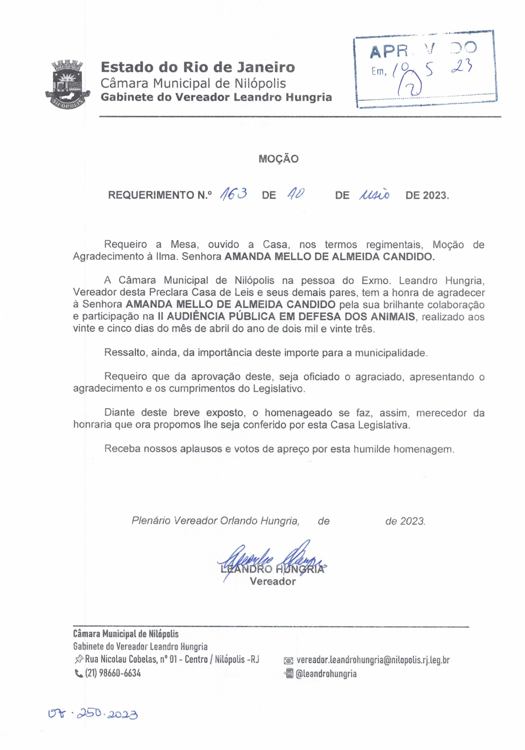 As Moções de Agradecimento são manifestações oficiais do Poder Legislativo que têm como finalidade reconhecer e valorizar pessoas, entidades ou iniciativas que prestaram relevantes serviços ou apoio à comunidade. Por meio delas, o Vereador Leandro Hungria expressa, em nome da Câmara Municipal, gratidão e respeito a quem contribuiu de forma significativa para o bem-estar coletivo e para o fortalecimento da cidadania.