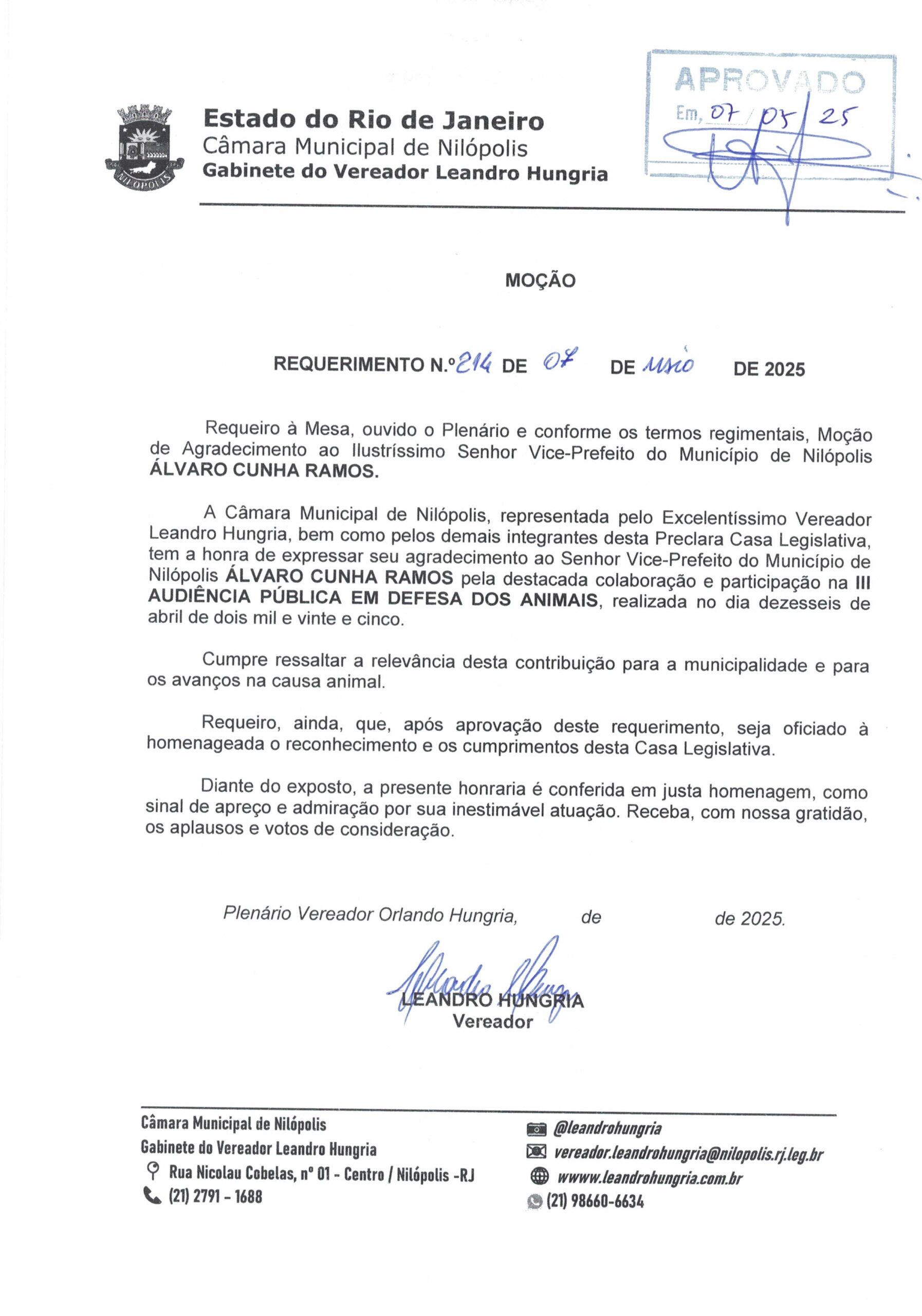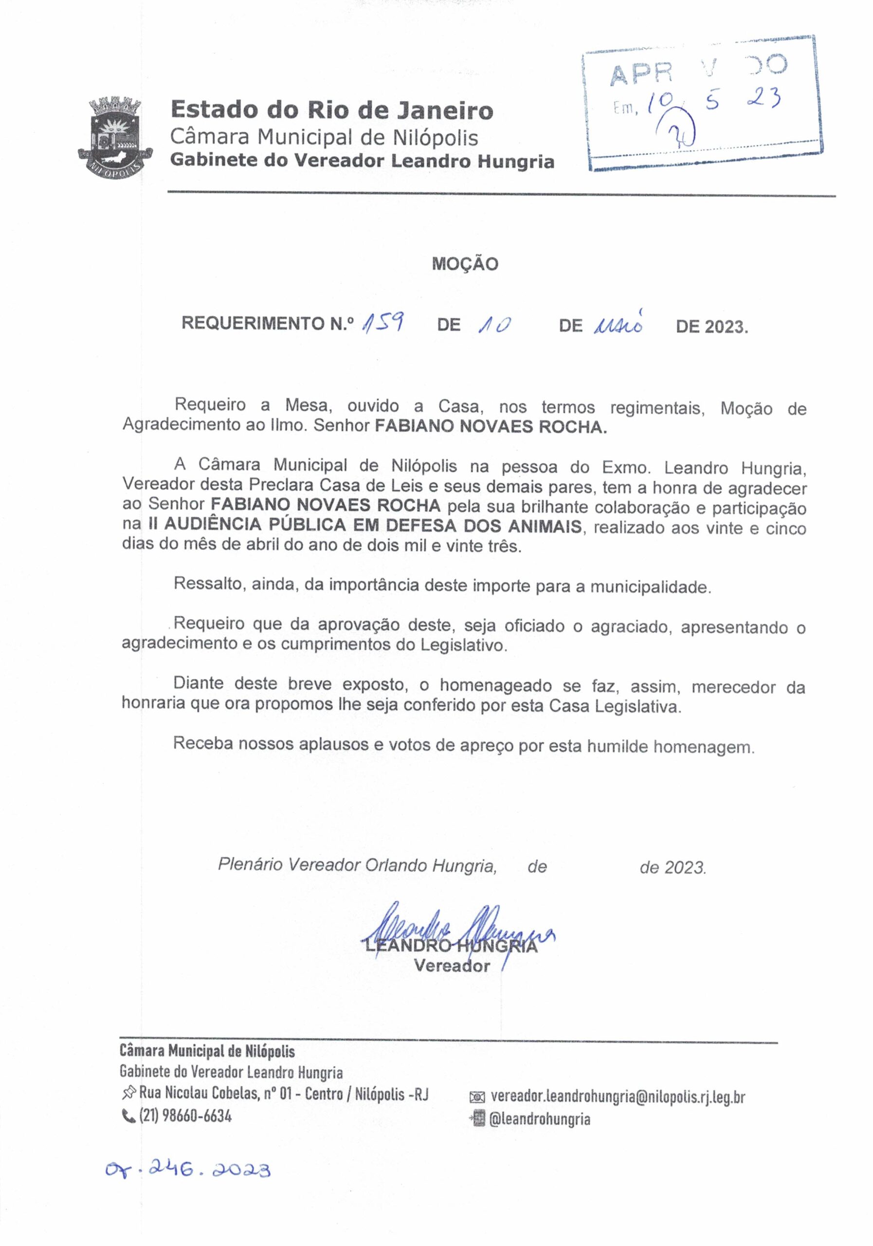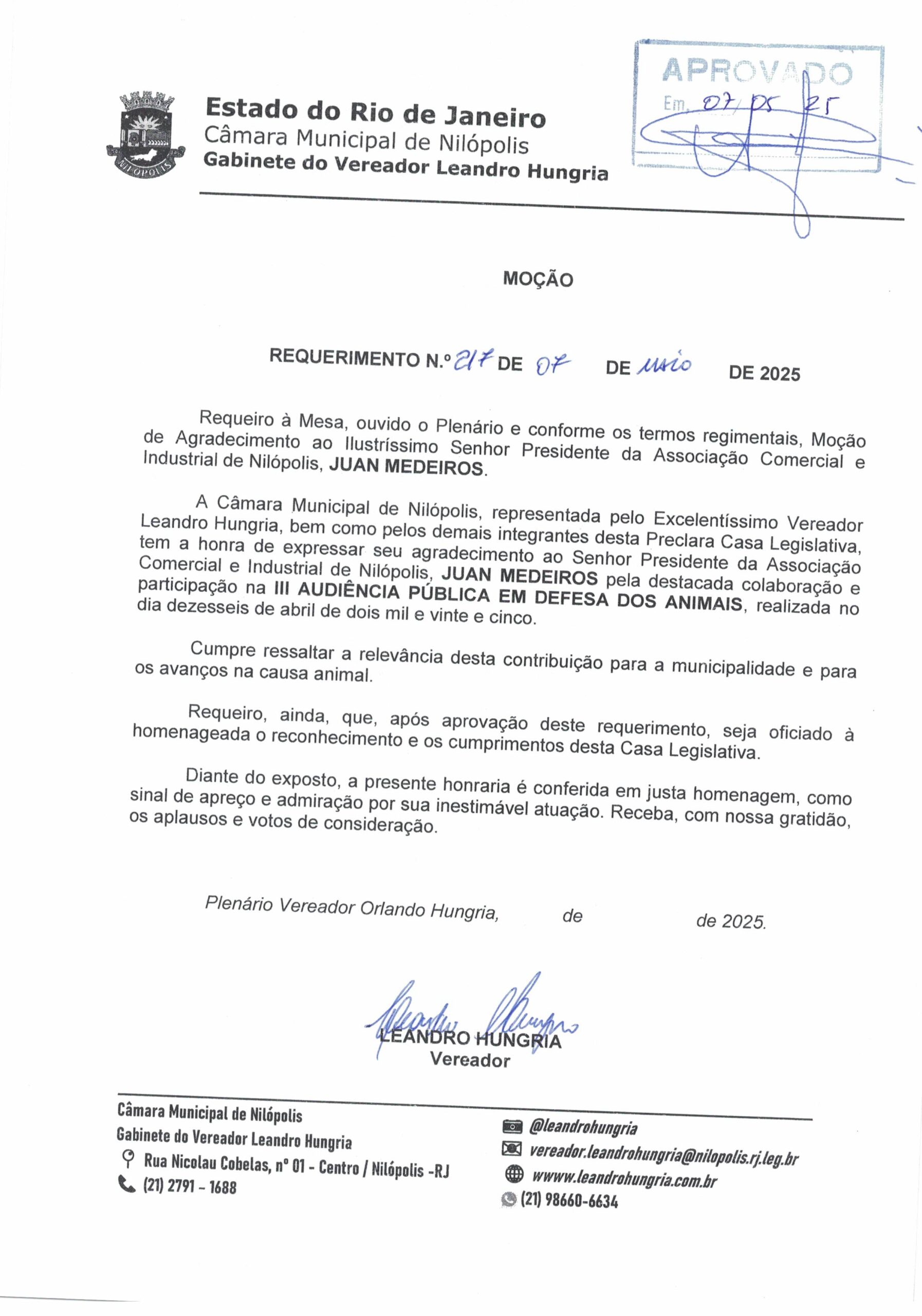 As Moções de Agradecimento são manifestações oficiais do Poder Legislativo que têm como finalidade reconhecer e valorizar pessoas, entidades ou iniciativas que prestaram relevantes serviços ou apoio à comunidade. Por meio delas, o Vereador Leandro Hungria expressa, em nome da Câmara Municipal, gratidão e respeito a quem contribuiu de forma significativa para o bem-estar coletivo e para o fortalecimento da cidadania.