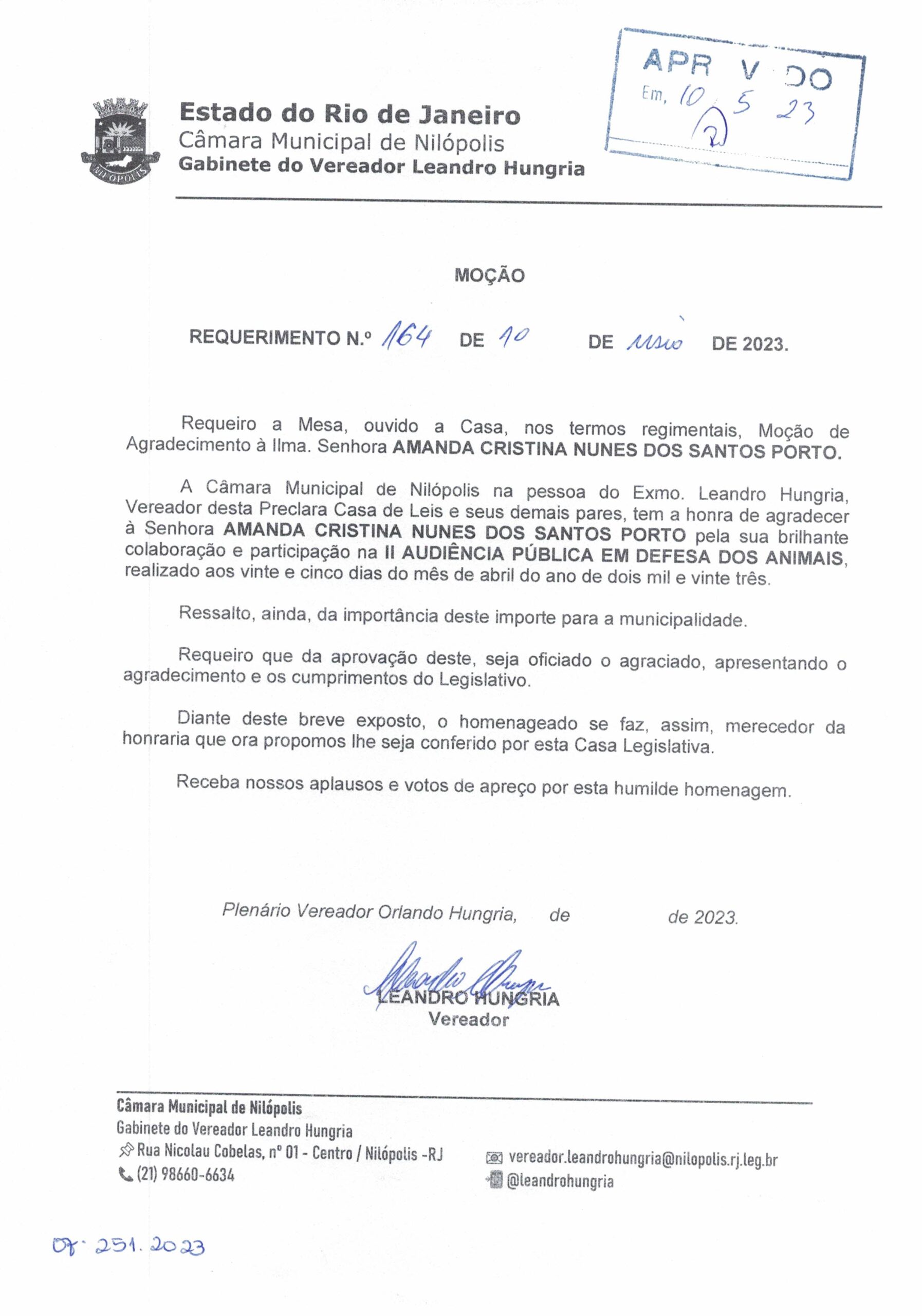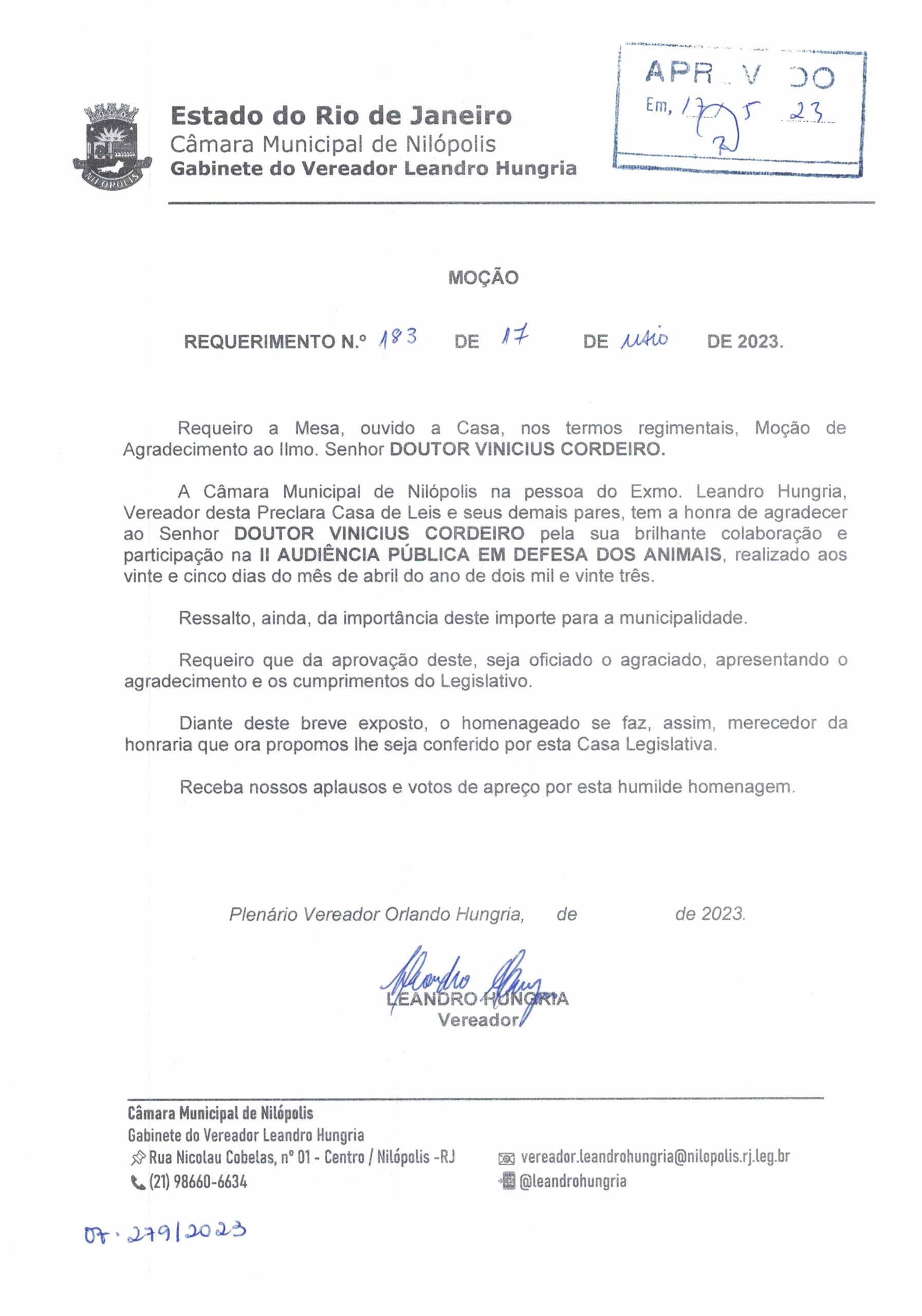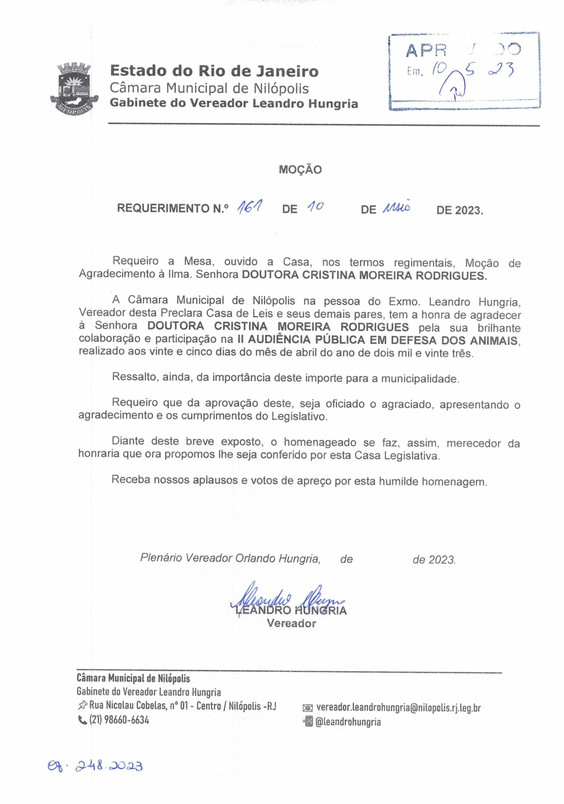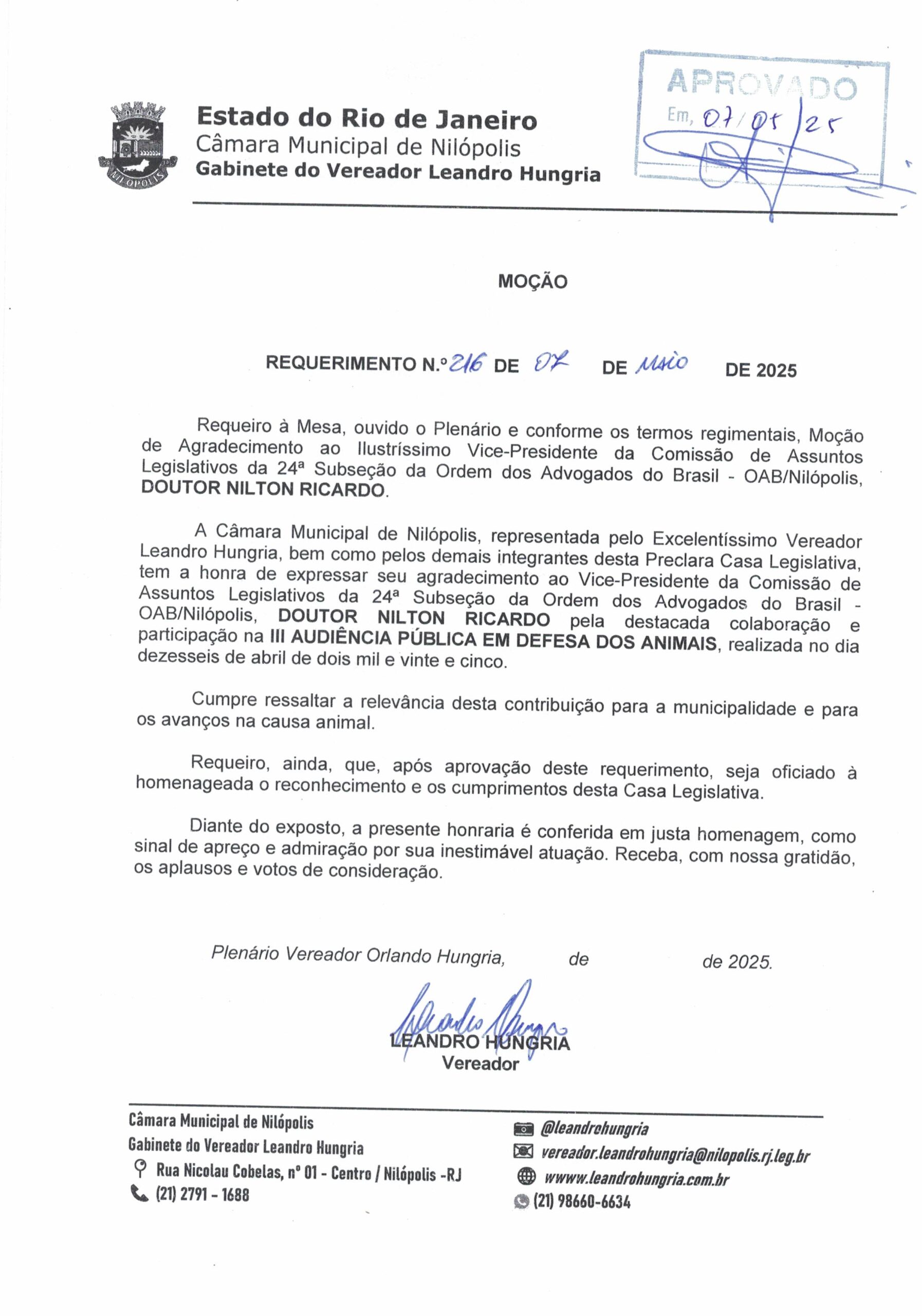 As Moções de Agradecimento são manifestações oficiais do Poder Legislativo que têm como finalidade reconhecer e valorizar pessoas, entidades ou iniciativas que prestaram relevantes serviços ou apoio à comunidade. Por meio delas, o Vereador Leandro Hungria expressa, em nome da Câmara Municipal, gratidão e respeito a quem contribuiu de forma significativa para o bem-estar coletivo e para o fortalecimento da cidadania.