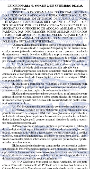 O município de Nilópolis deu mais um passo importante na proteção dos direitos dos animais com a sanção da Lei nº 6909/2025, que institui o Programa Abrigo Digital. A proposta é de autoria do vereador Leandro Hungria, presidente da Comissão Permanente de Proteção aos Direitos dos Animais da Câmara Municipal, e foi aprovada por unanimidade em dois turnos. Com essa conquista, o parlamentar chega à marca de 80 leis sancionadas desde o início de seu mandato em 2021.
