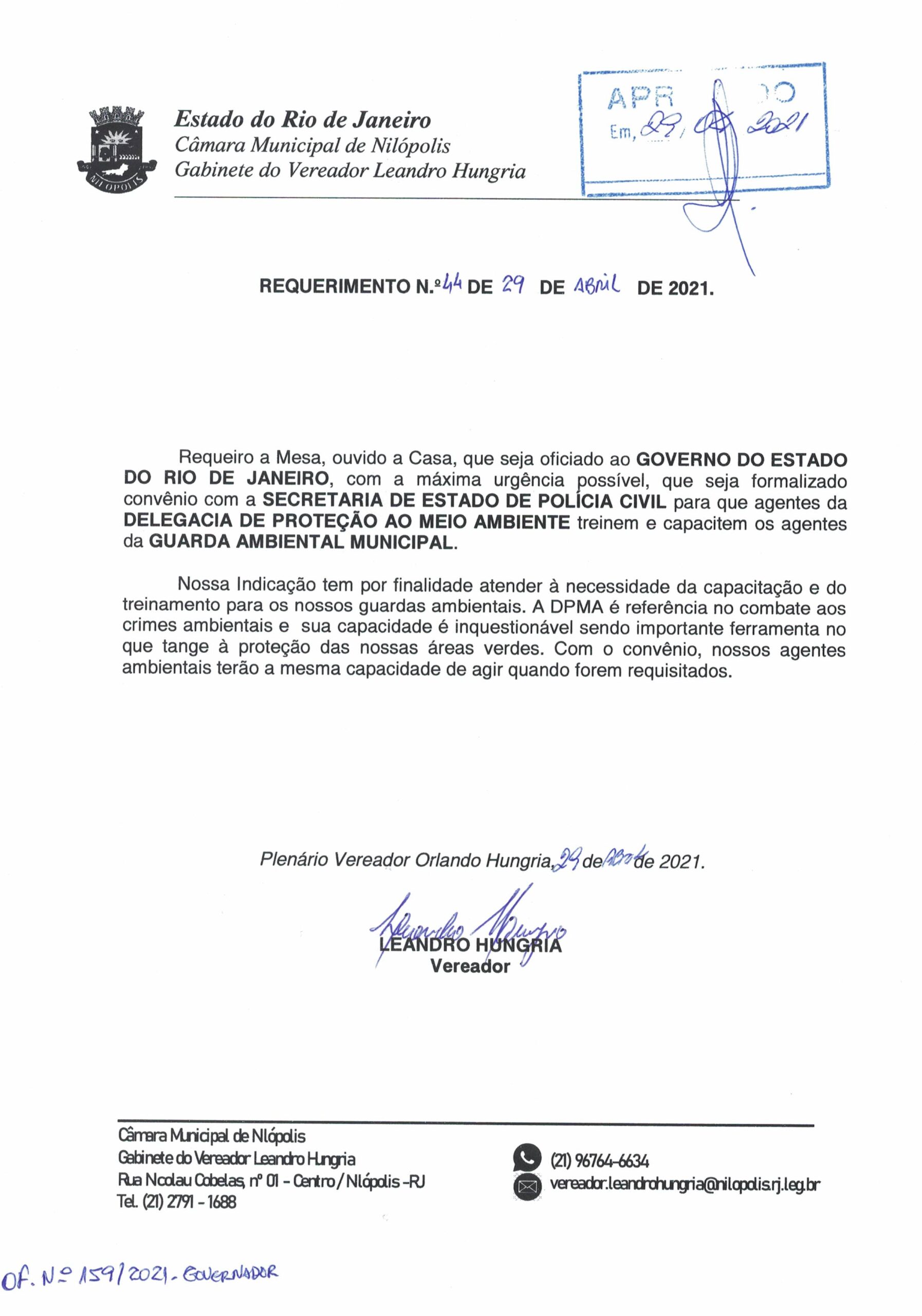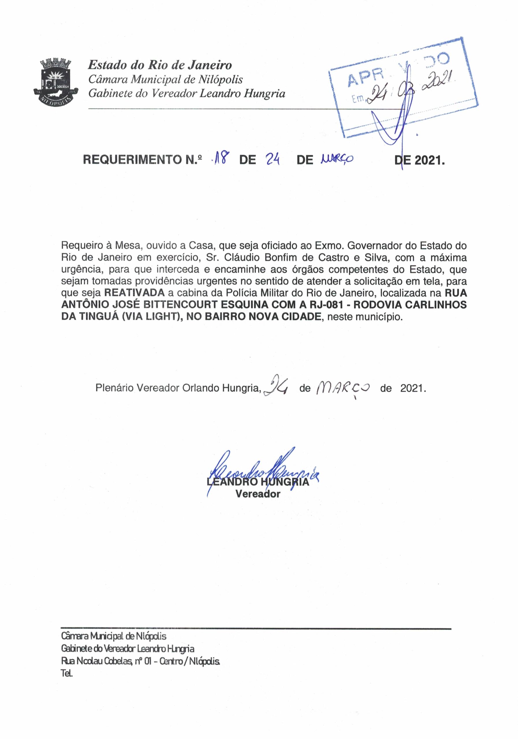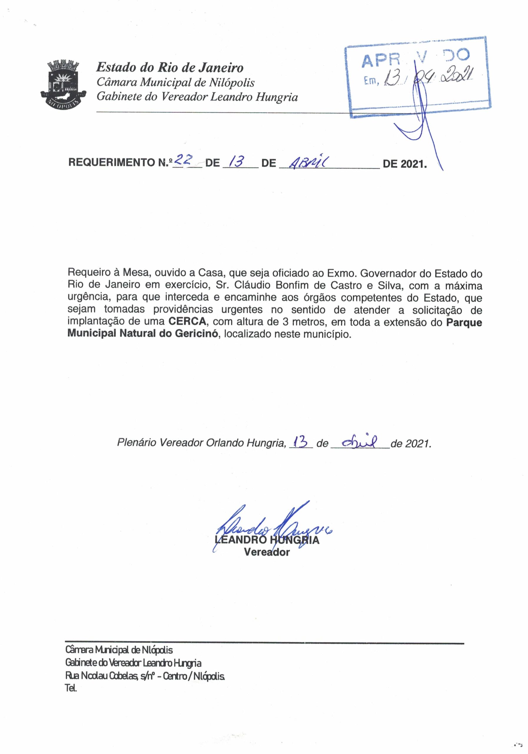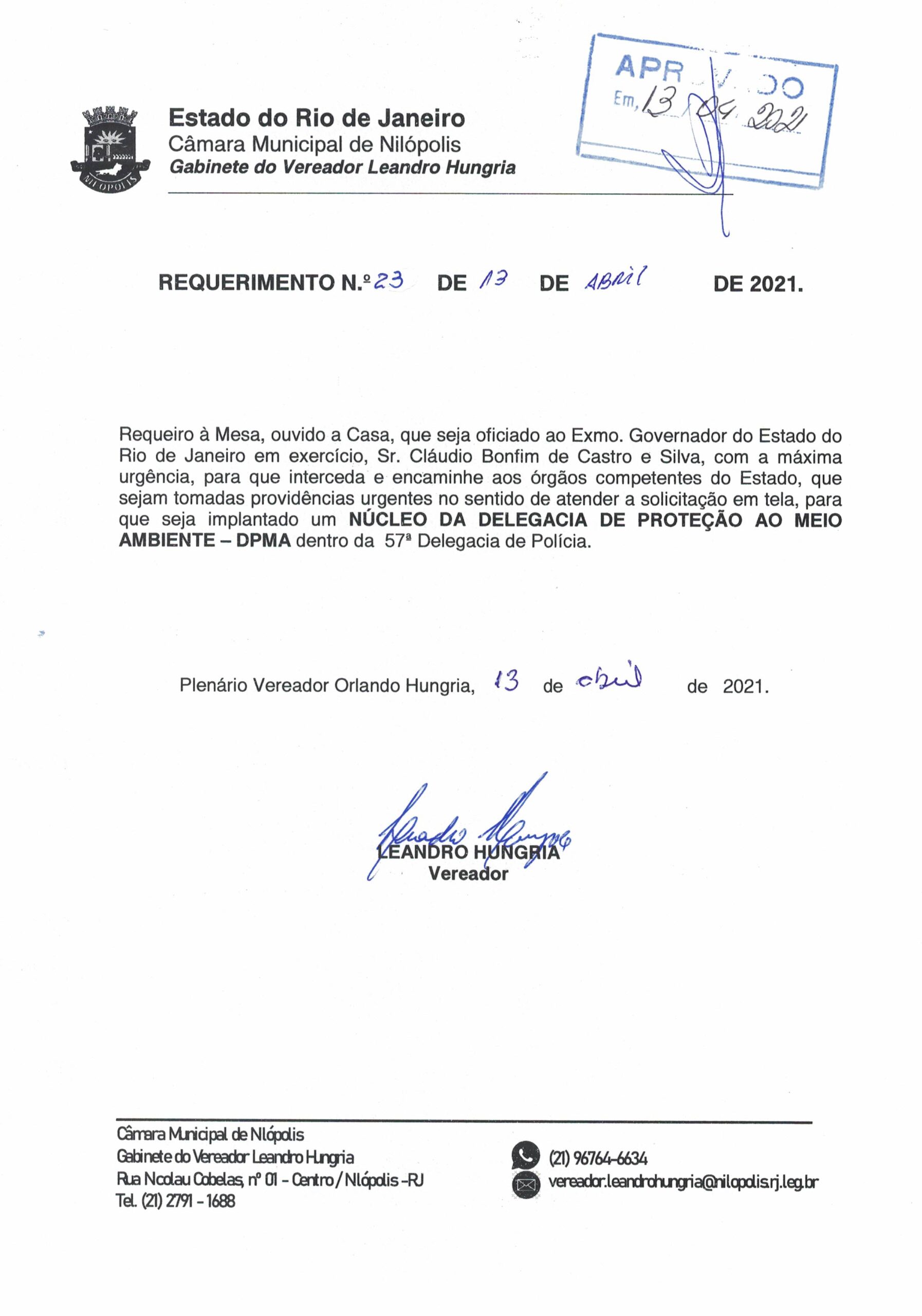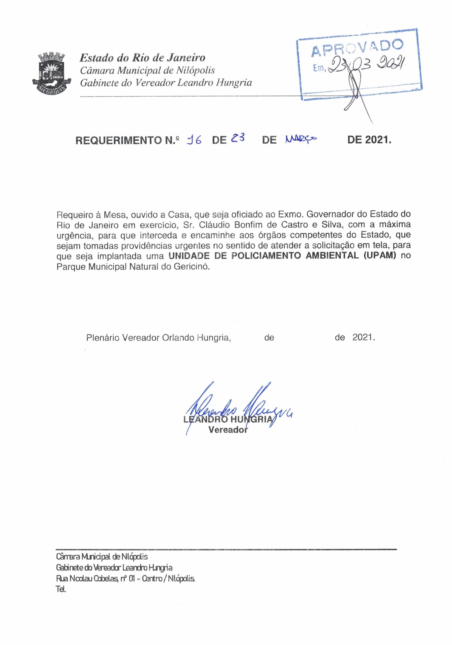 Abaixo apresentamos alguns dos Requerimentos apresentados pelo vereador Leandro Hungria desde o seu primeiro mandato. O arquivo com todos os Requerimentos pode ser encontrado na Câmara Municipal de Nilópolis.