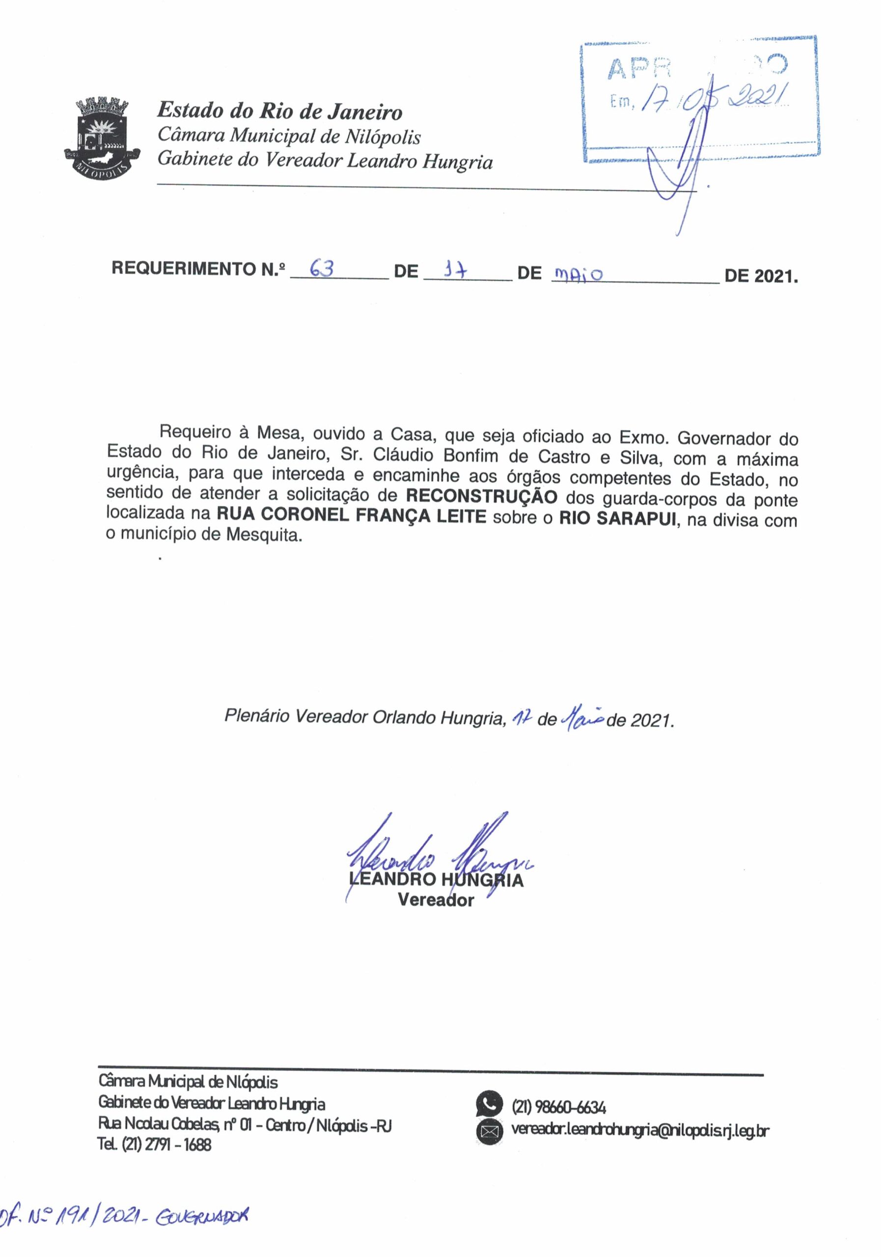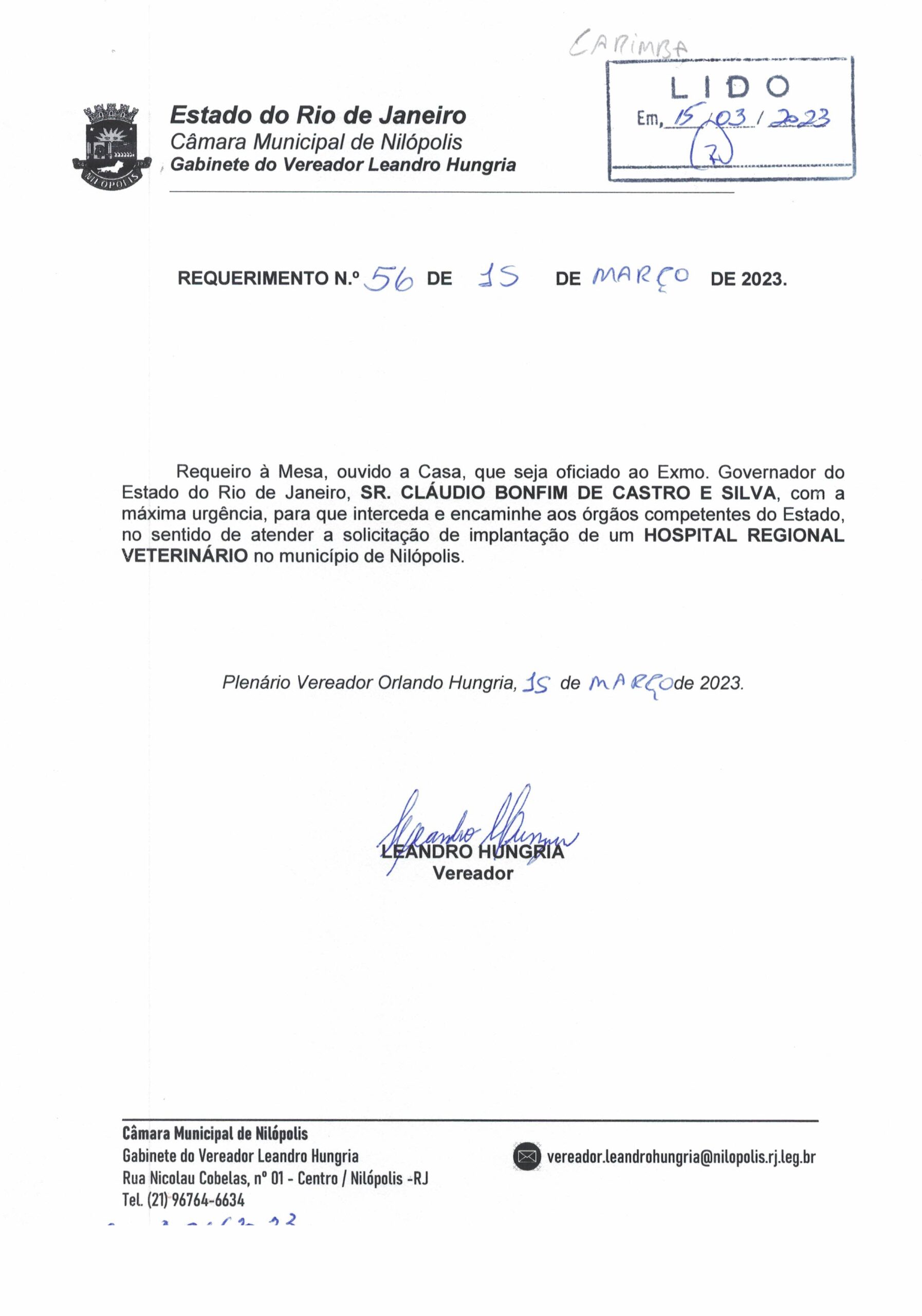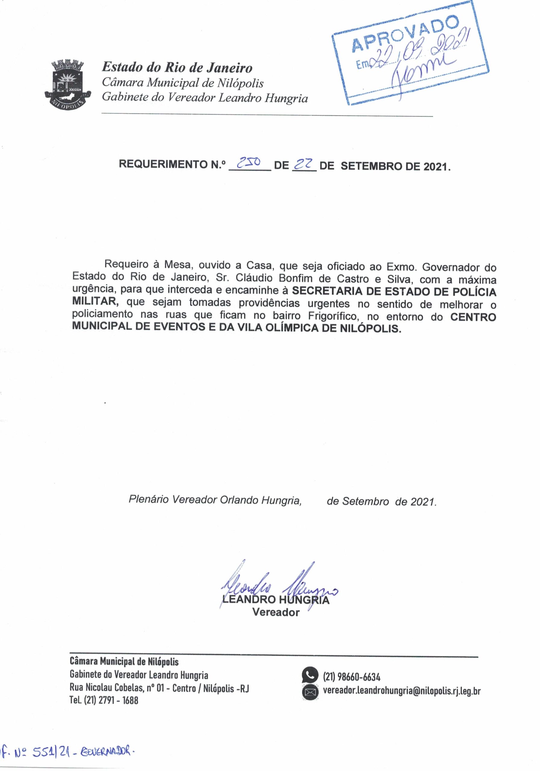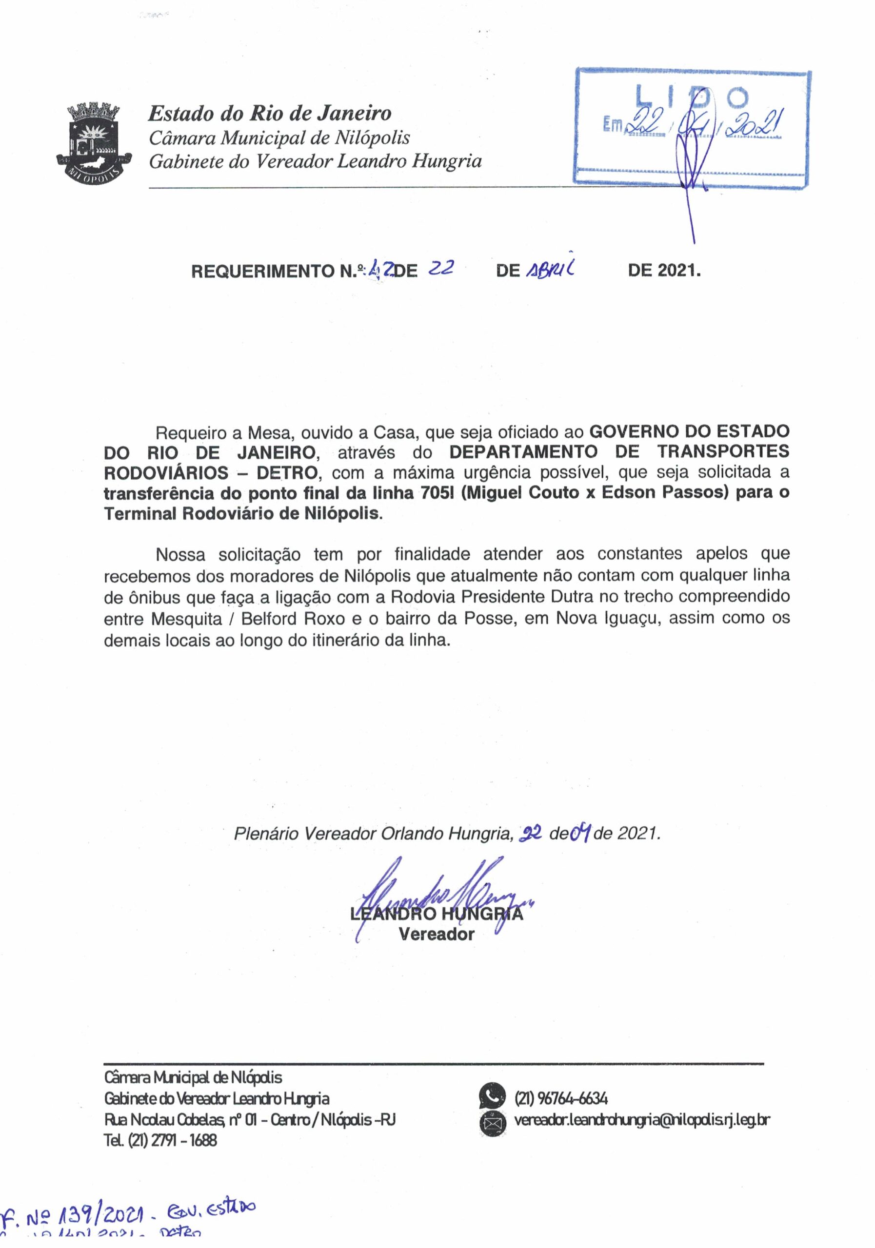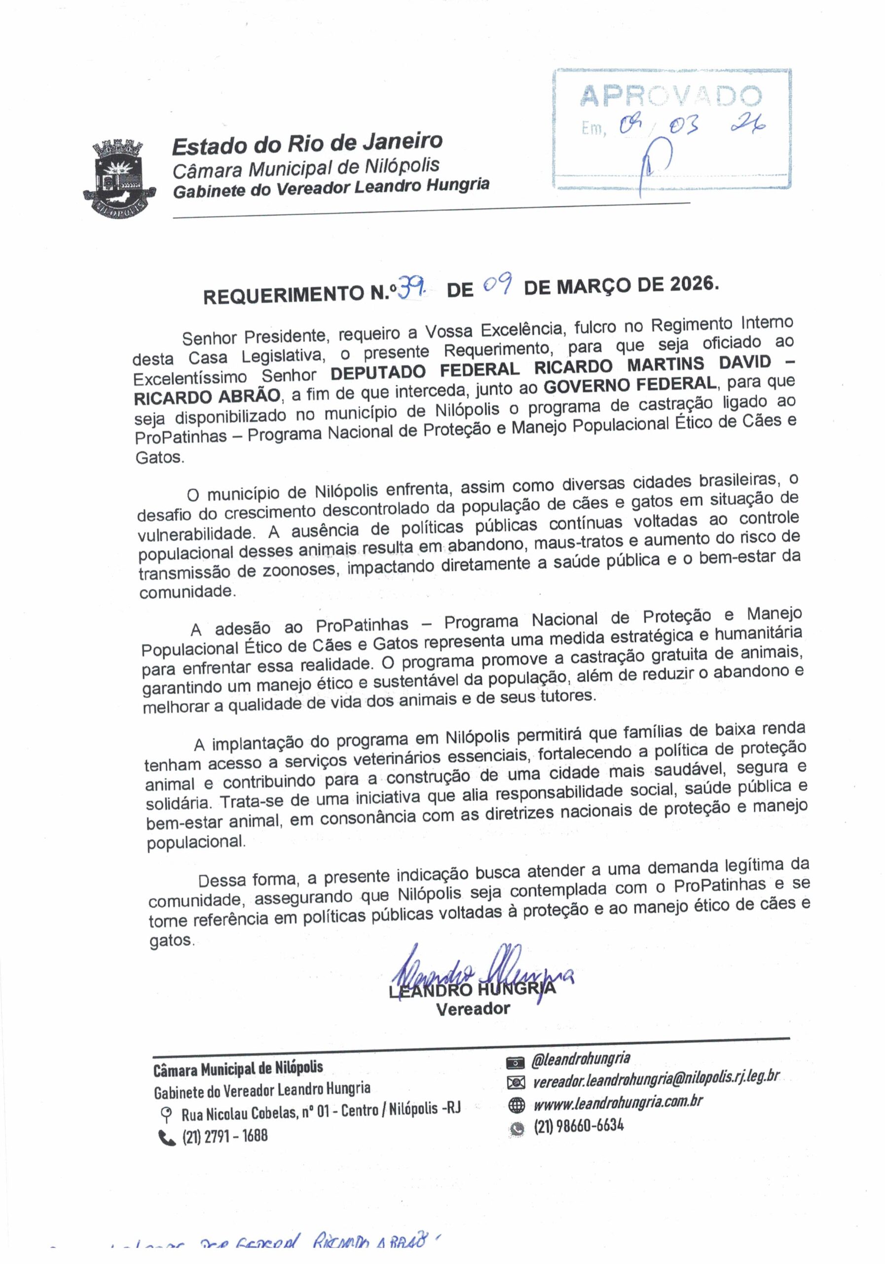 Abaixo apresentamos alguns dos Requerimentos apresentados pelo vereador Leandro Hungria desde o seu primeiro mandato. O arquivo com todos os Requerimentos pode ser encontrado na Câmara Municipal de Nilópolis.