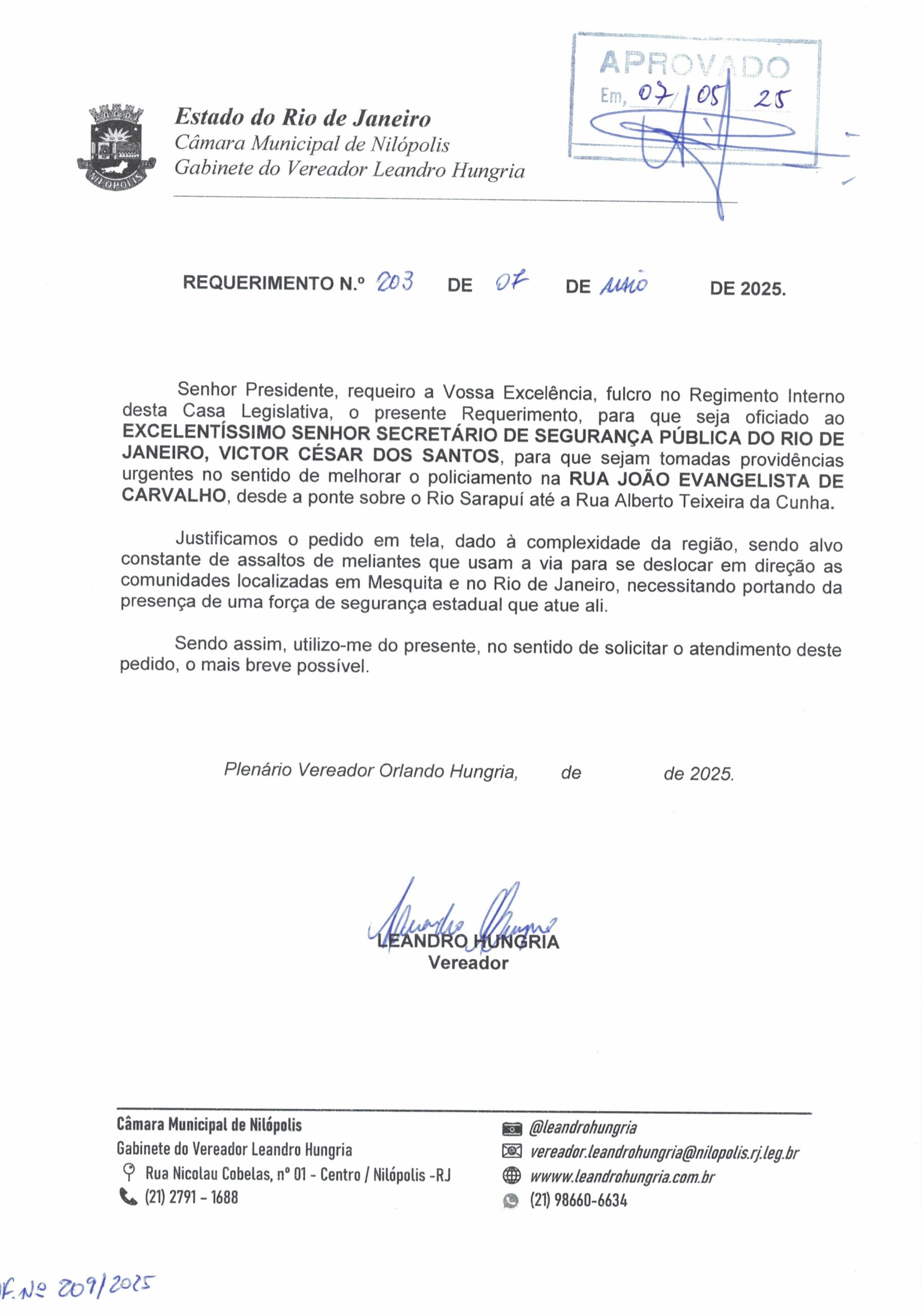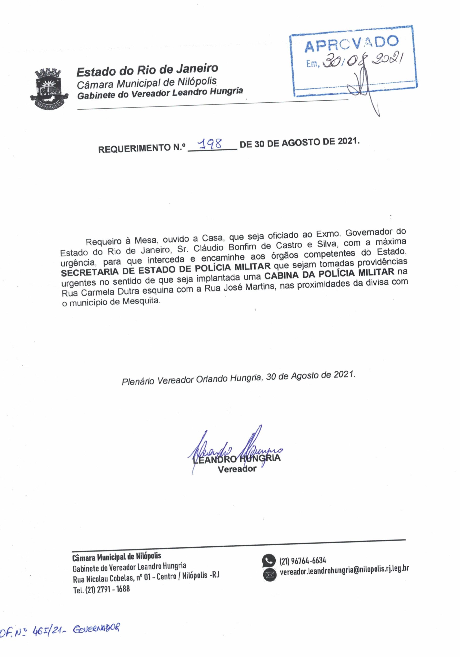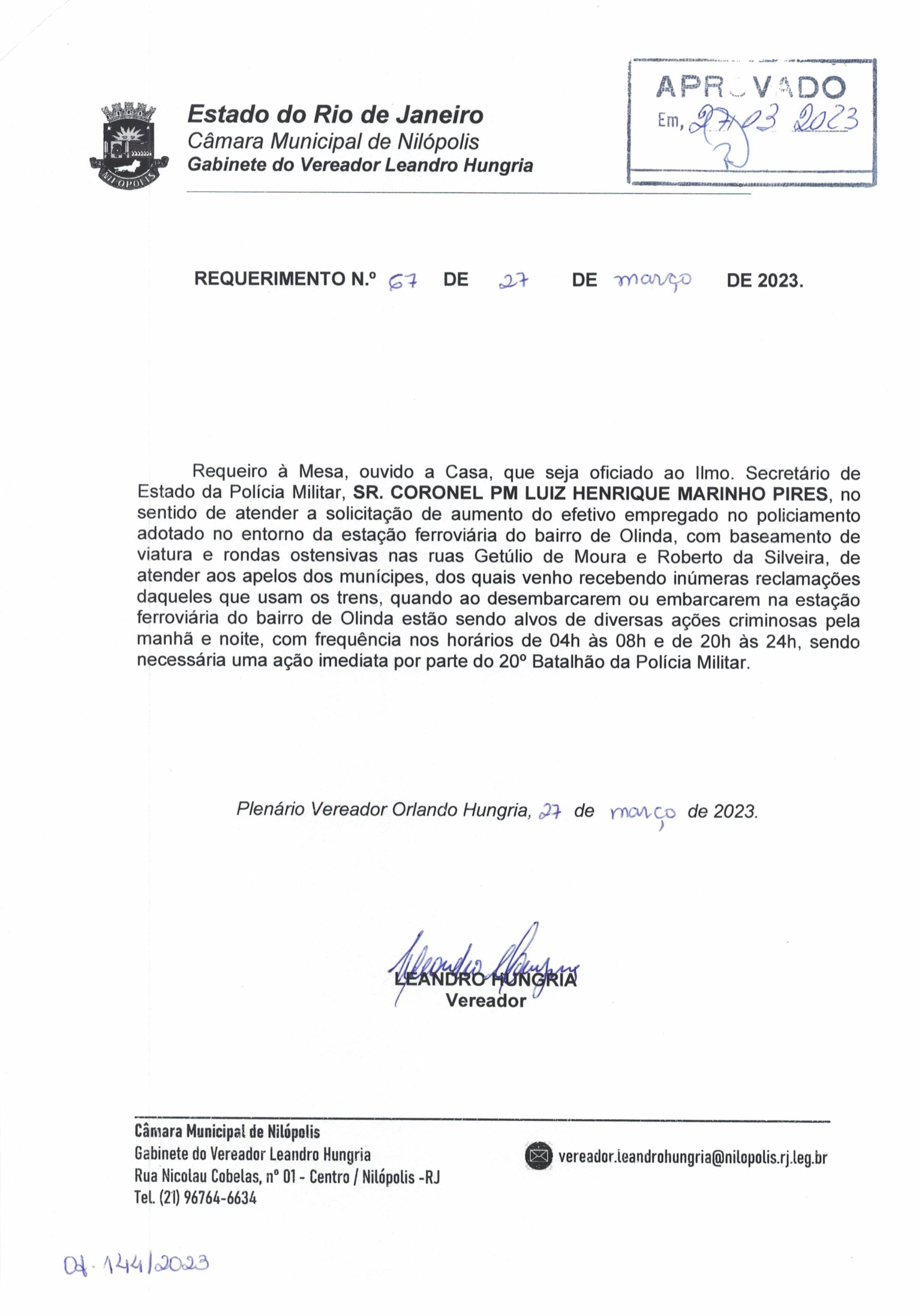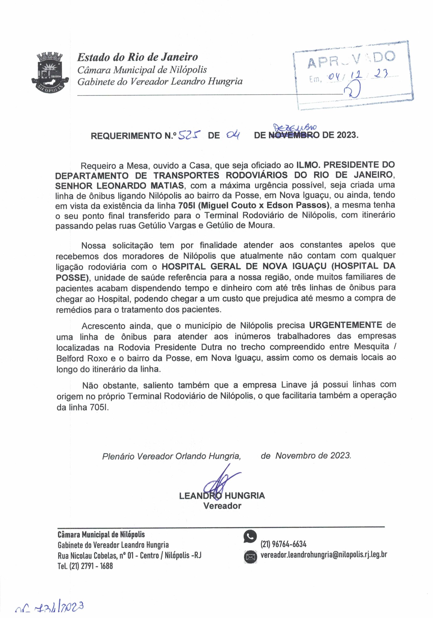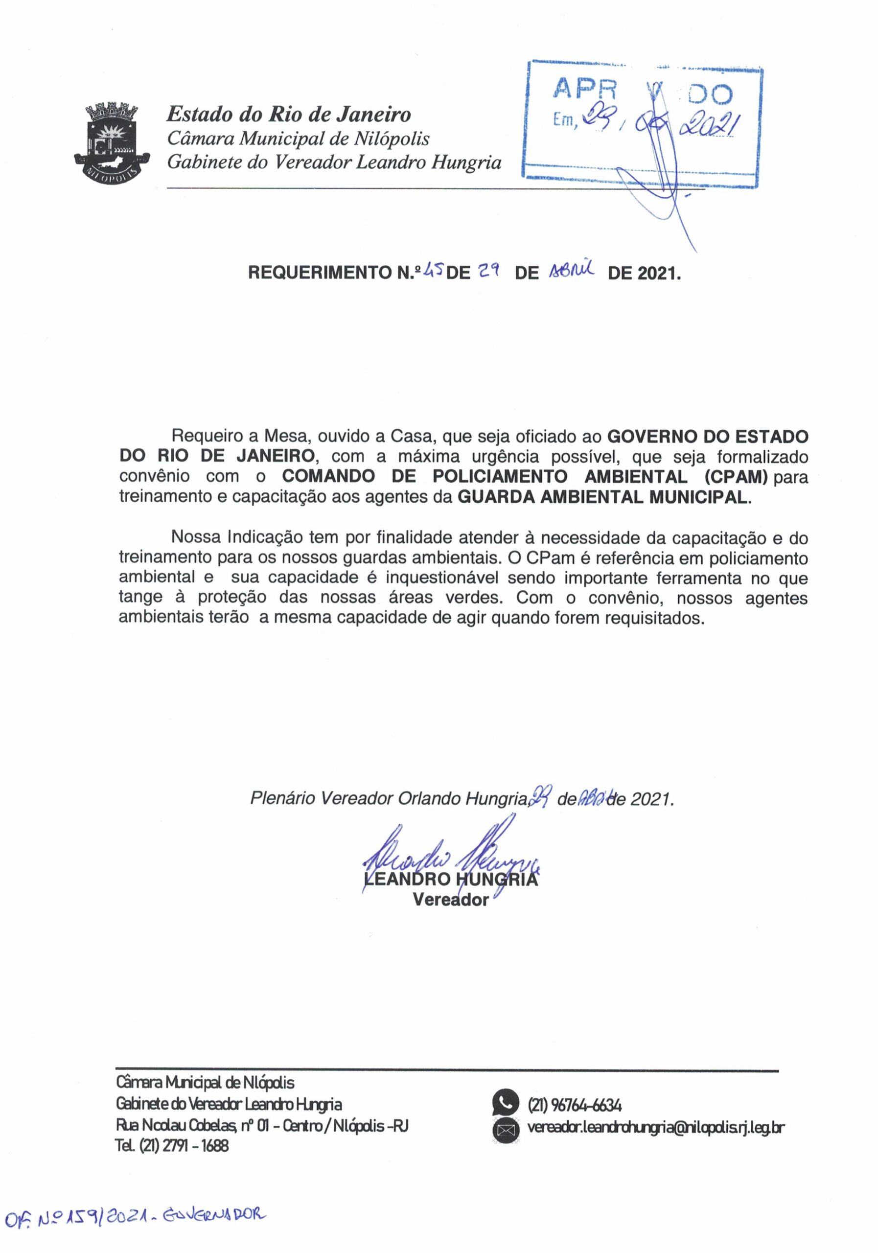 Abaixo apresentamos alguns dos Requerimentos apresentados pelo vereador Leandro Hungria desde o seu primeiro mandato. O arquivo com todos os Requerimentos pode ser encontrado na Câmara Municipal de Nilópolis.