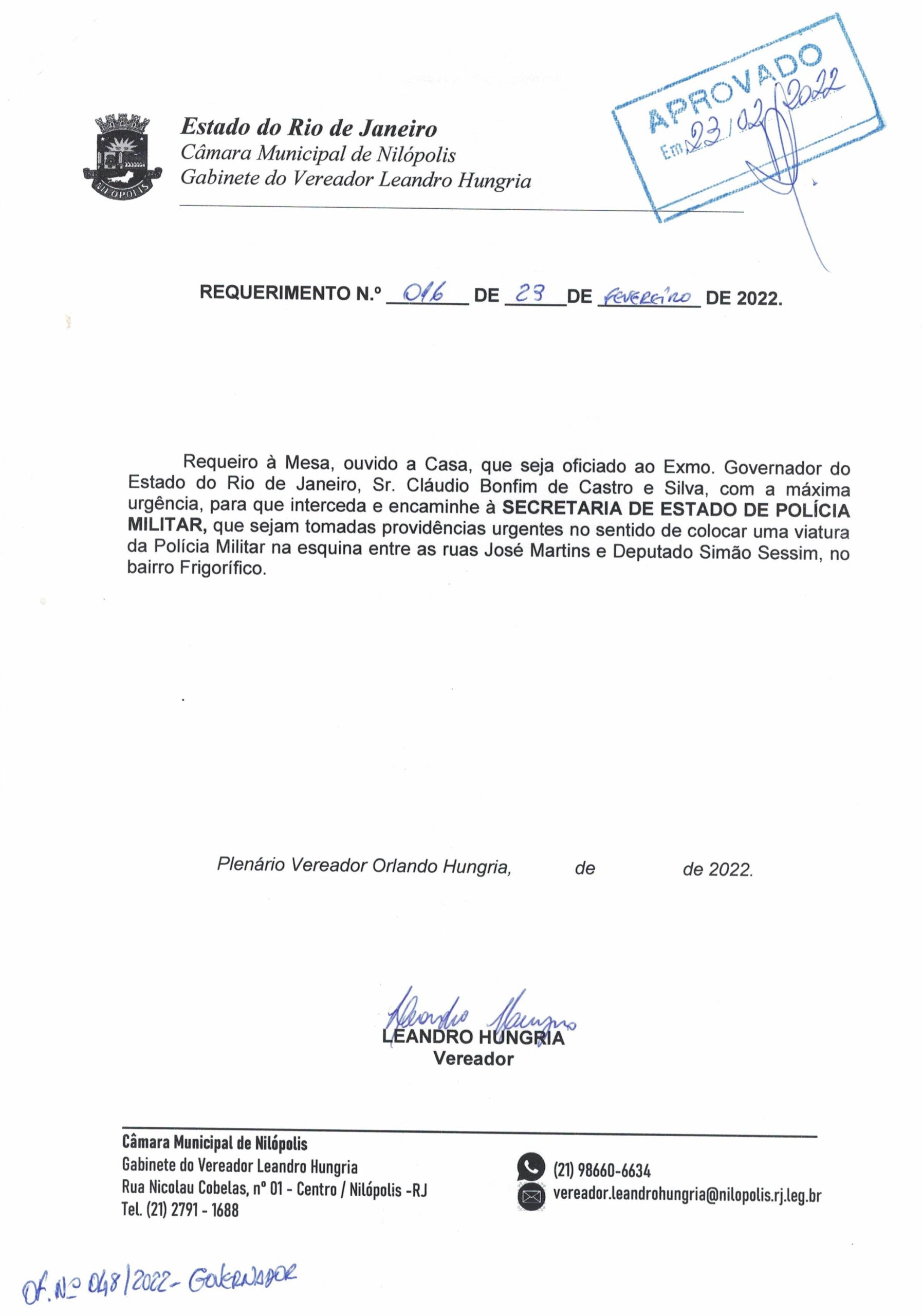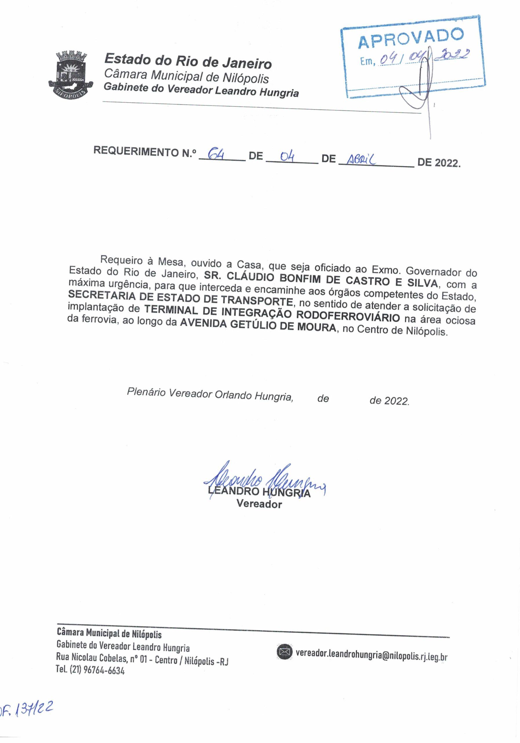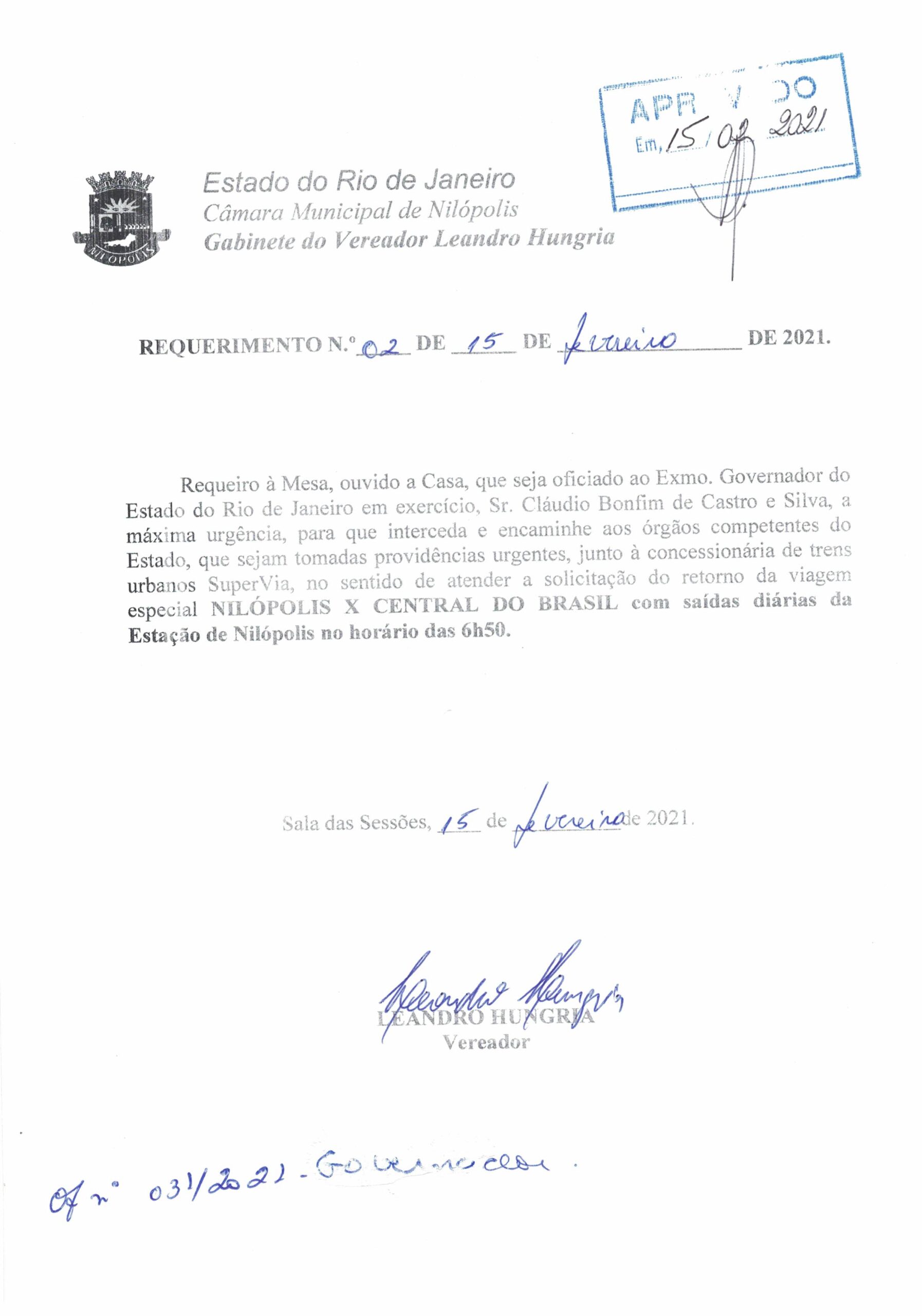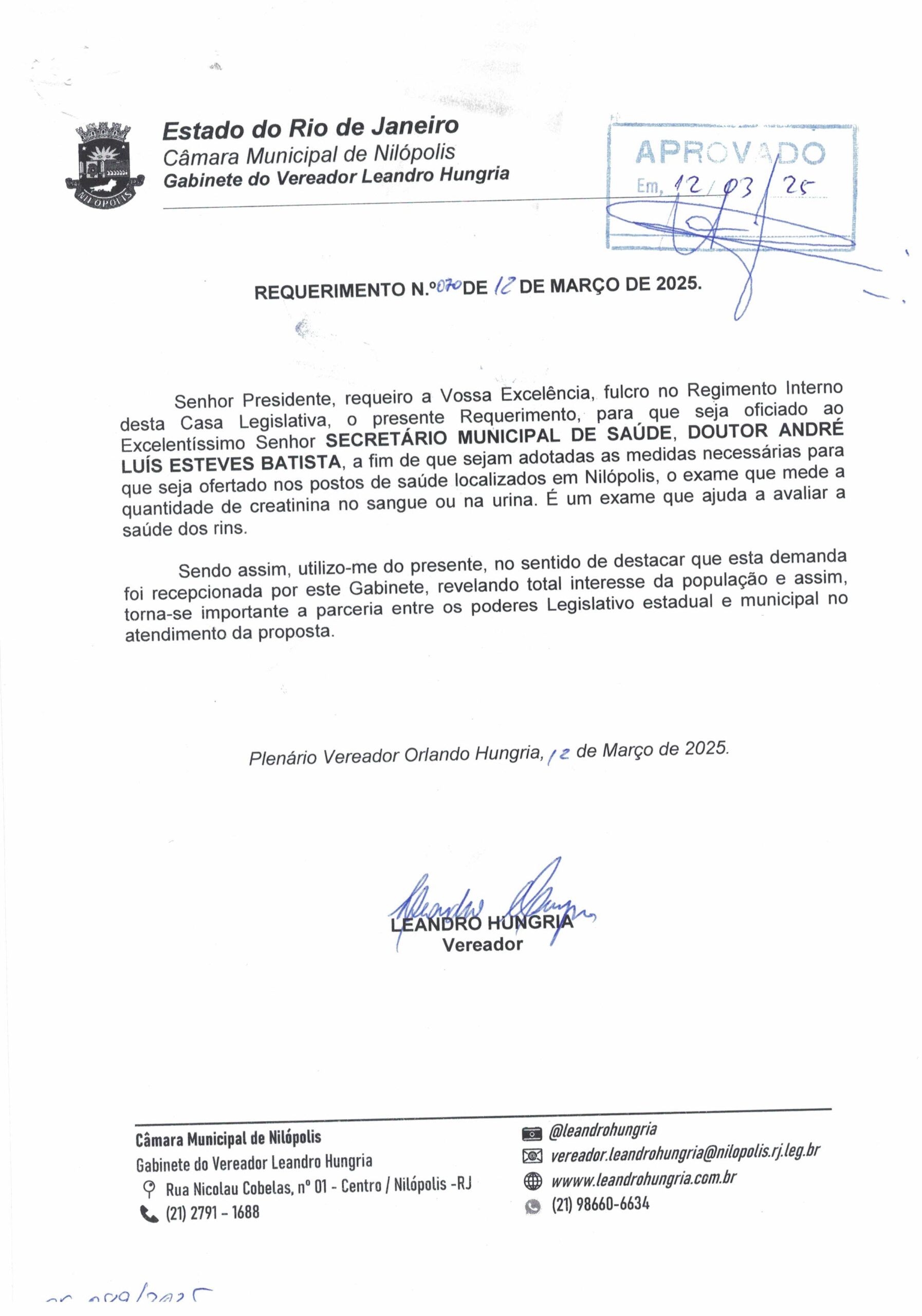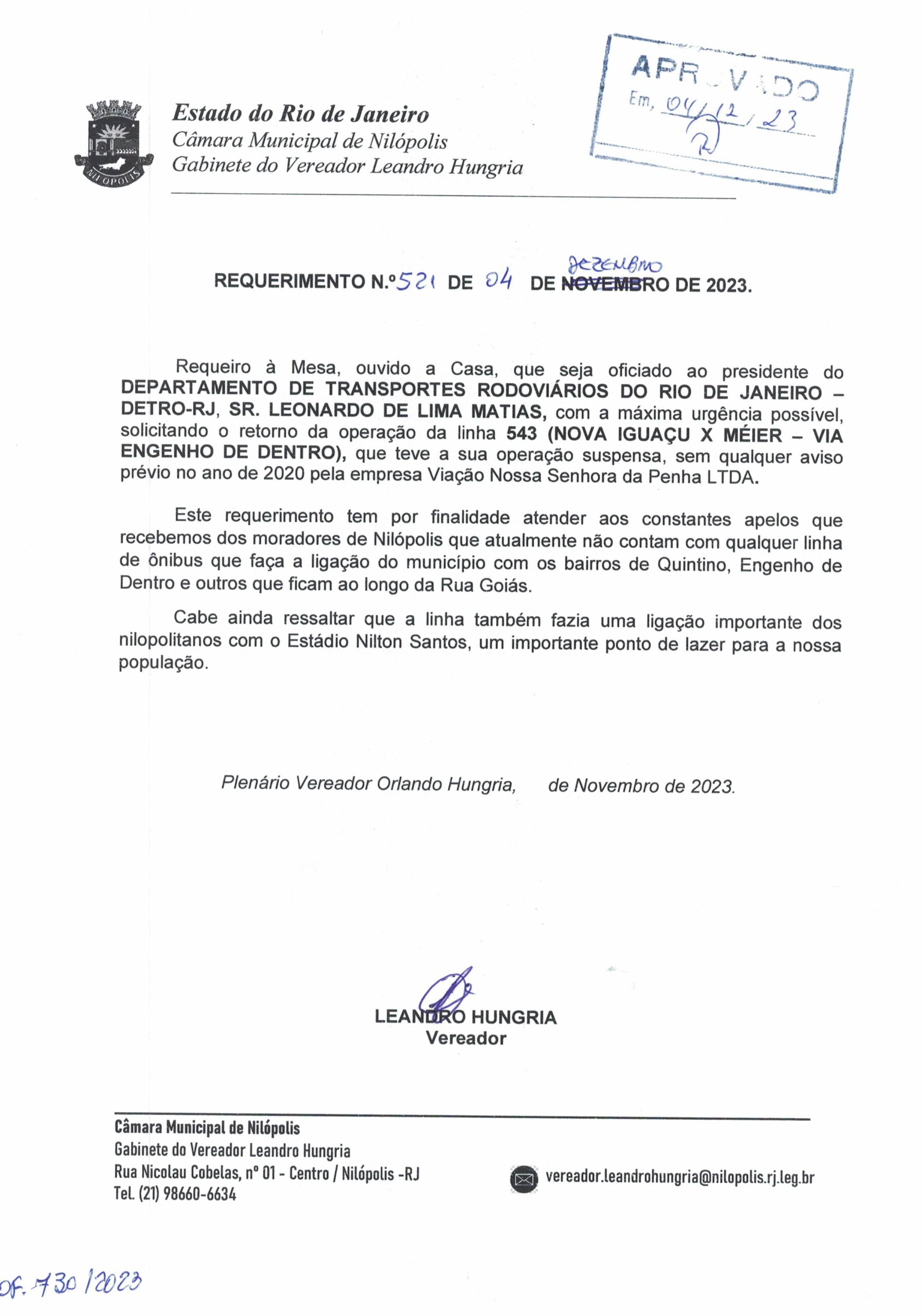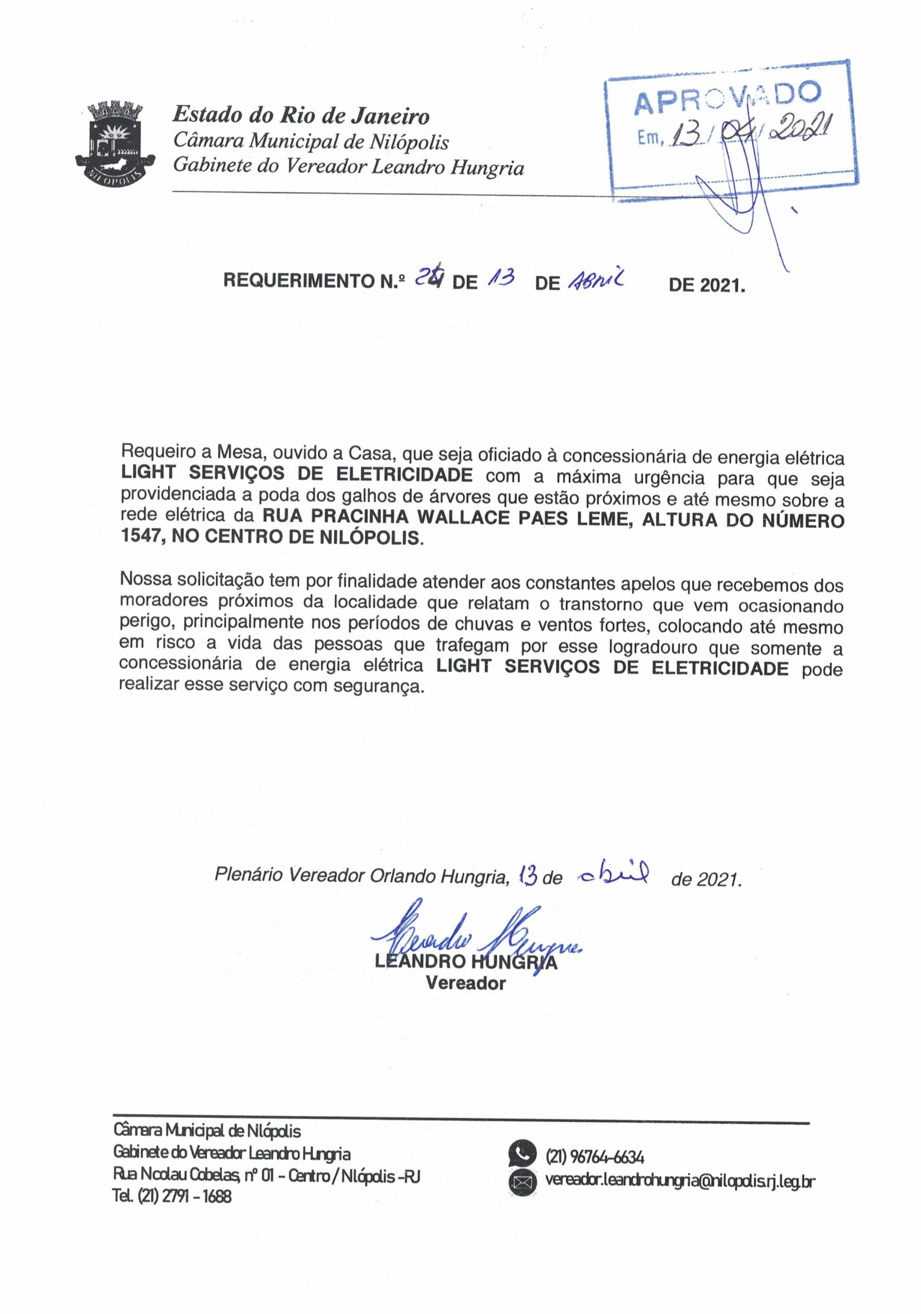 Abaixo apresentamos alguns dos Requerimentos apresentados pelo vereador Leandro Hungria desde o seu primeiro mandato. O arquivo com todos os Requerimentos pode ser encontrado na Câmara Municipal de Nilópolis.