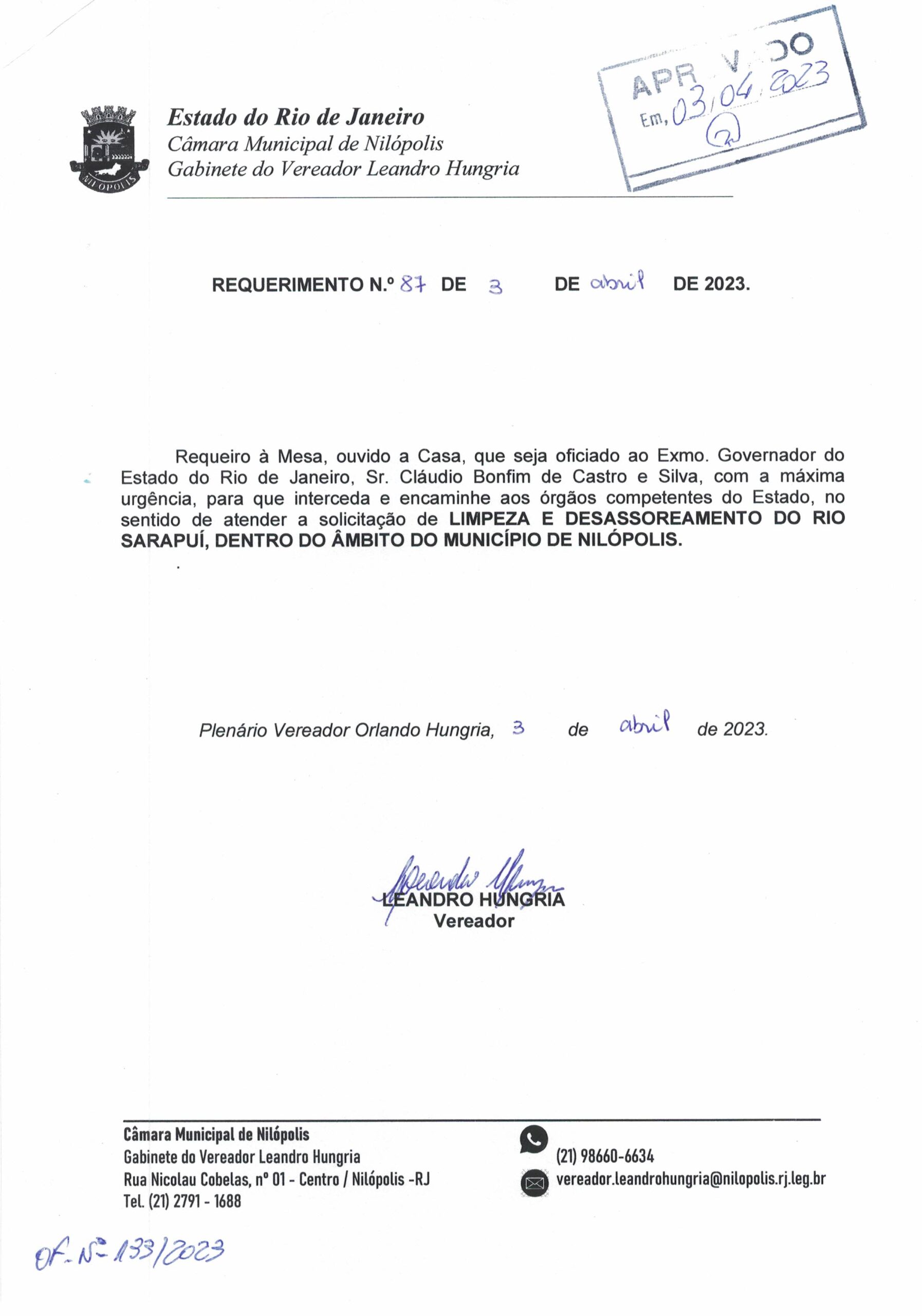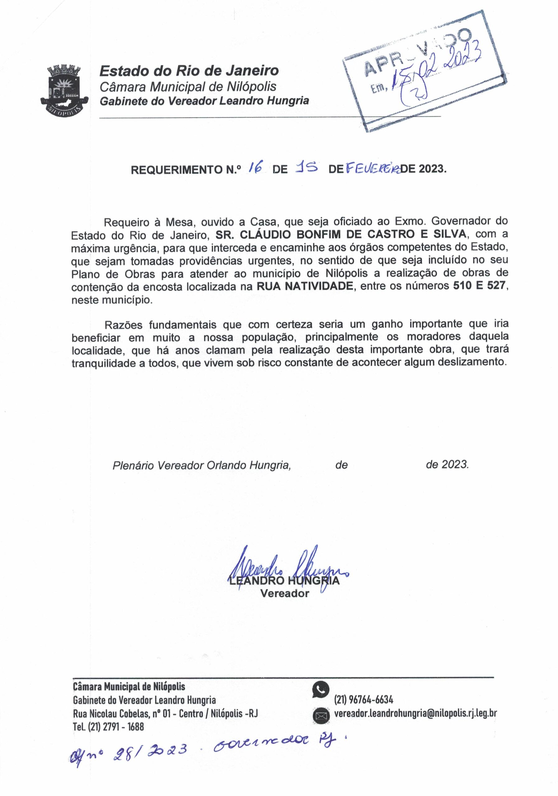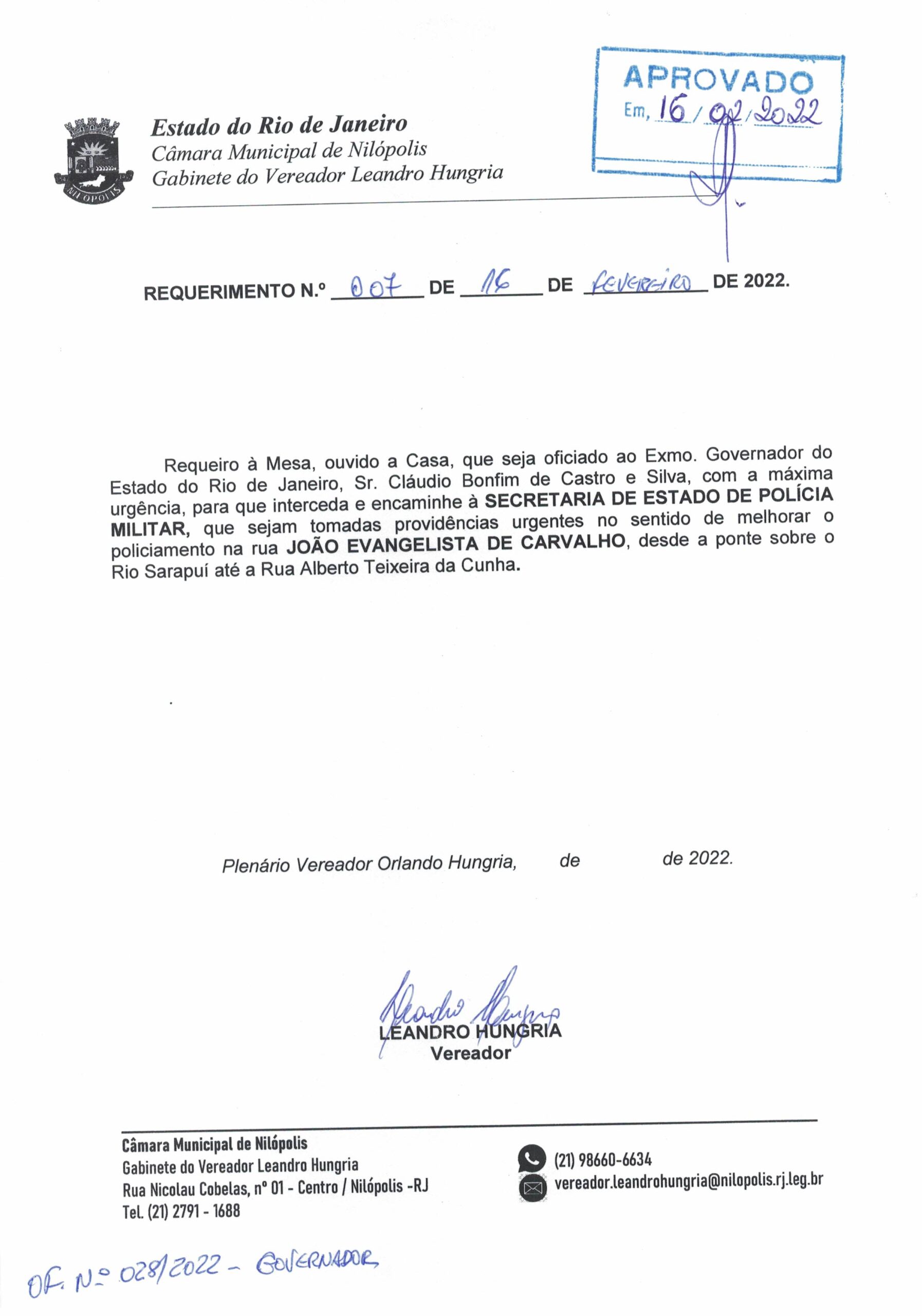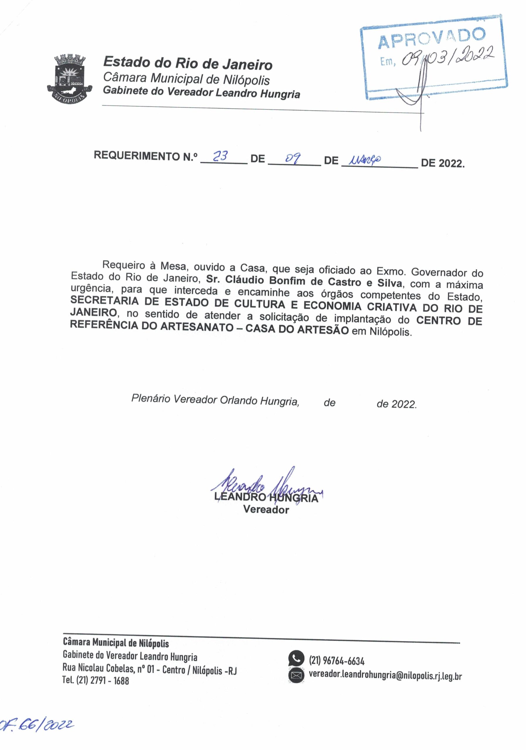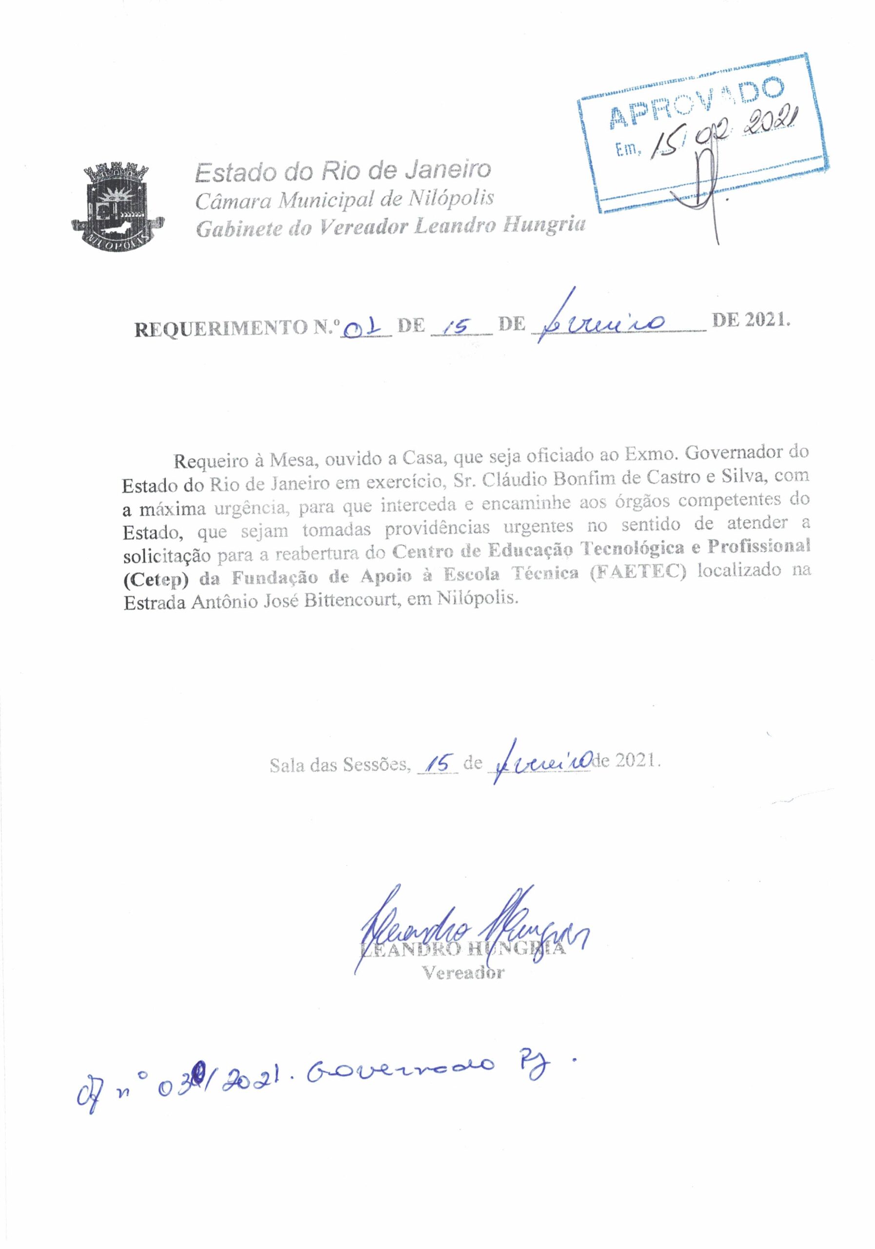 Abaixo apresentamos alguns dos Requerimentos apresentados pelo vereador Leandro Hungria desde o seu primeiro mandato. O arquivo com todos os Requerimentos pode ser encontrado na Câmara Municipal de Nilópolis.