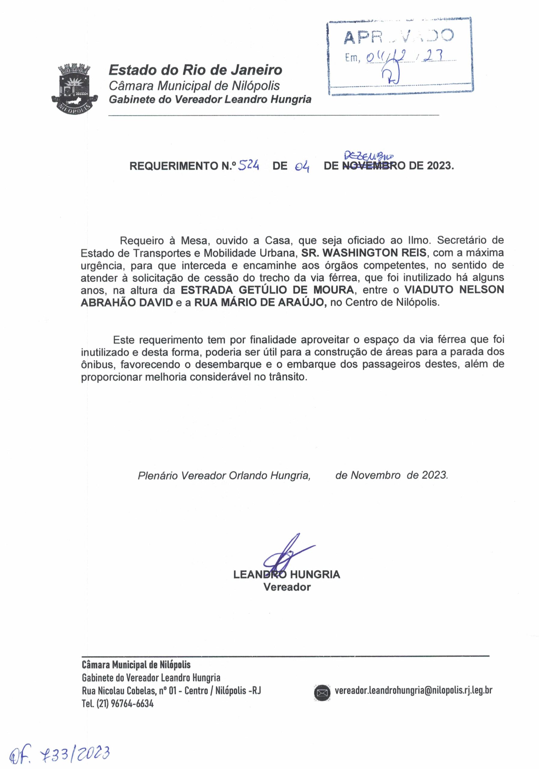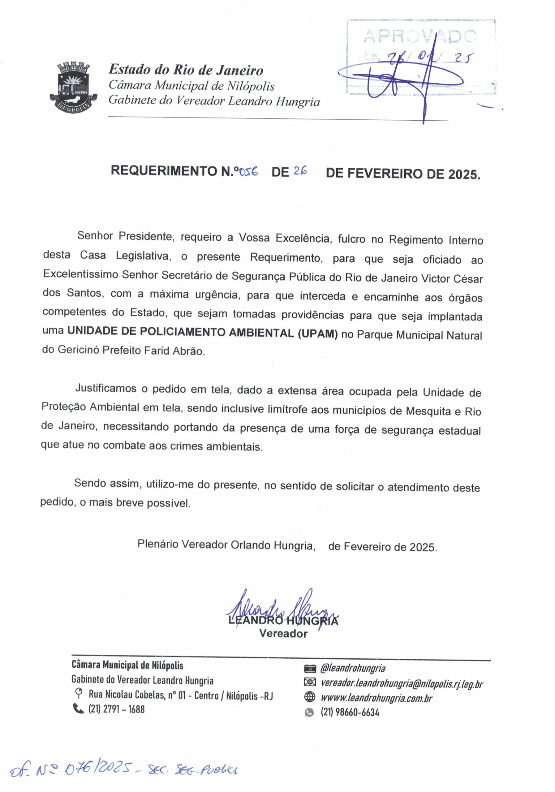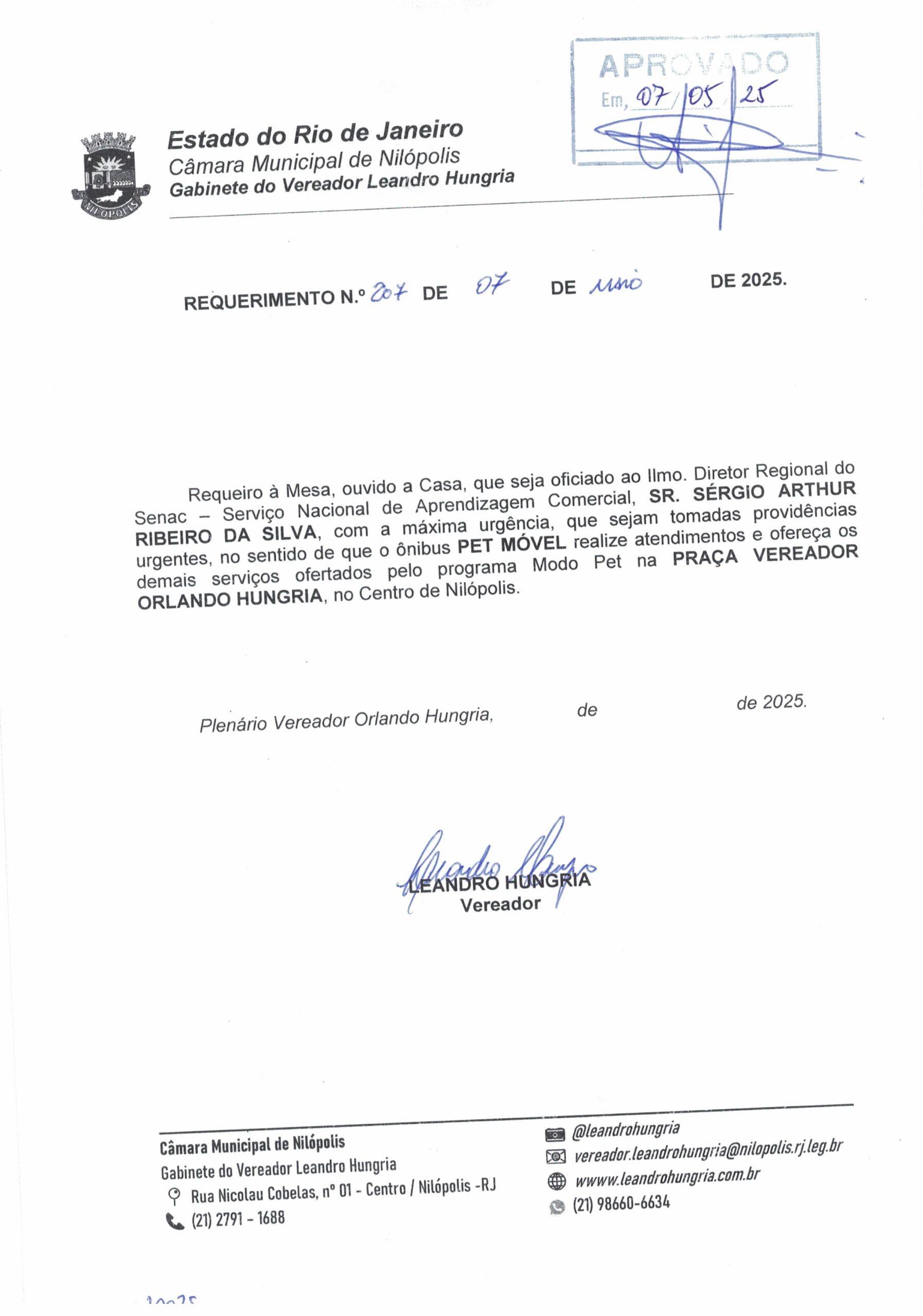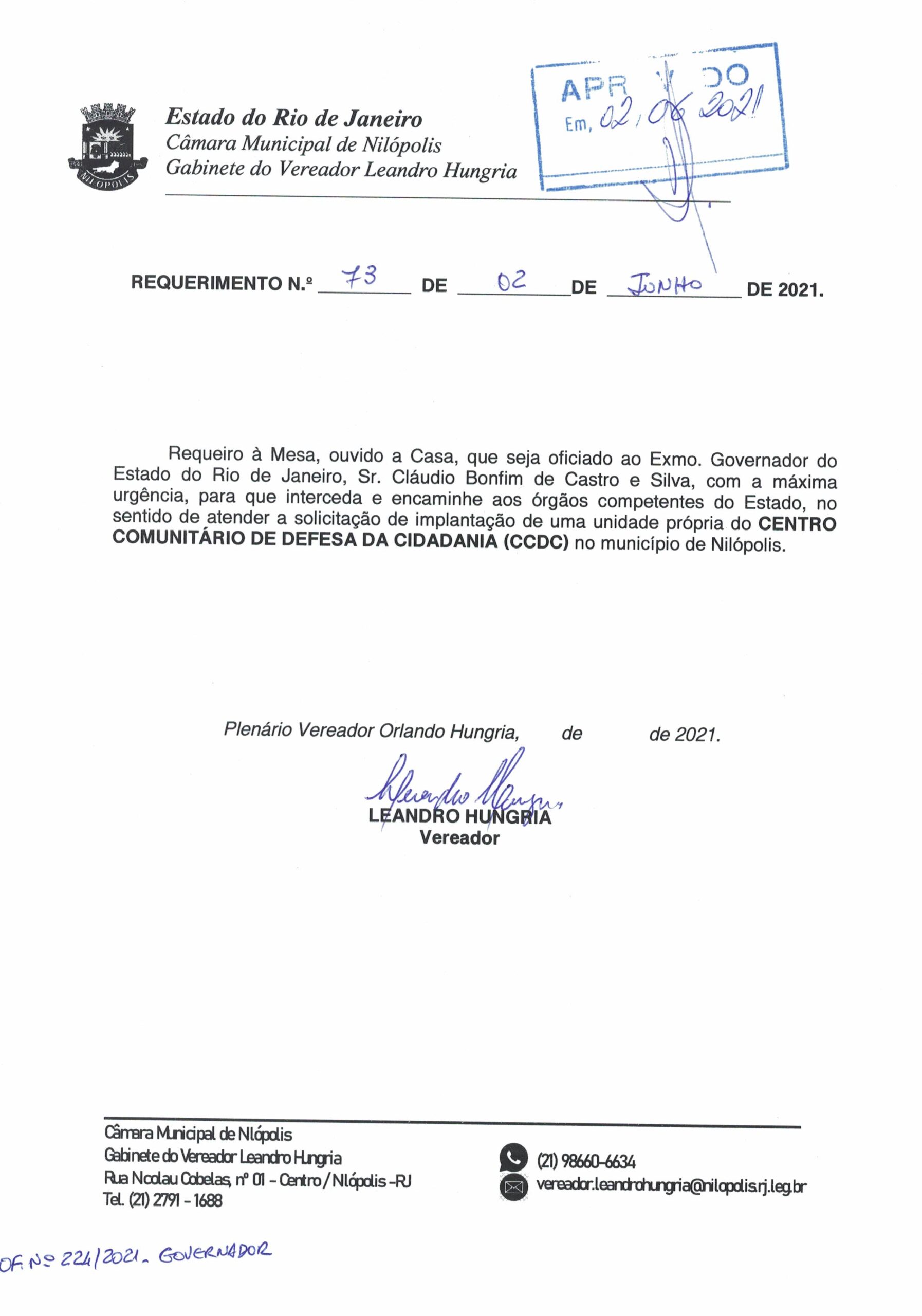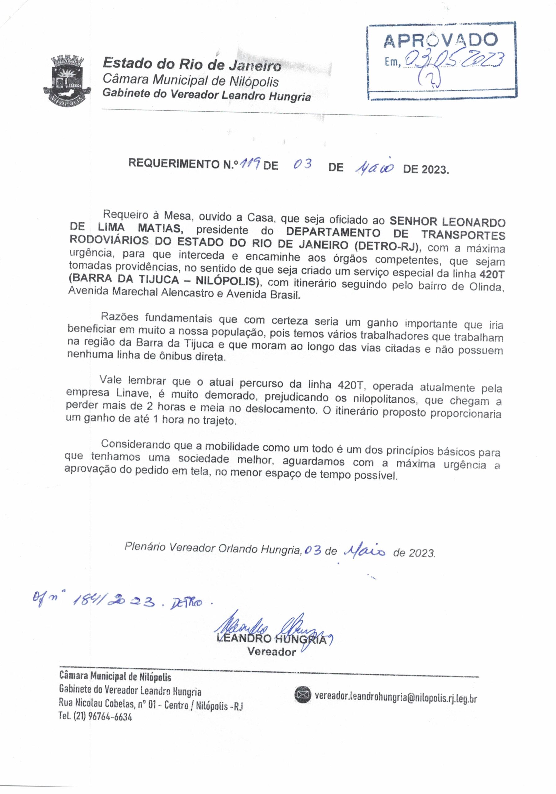 Abaixo apresentamos alguns dos Requerimentos apresentados pelo vereador Leandro Hungria desde o seu primeiro mandato. O arquivo com todos os Requerimentos pode ser encontrado na Câmara Municipal de Nilópolis.