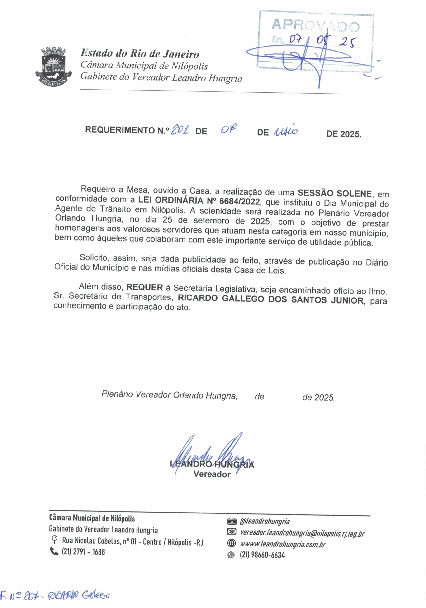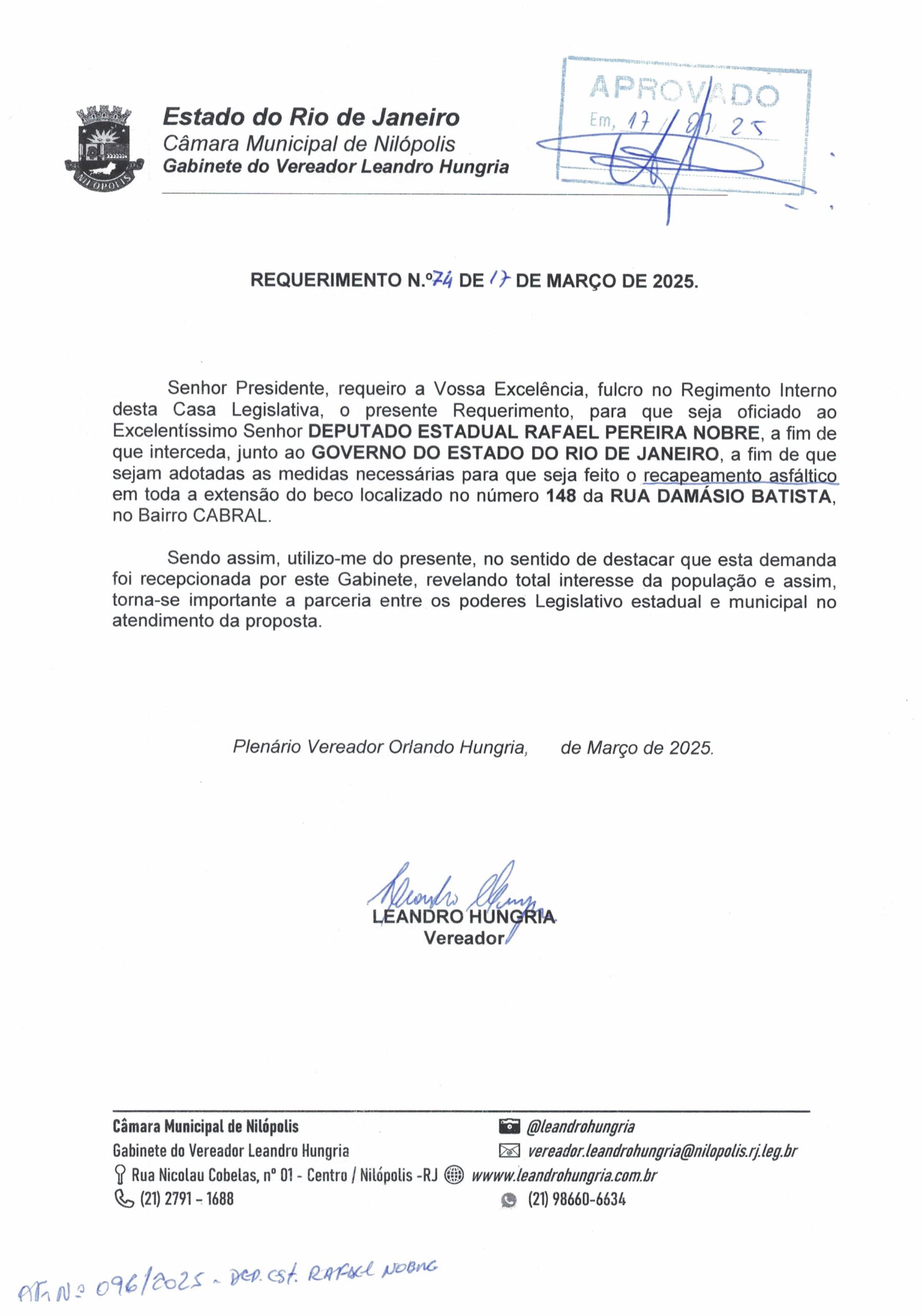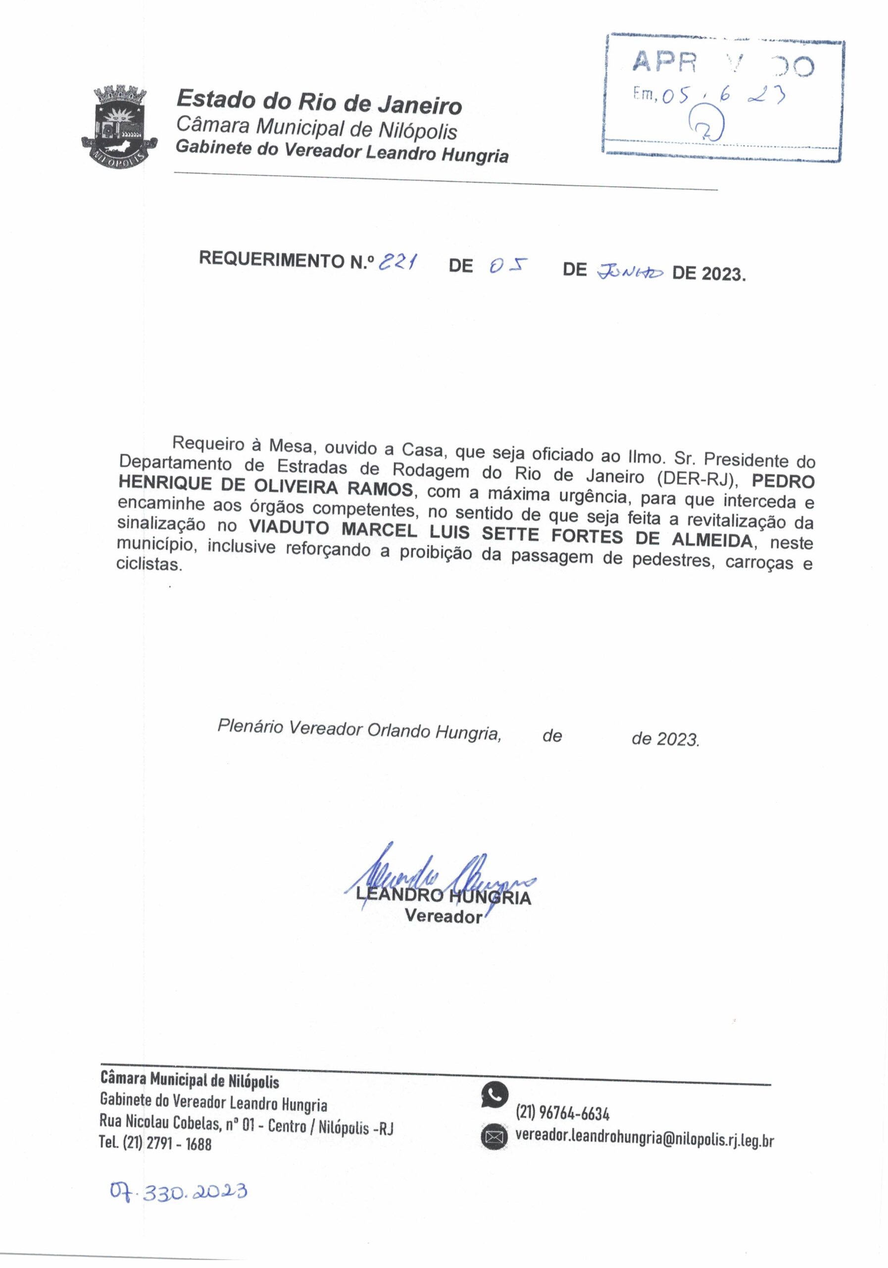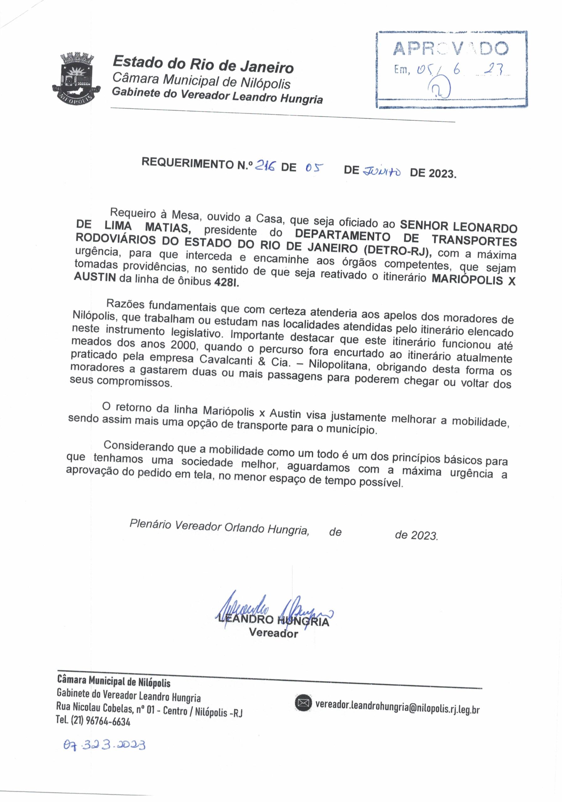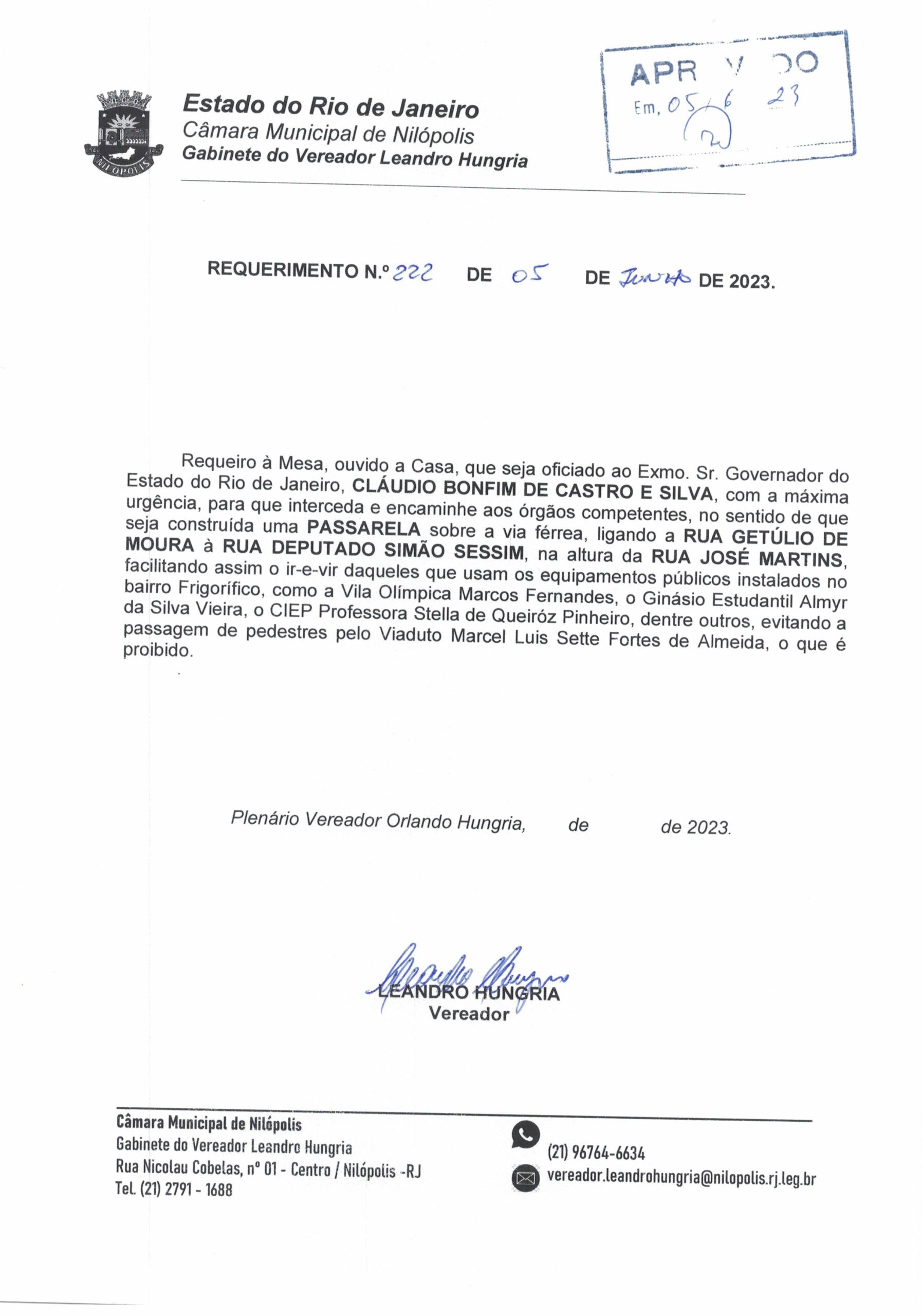Abaixo apresentamos alguns dos Requerimentos apresentados pelo vereador Leandro Hungria desde o seu primeiro mandato. O arquivo com todos os Requerimentos pode ser encontrado na Câmara Municipal de Nilópolis.