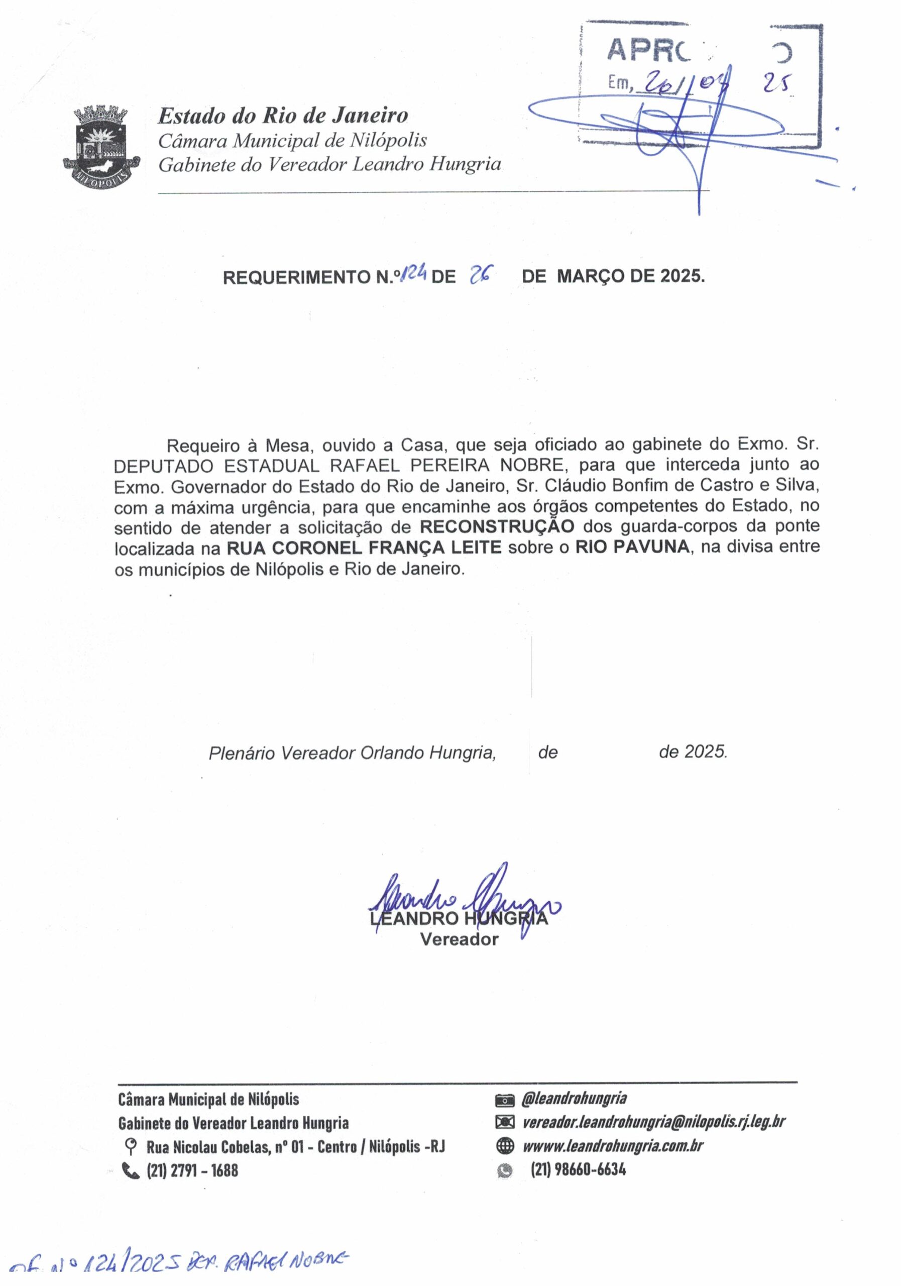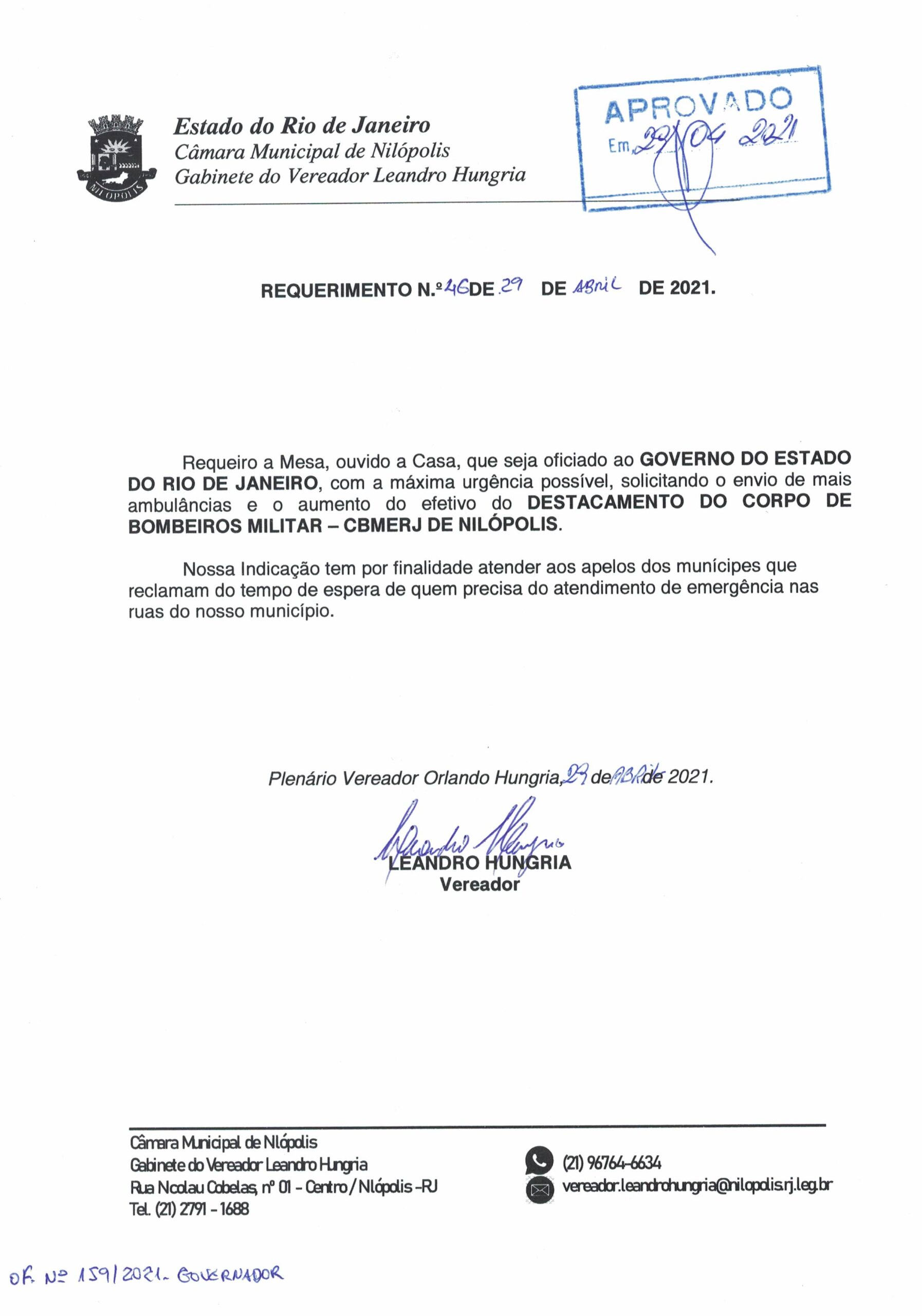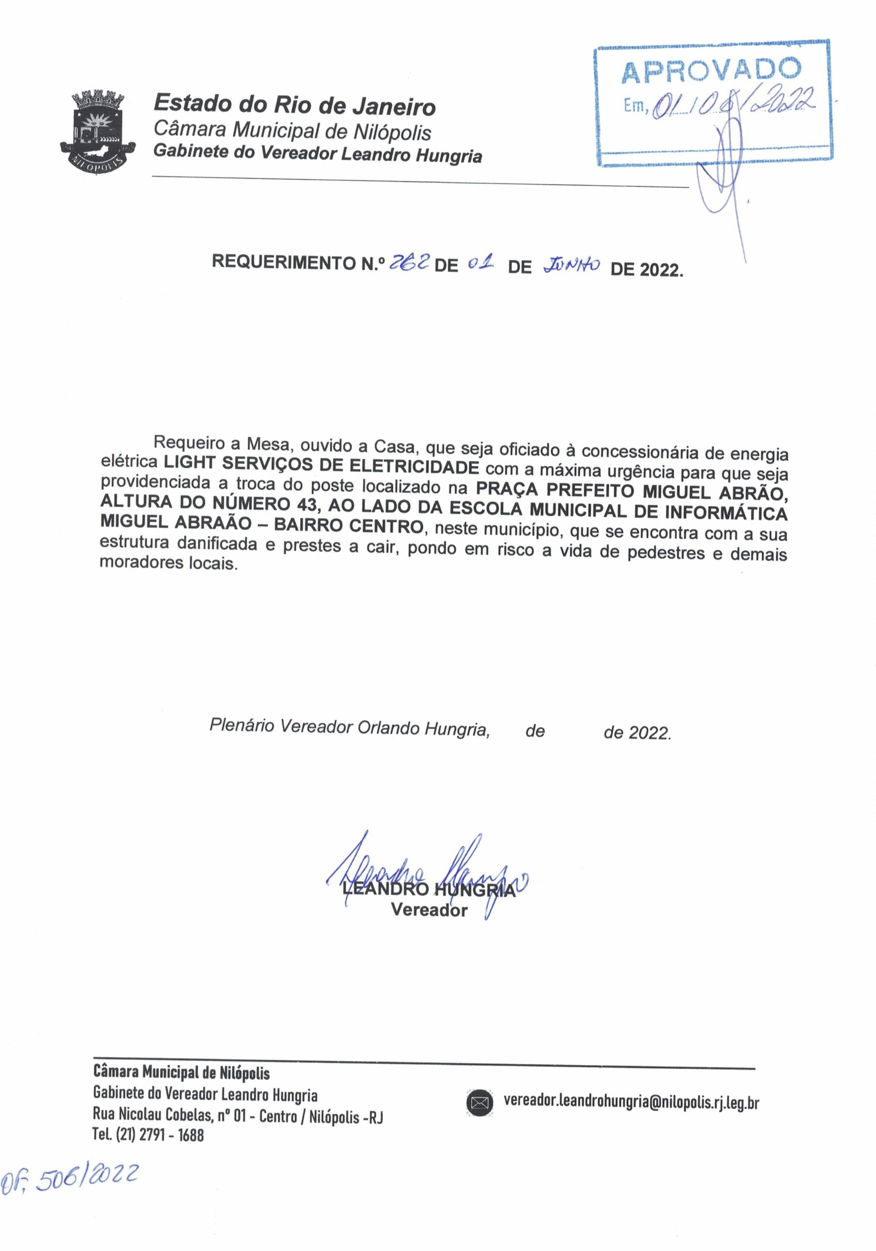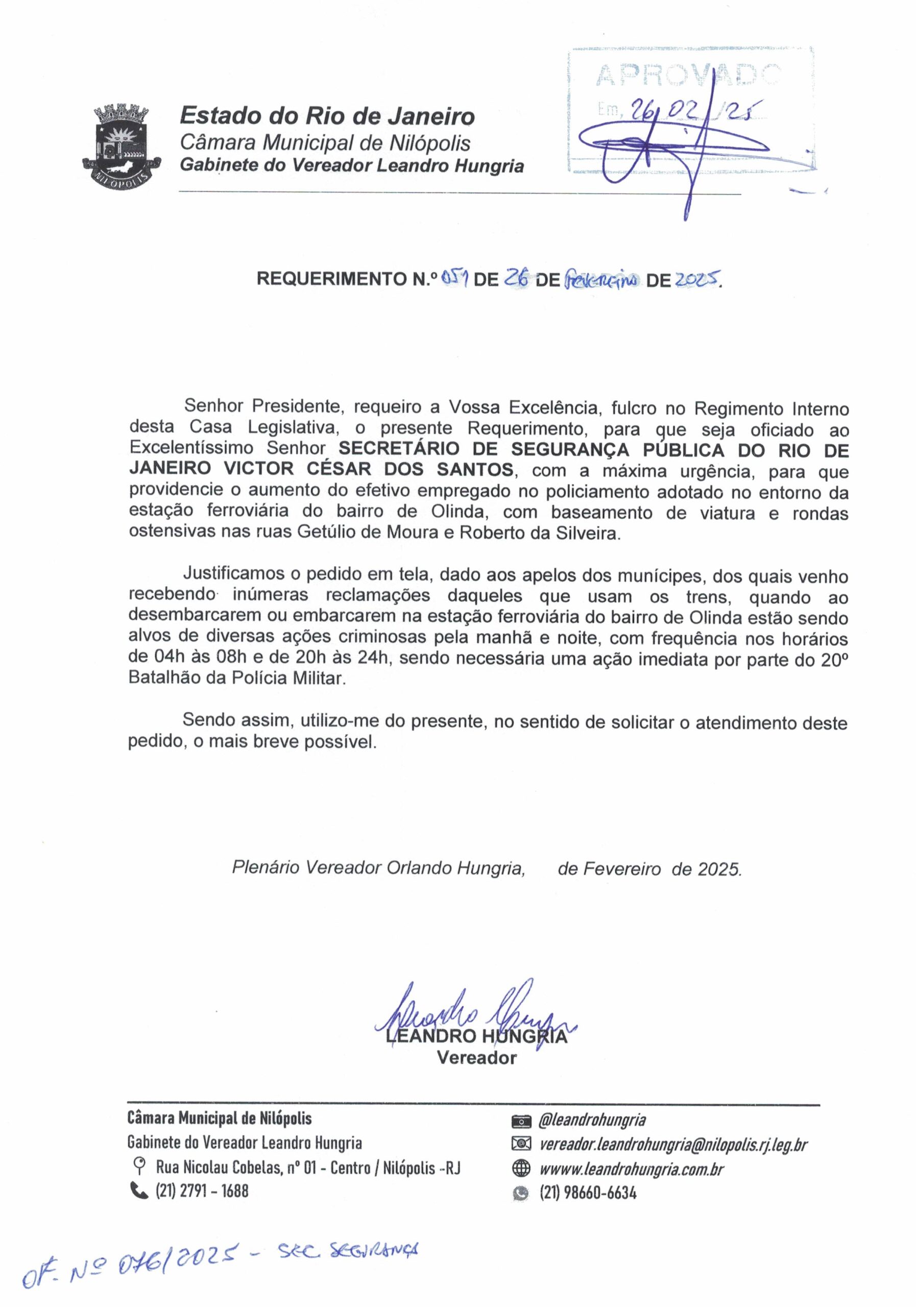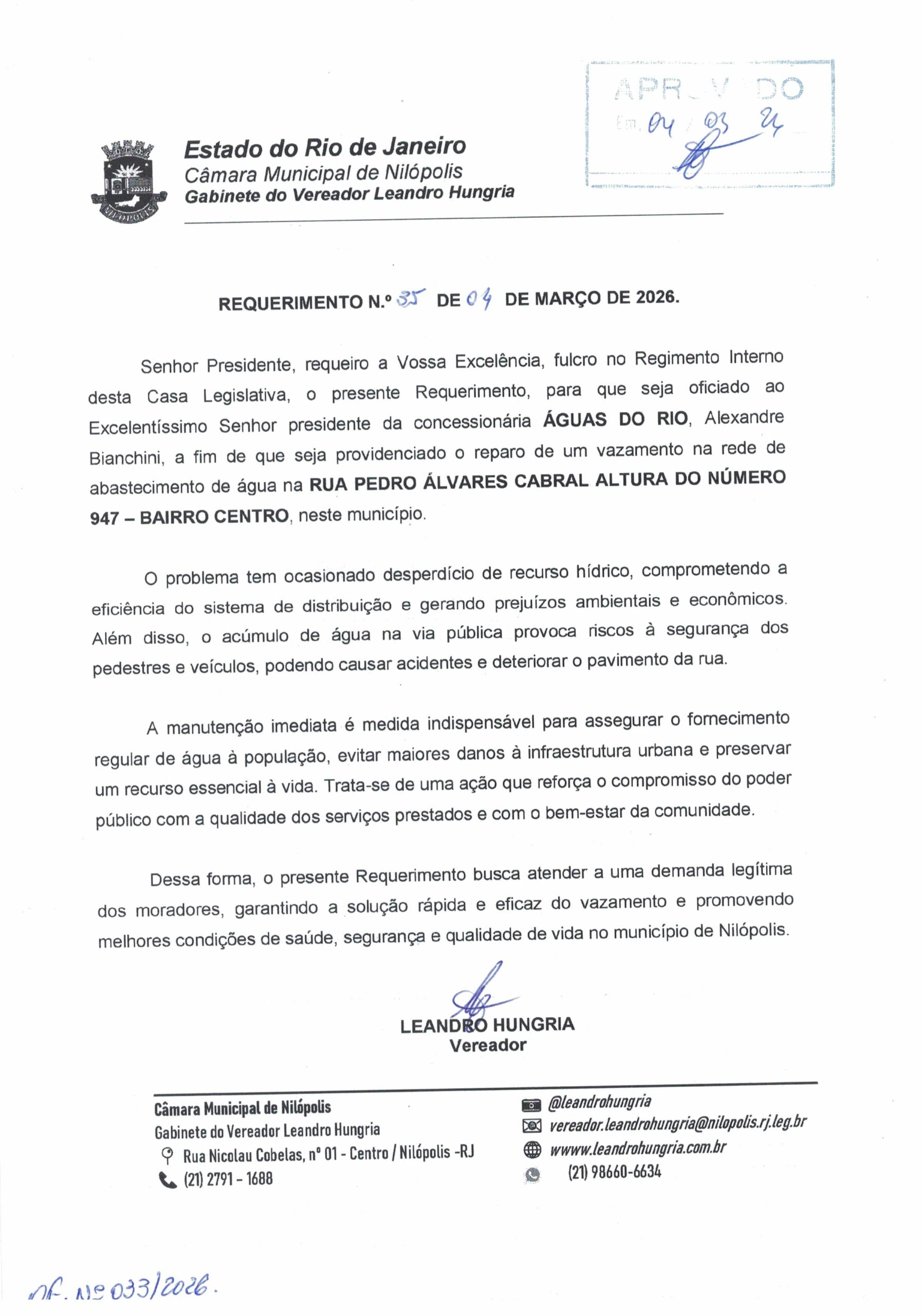 Abaixo apresentamos alguns dos Requerimentos apresentados pelo vereador Leandro Hungria desde o seu primeiro mandato. O arquivo com todos os Requerimentos pode ser encontrado na Câmara Municipal de Nilópolis.