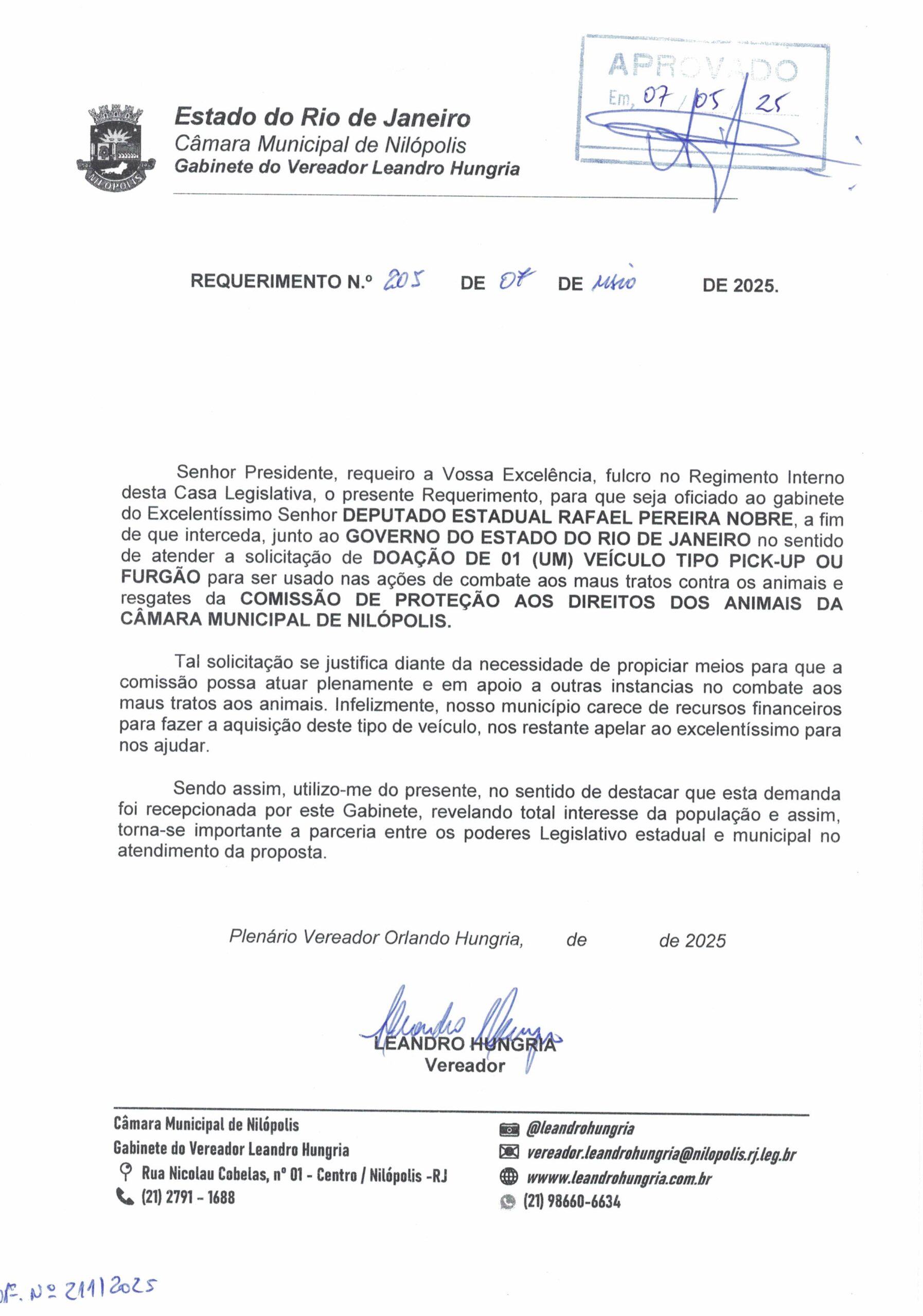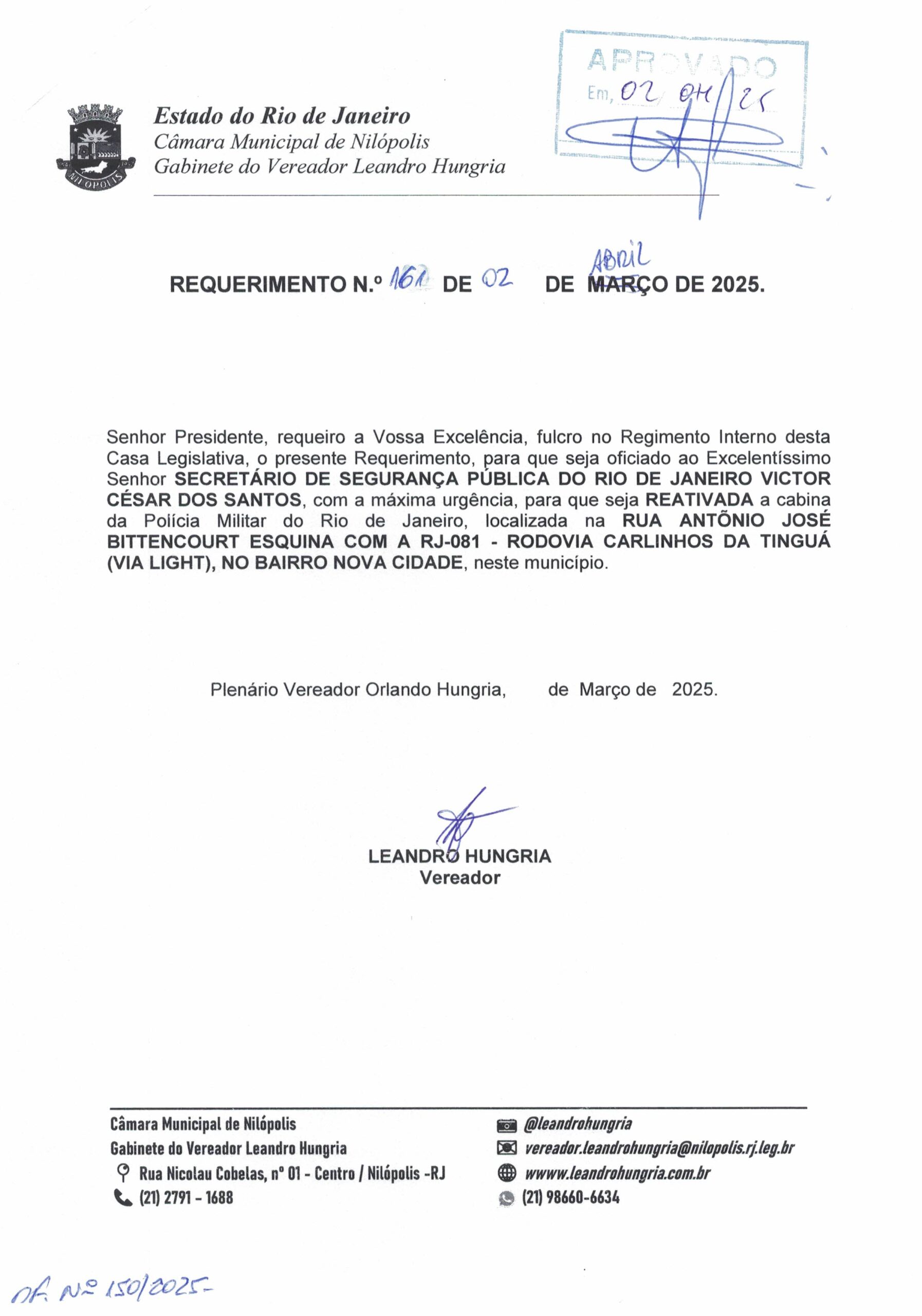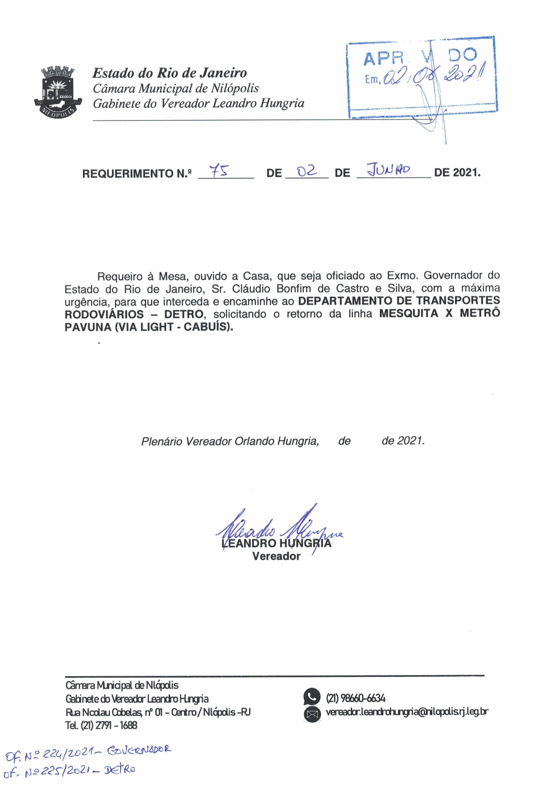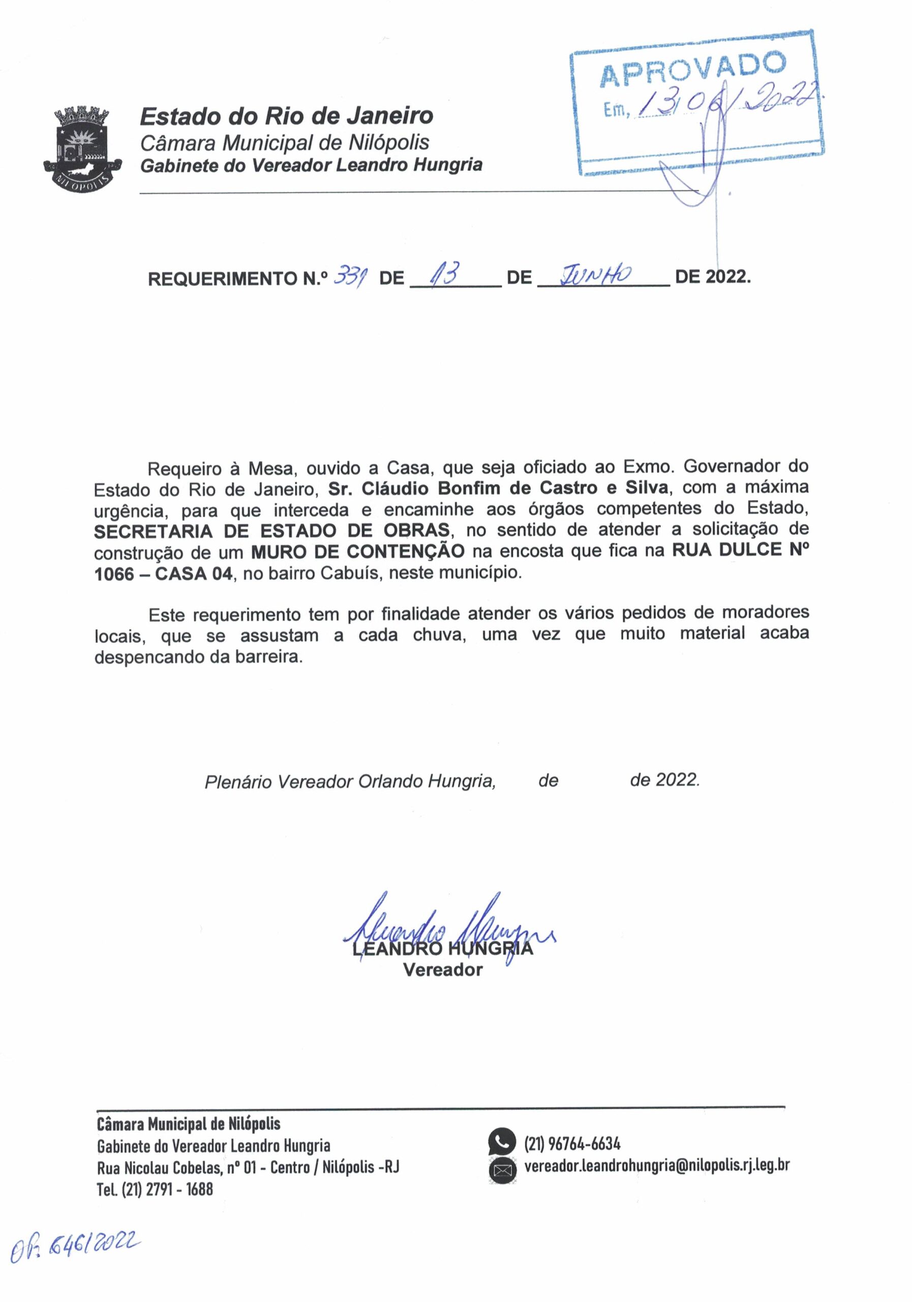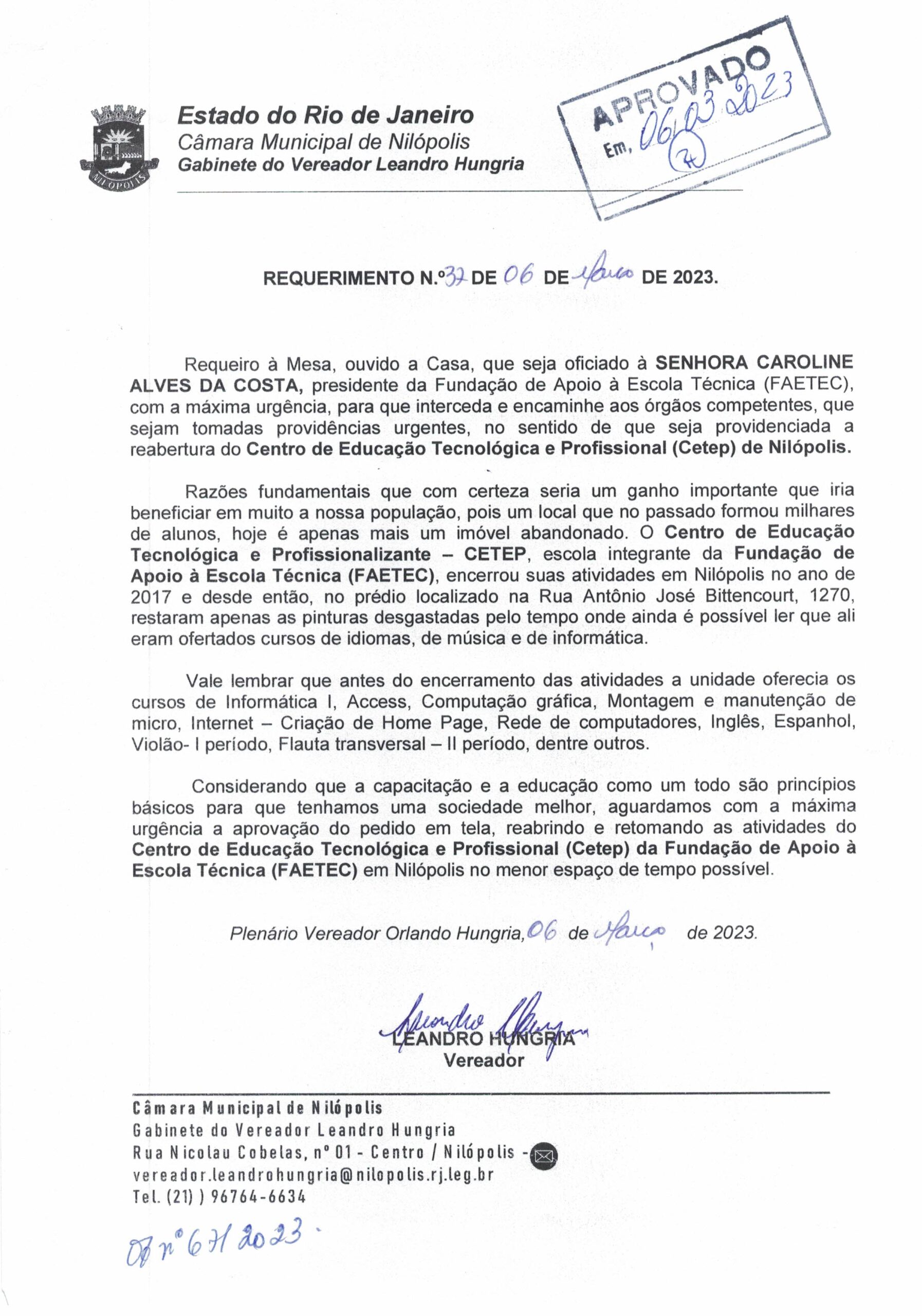 Abaixo apresentamos alguns dos Requerimentos apresentados pelo vereador Leandro Hungria desde o seu primeiro mandato. O arquivo com todos os Requerimentos pode ser encontrado na Câmara Municipal de Nilópolis.