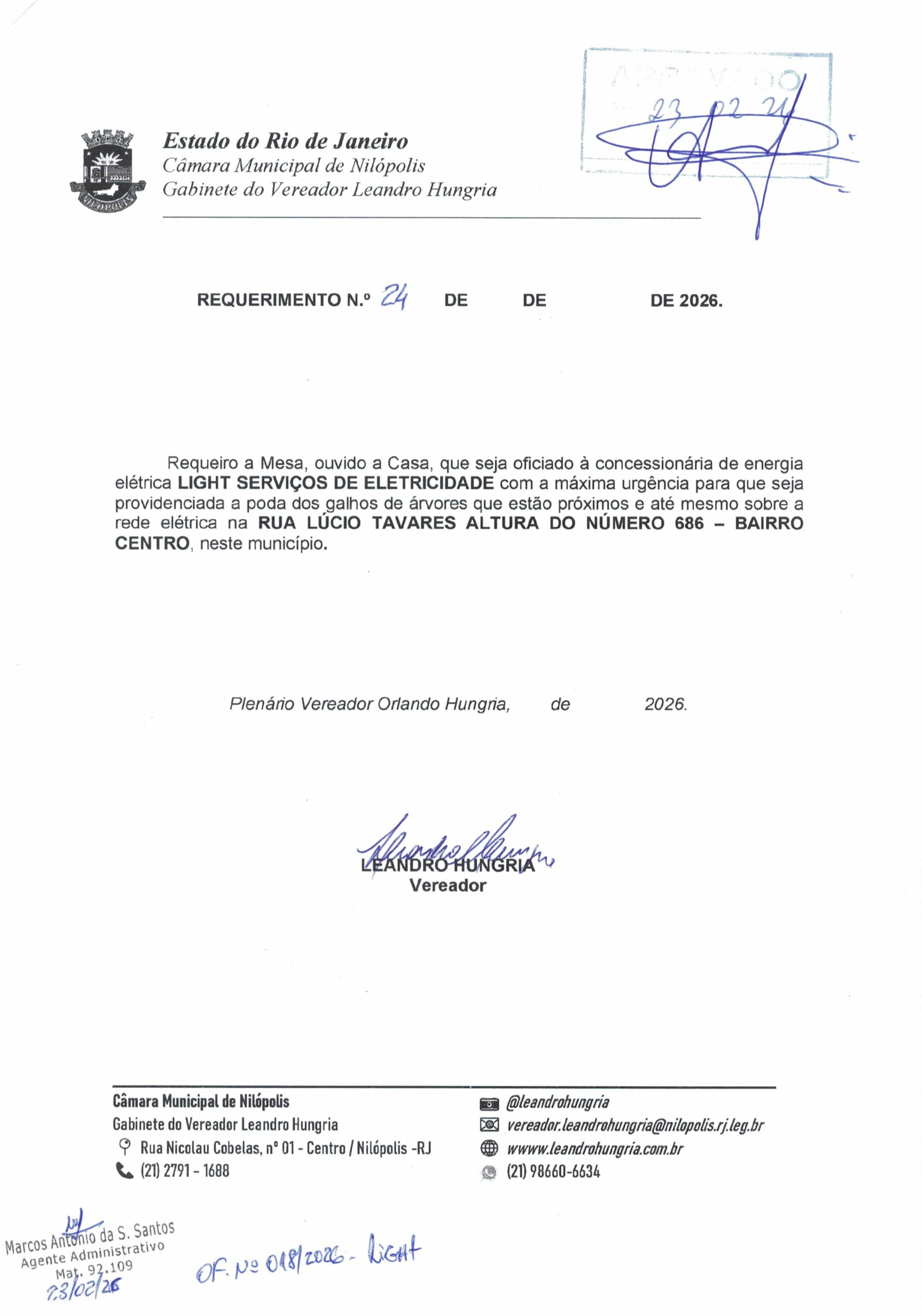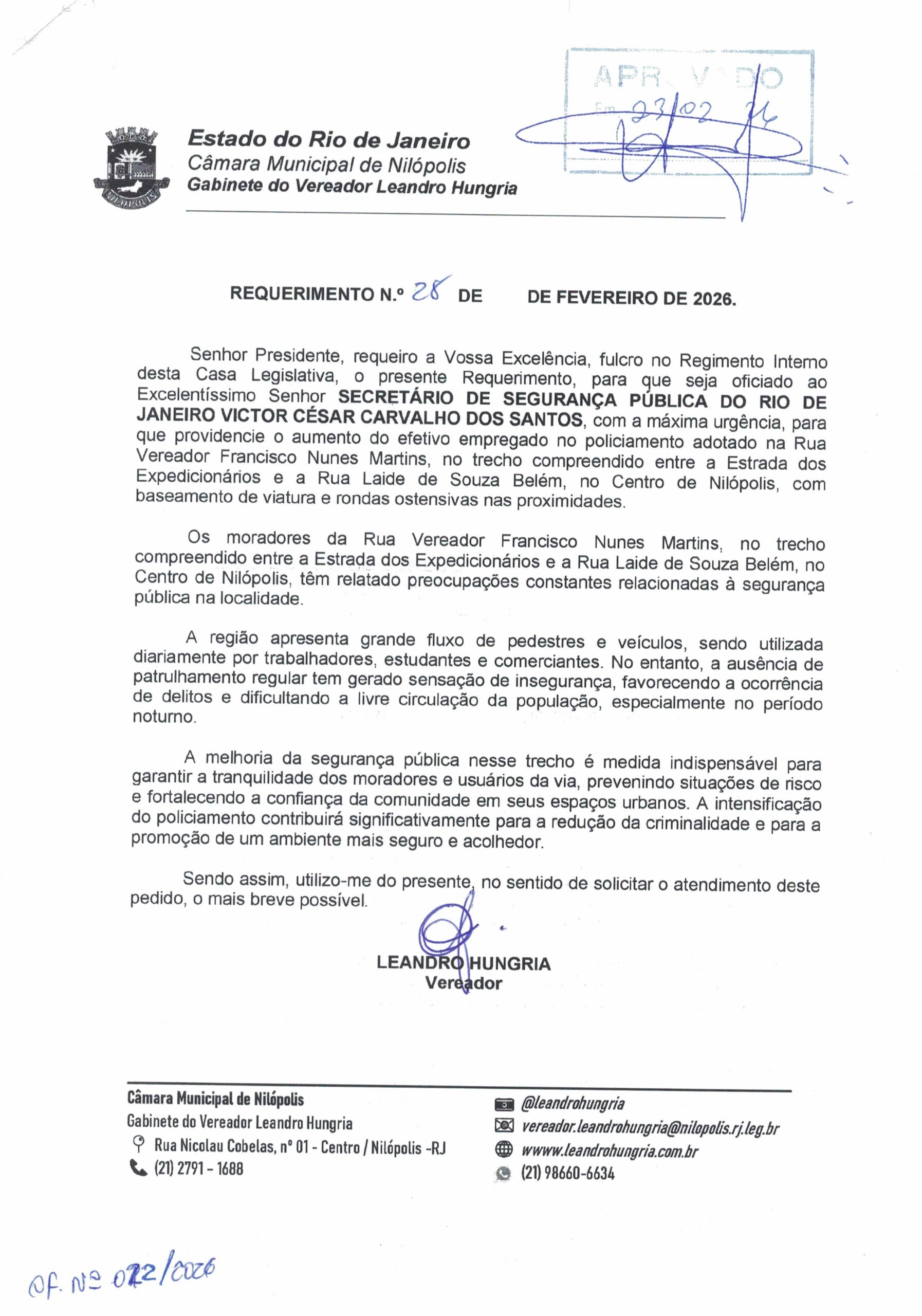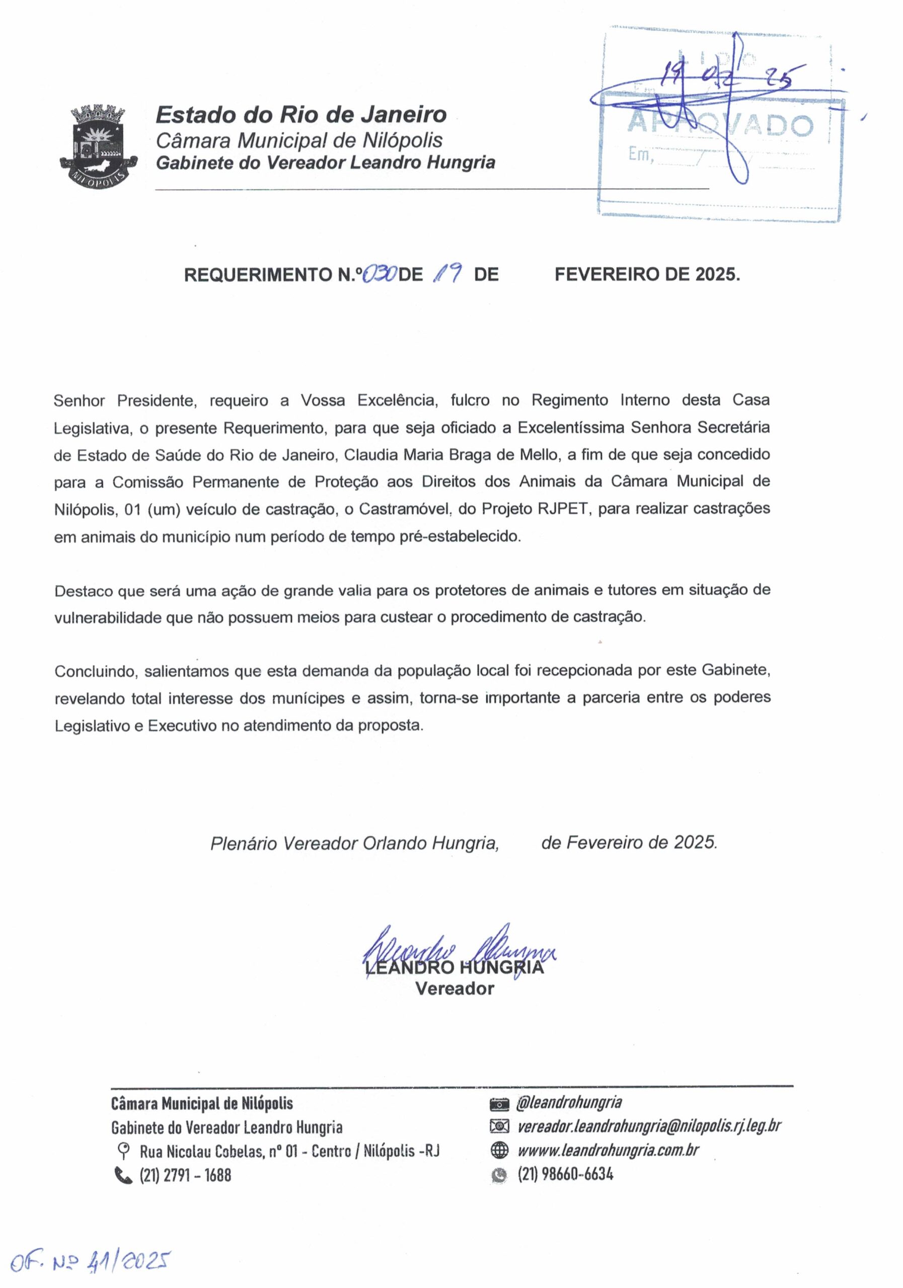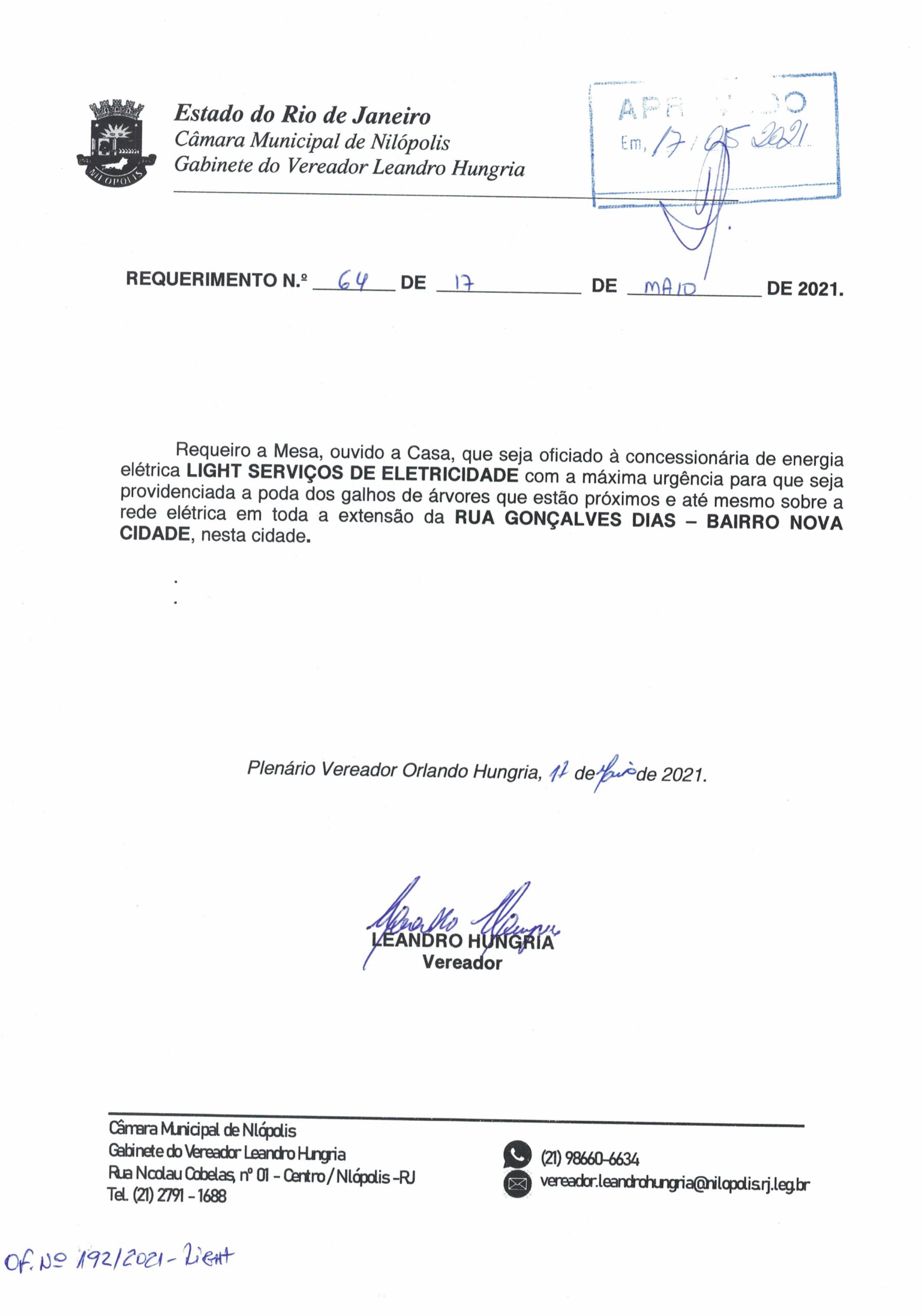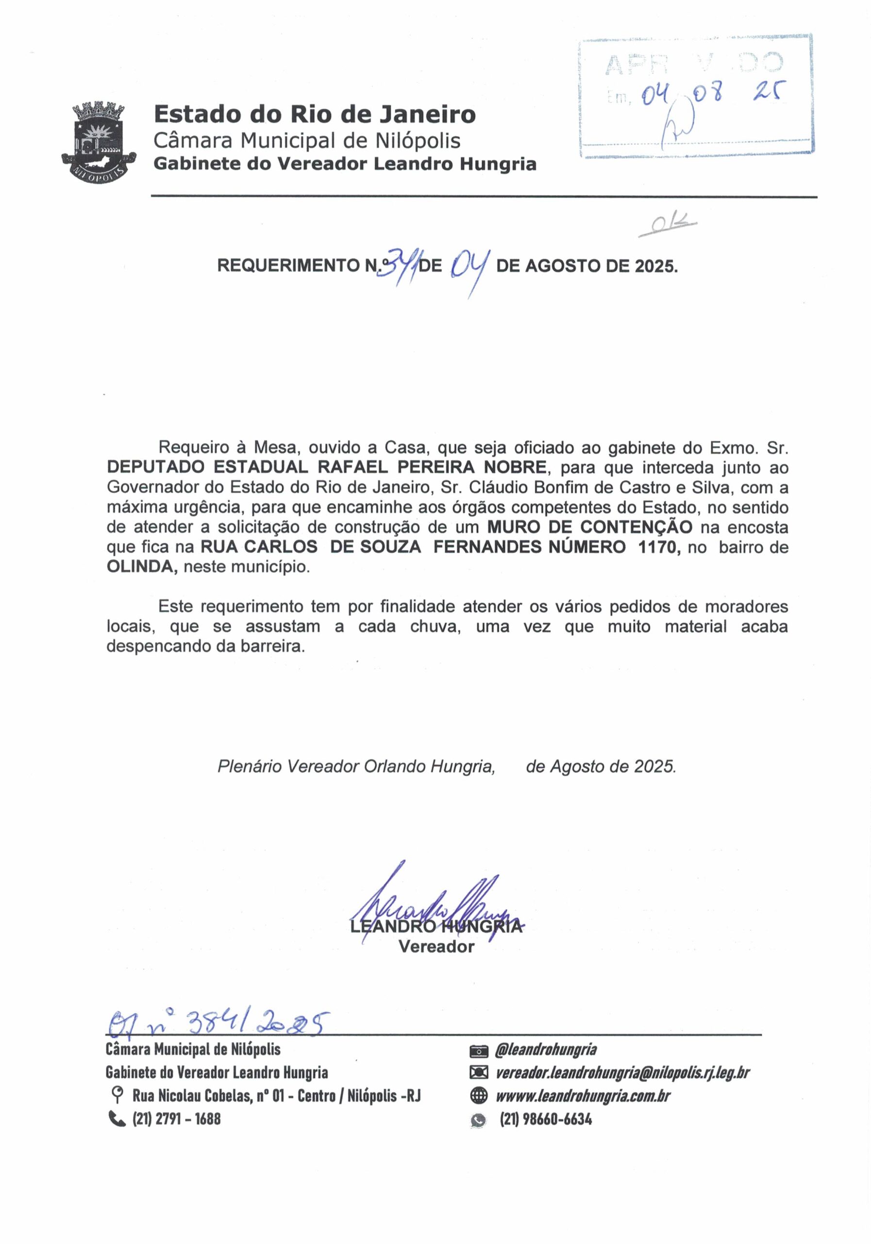 Abaixo apresentamos alguns dos Requerimentos apresentados pelo vereador Leandro Hungria desde o seu primeiro mandato. O arquivo com todos os Requerimentos pode ser encontrado na Câmara Municipal de Nilópolis.