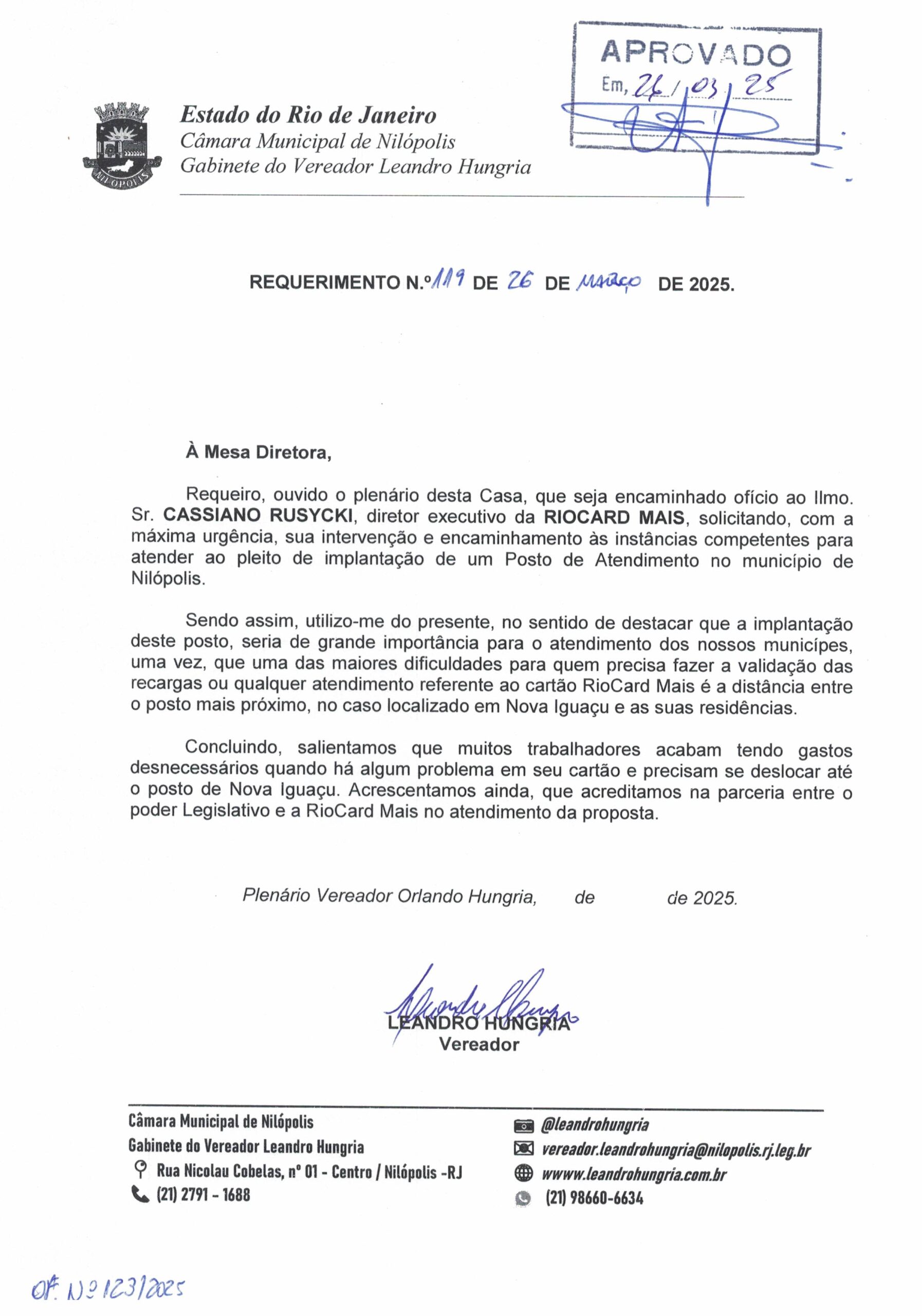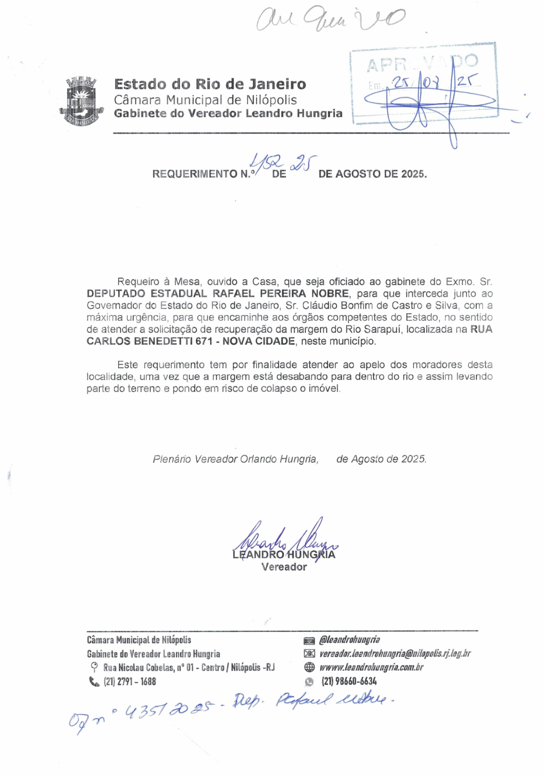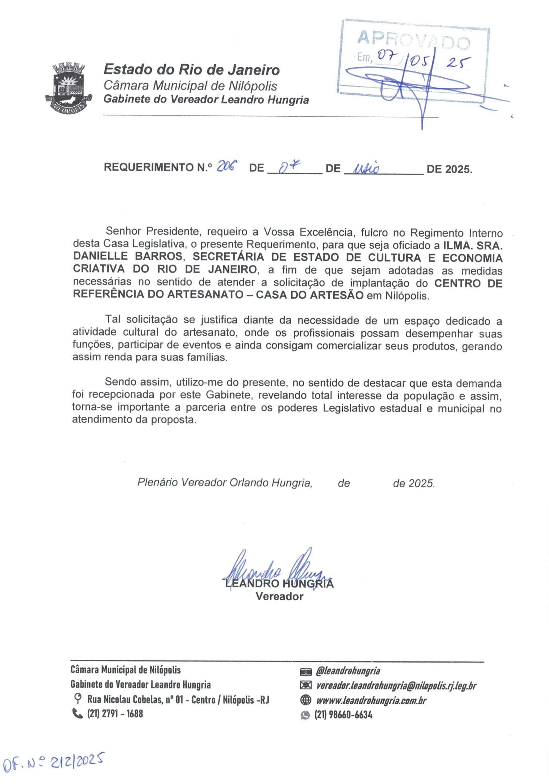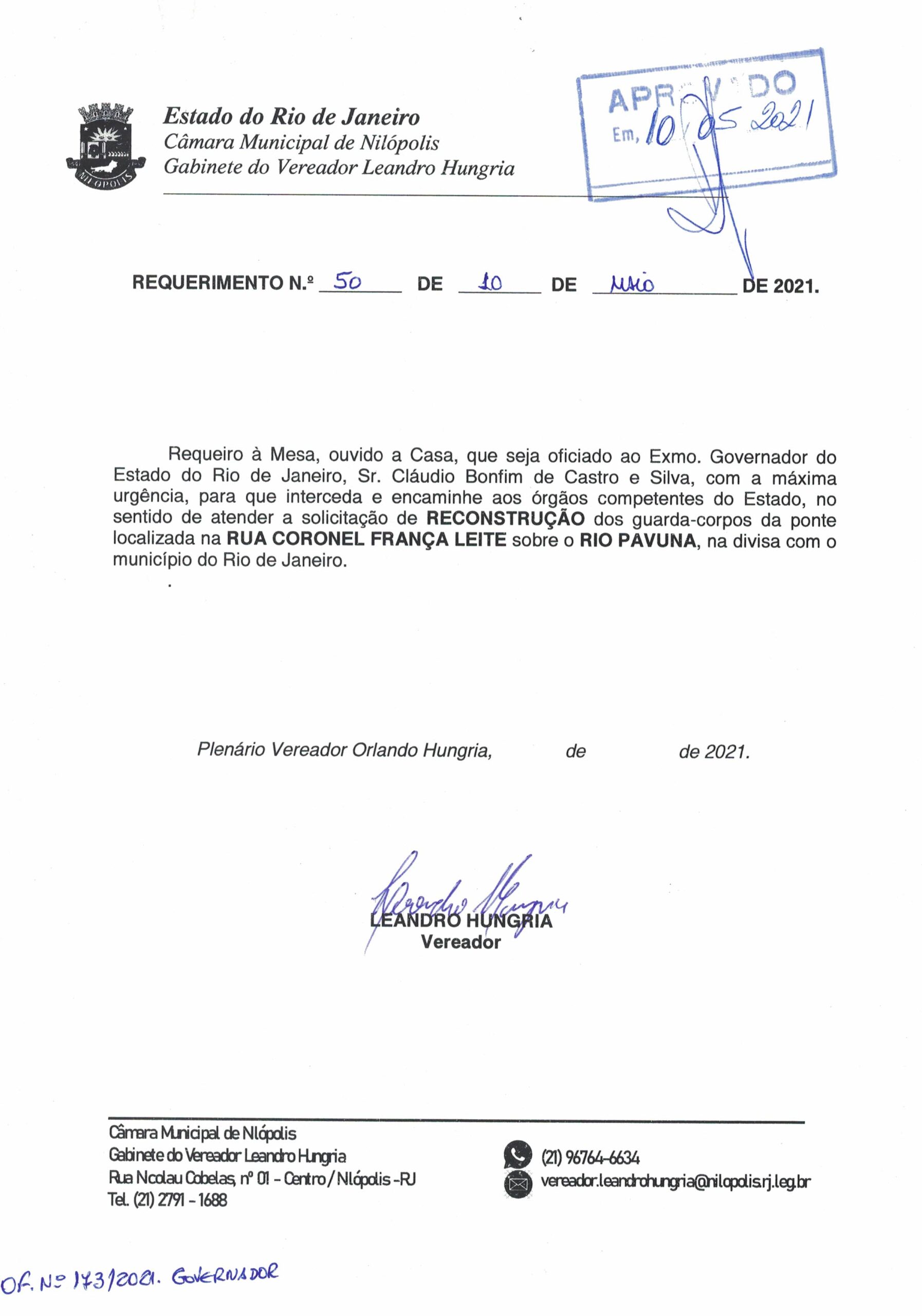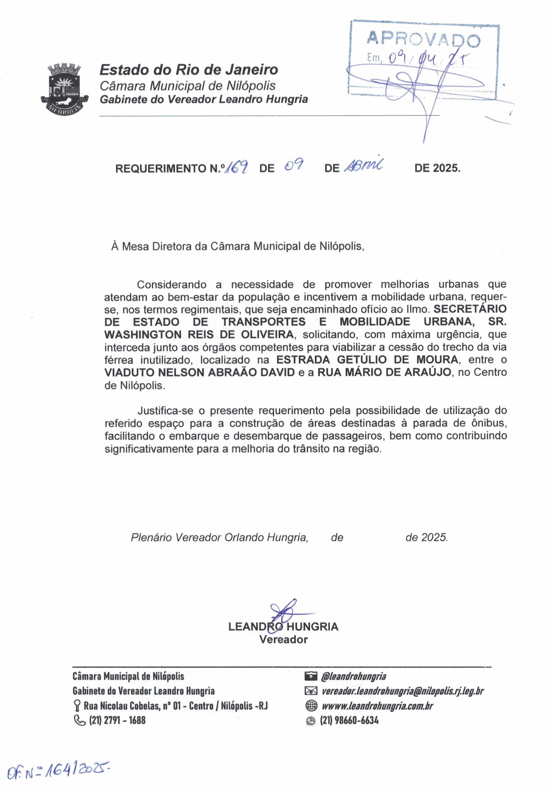 Abaixo apresentamos alguns dos Requerimentos apresentados pelo vereador Leandro Hungria desde o seu primeiro mandato. O arquivo com todos os Requerimentos pode ser encontrado na Câmara Municipal de Nilópolis.