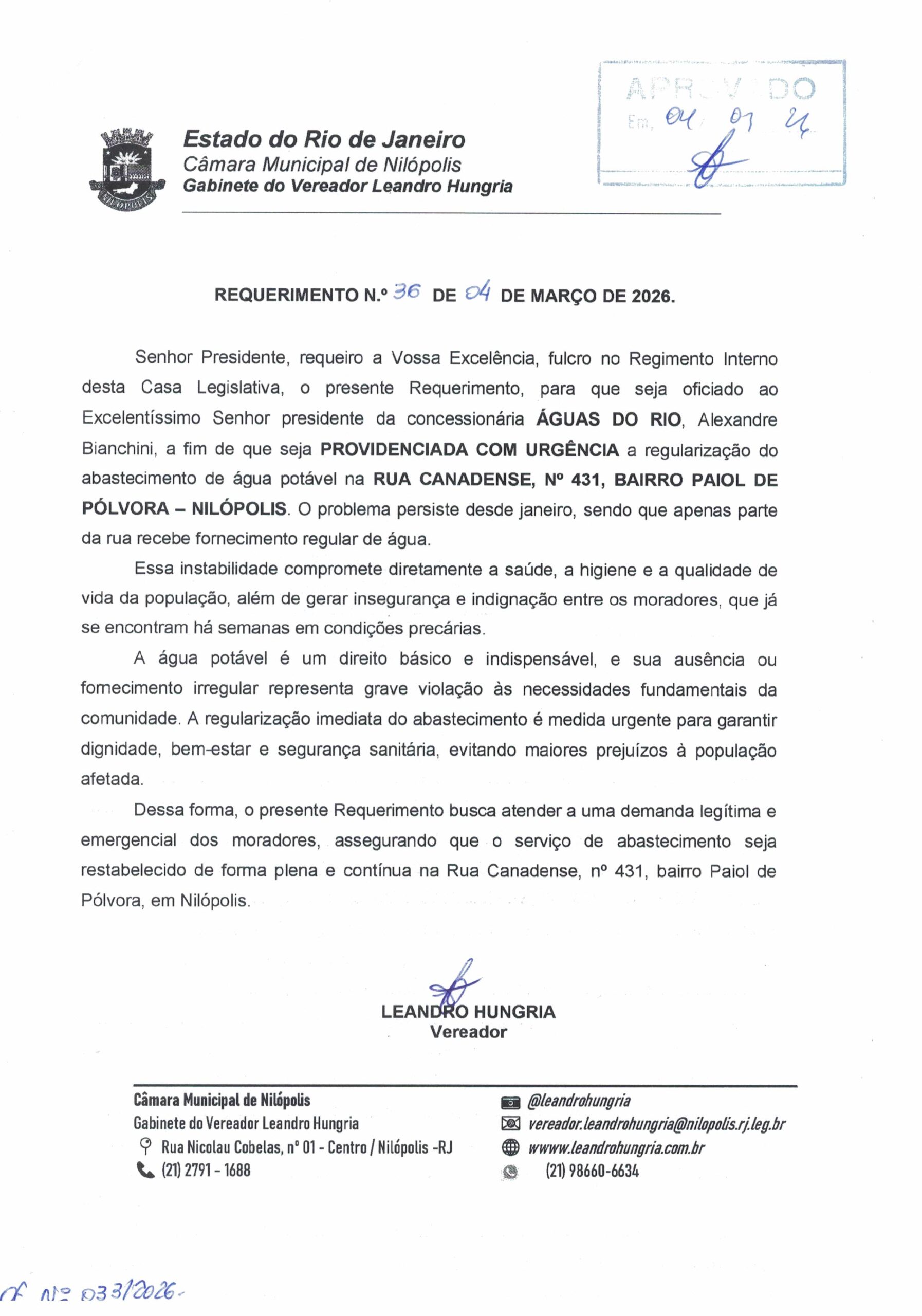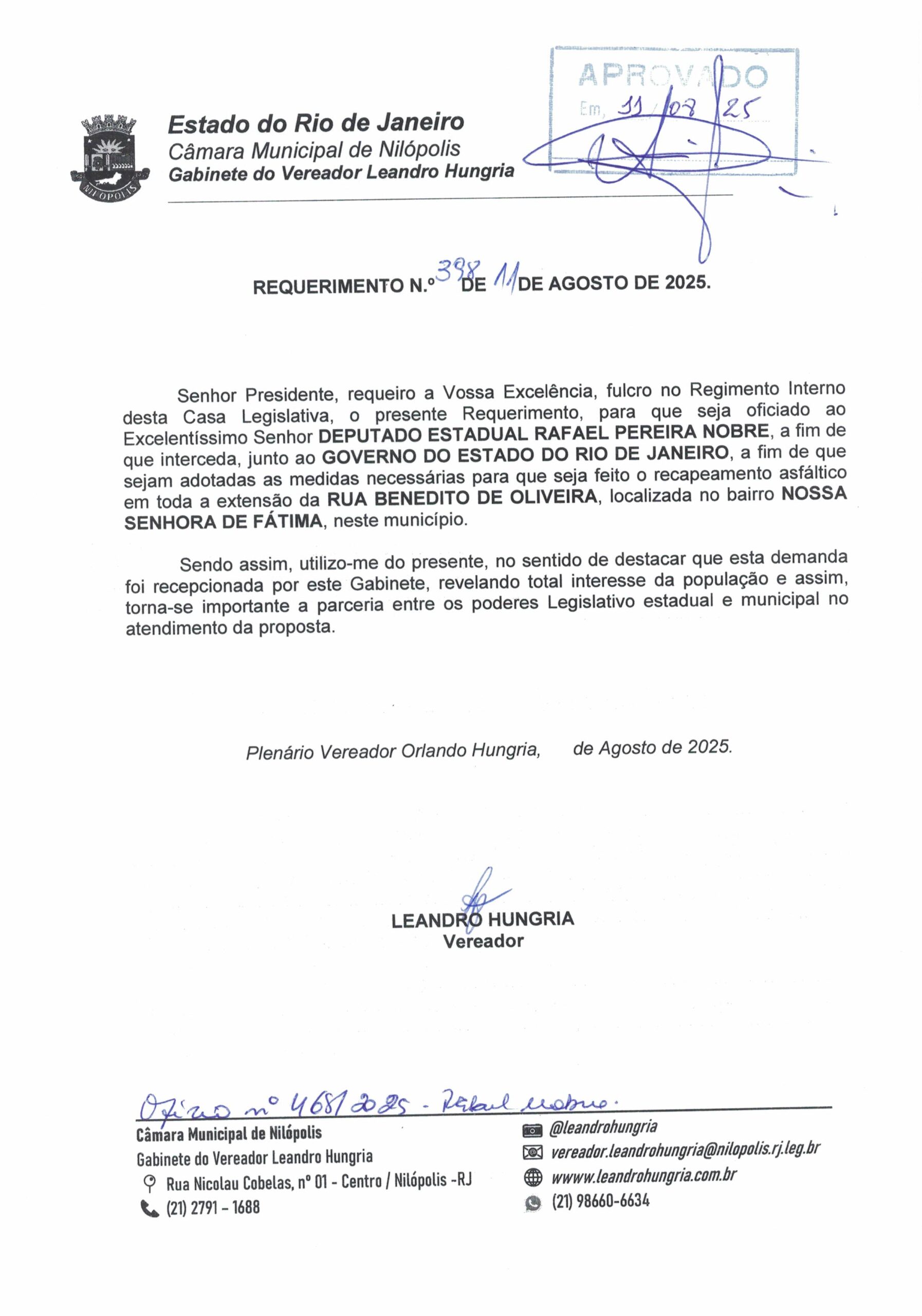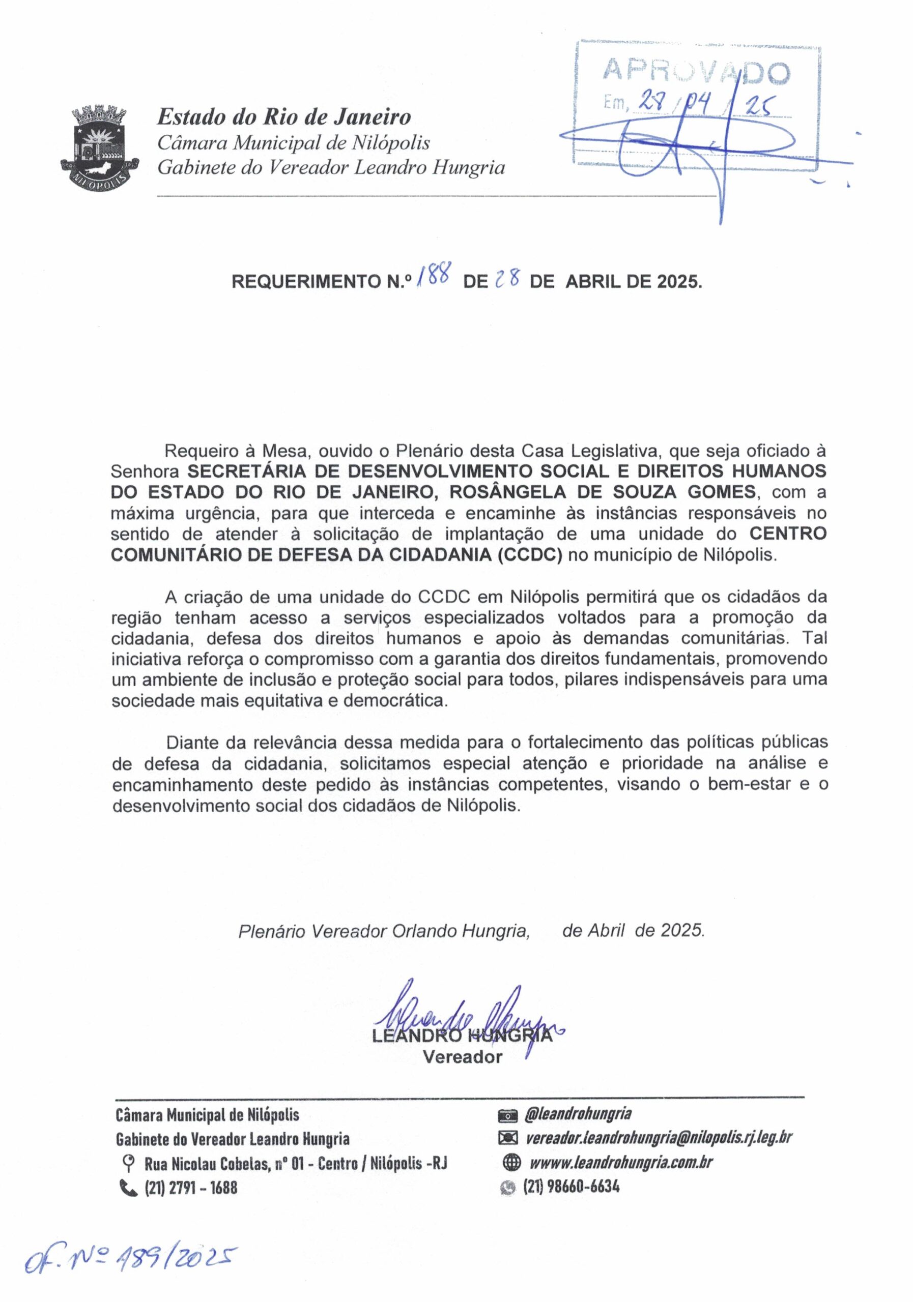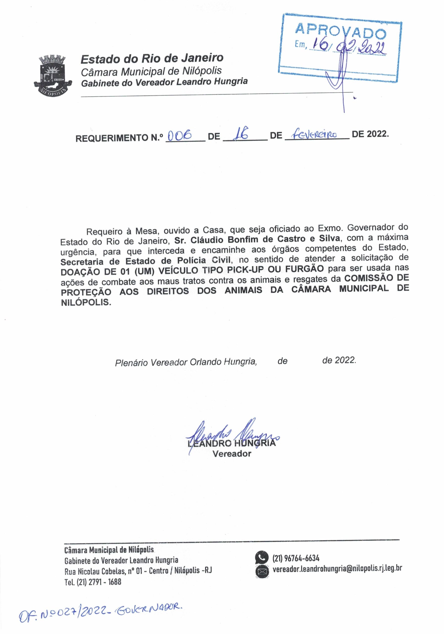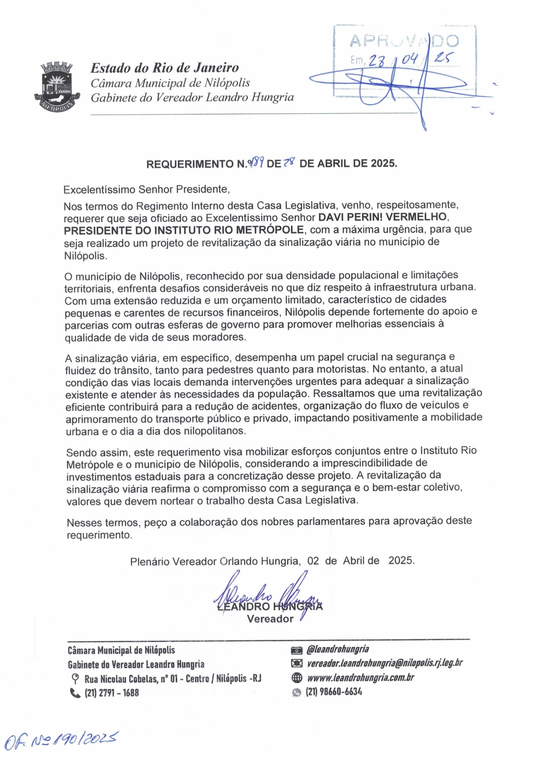 Abaixo apresentamos alguns dos Requerimentos apresentados pelo vereador Leandro Hungria desde o seu primeiro mandato. O arquivo com todos os Requerimentos pode ser encontrado na Câmara Municipal de Nilópolis.