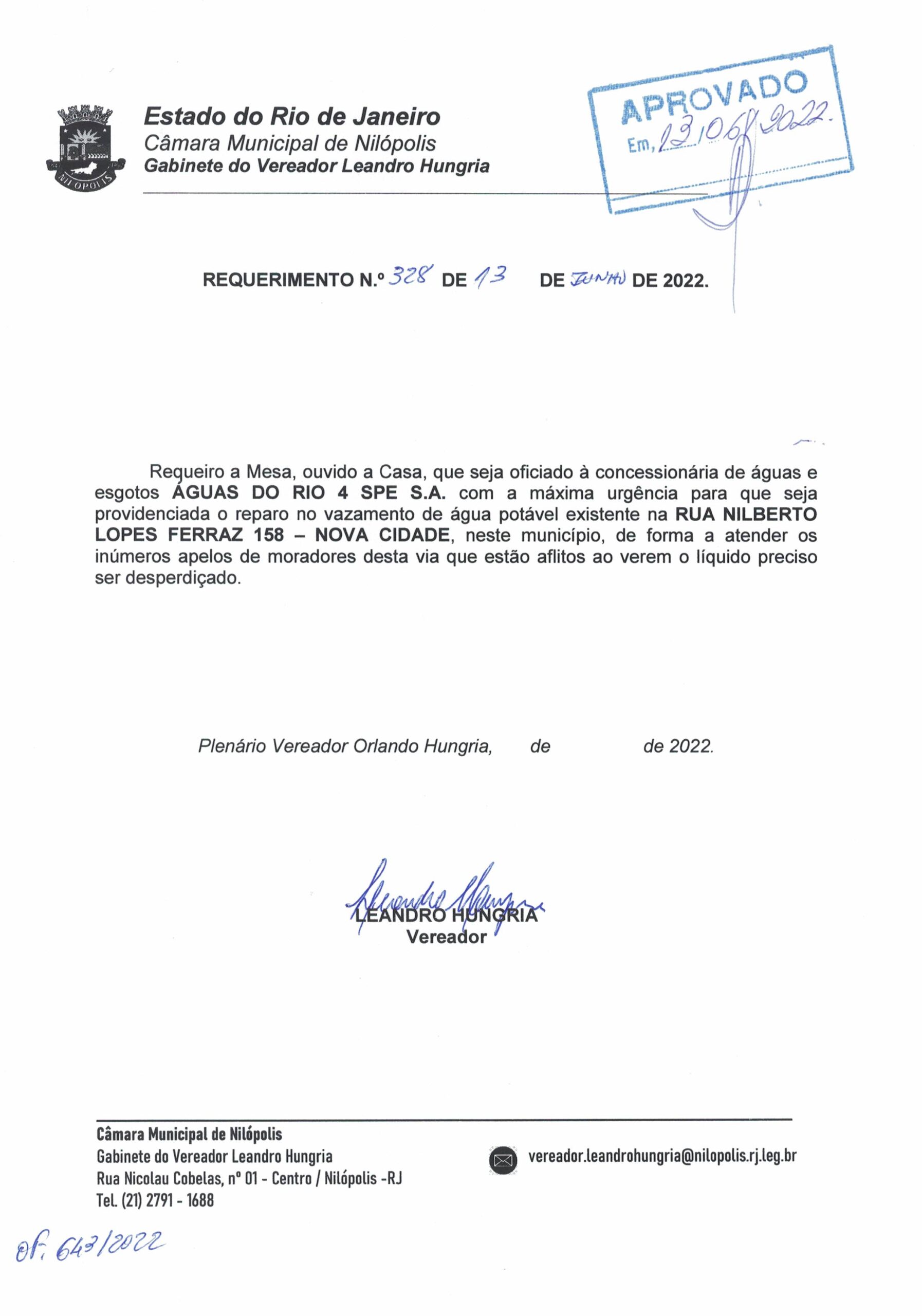 - 328 – VAZAMENTO ÁGUA NILBERTO LOPES FERRAZ