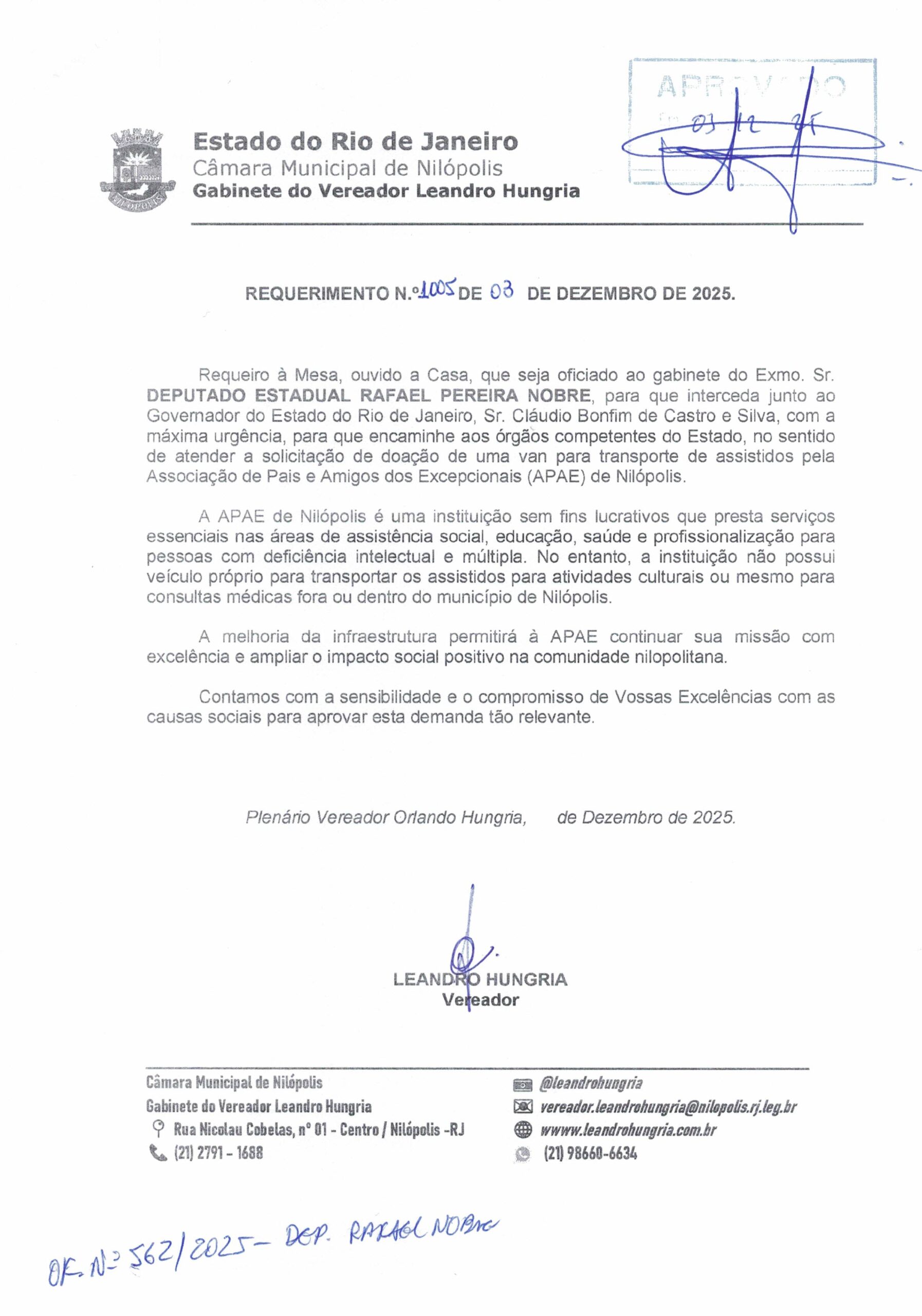 - 1005 – DOAÇÃO DE VAN PARA A APAE NILÓPOLIS