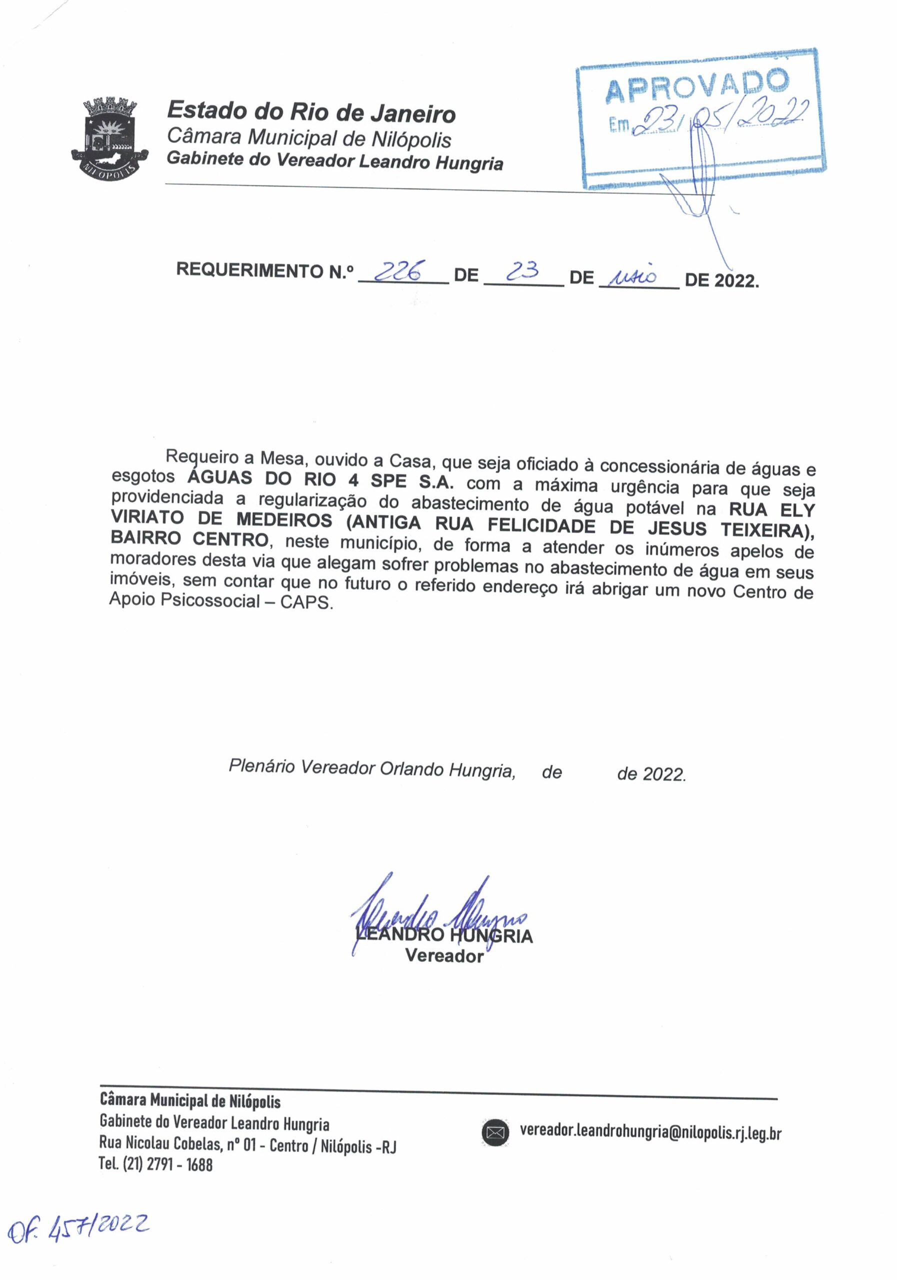 - 226 – REGULARIZAÇÃO ABASTECIMENTO FELICIDADE JESUS