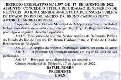 Abaixo apresentamos os títulos de Cidadão Benemérito concedidos pelo vereador Leandro Hungria desde o seu primeiro mandato.