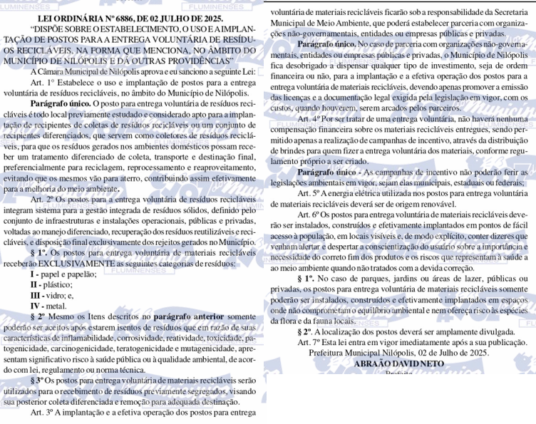 O vereador Leandro Hungria comemora mais uma conquista legislativa com a sanção da Lei Ordinária nº 6.886/2025, originada do Projeto de Lei nº 74/2025, de sua autoria. A nova legislação, sancionada pelo prefeito Abraão David Neto em 2 de julho de 2025, institui a criação de postos de entrega voluntária de resíduos recicláveis em diversos pontos de Nilópolis.